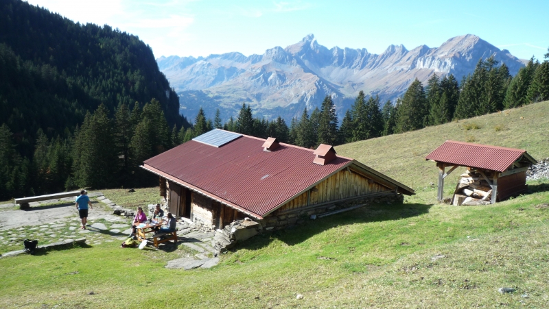 Une courte descente nous amène au refuge de Véran (ouvert sur demande auprès du CAF Sallanches) d’où une piste descend aux chalets du Meyrieu. Un peu plus bas, un petit sentier plonge sur le chalet d’Echarbon, , puis traverse le torrent du Lavanchy, et ramène au parking du départ.
