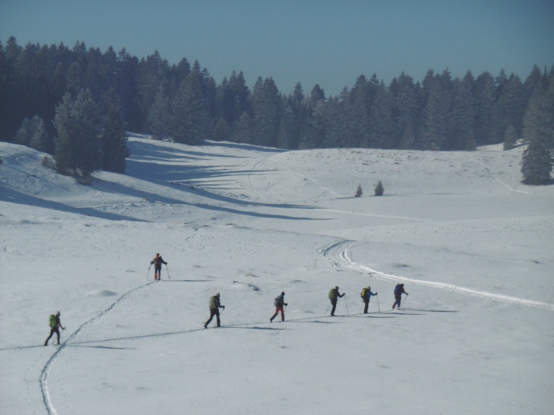 Départ glacial et venté sur le parking du Raimont ce matin. 8 personnes pour un circuit de 18 kms et 500m de dénivelé sur le plateau du Retord. Par des chemins non tracés nous avons atteint la crête de la Joux, puis la ruine du cul de la Maye, puis la Charnay. Repas de midi pris au refuge de la Conay(1200m) d’ou nous n’avons pas eu la chance d’apercevoir le mont blanc. Retour sur Cuvery par la Cua et partie moins intéressante par les pistes de ski de fond .
