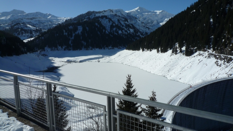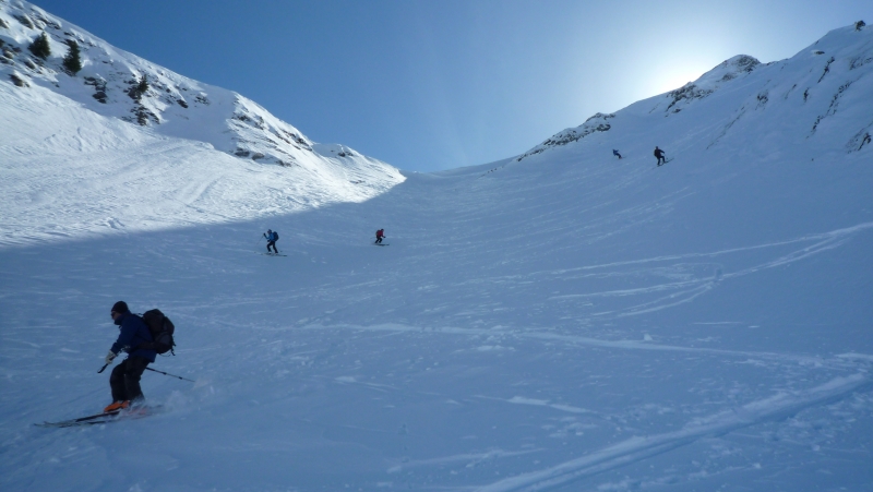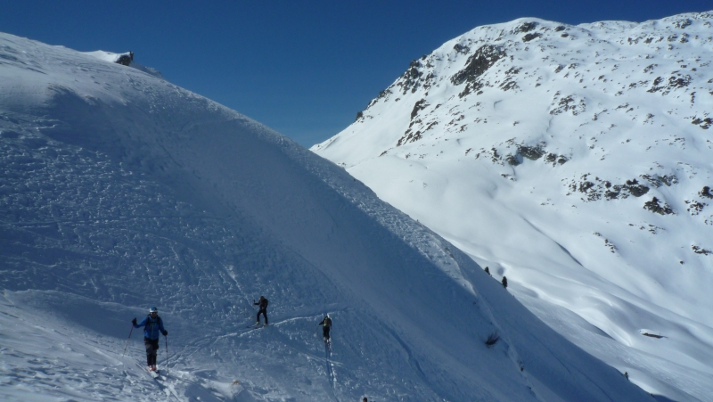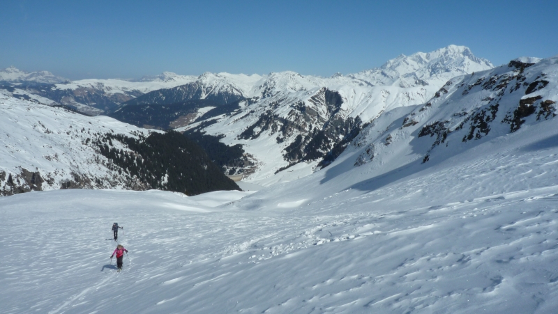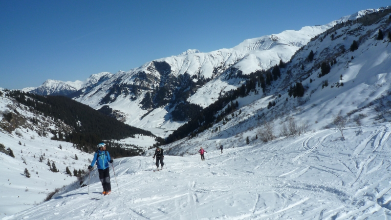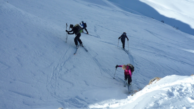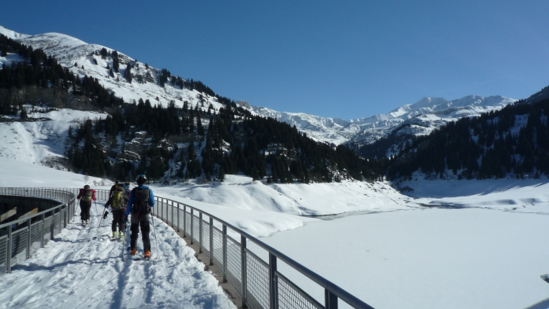 Nous sommes 7 au départ du Mappa, au-dessus d’Arêches, sur la route du lac de Saint Guérin. La route est bien enneigée dès le parking, et nous conduit au barrage, que nous traversons pour prendre le chemin du col de la Louze. Après les épicéas, nous quittons ce chemin après une zone d'”arcosses”, vers 2000m, pour nous diriger vers le sommet. Deux passages à 30-35° nous incitent à prendre des distances, avant d’arriver à la crête ensoleillée sous le sommet. Pas de vent, il fait bon, mais il faut bien redescendre après le pique-nique. La neige est un peu soufflée dans le haut, plutôt poudre dense ou poudre légère selon les passages, puis neige de printemps dans le vallon de la Louze. Il faut pousser le long du lac puis porter pour remonter au barrage, et la route forestière passe très bien.