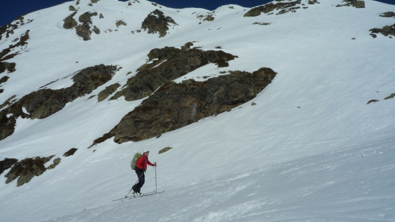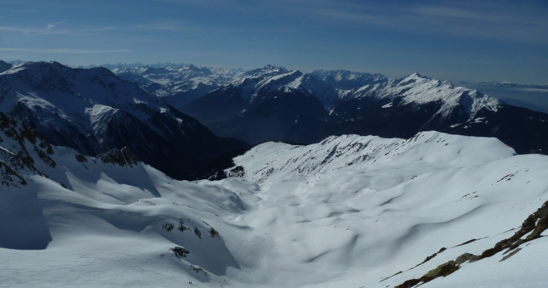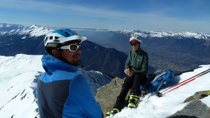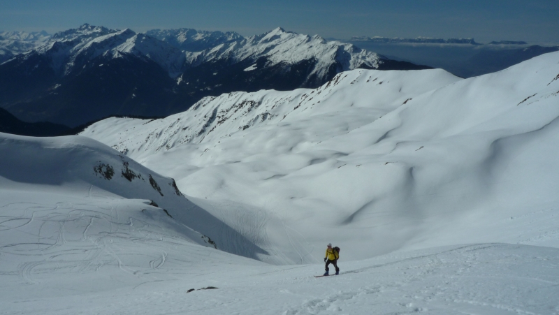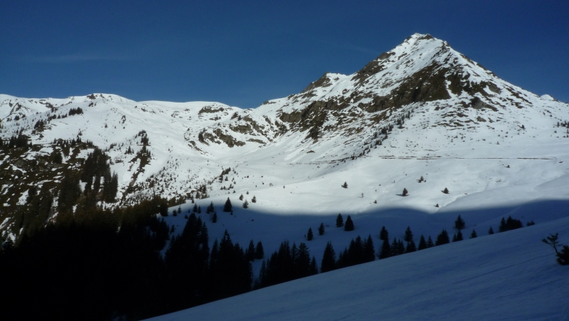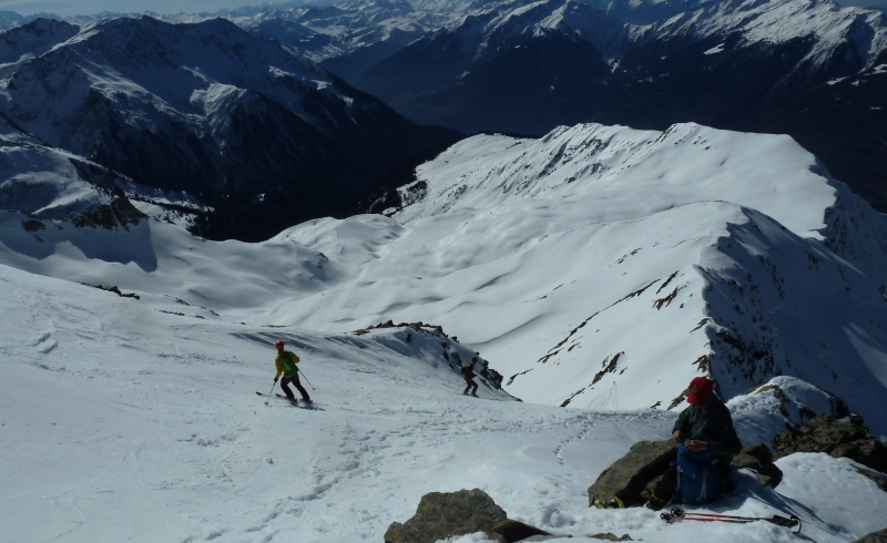 Pause au sommet à midi, avec très peu de vent. Une vingtaine d’autres skieurs se succèdent, venant du Daru ou du Planay. Descente à partir de 12h30, en neige de printemps, en descendant sur La Ravoire plus directement, à travers une forêt peu dense.