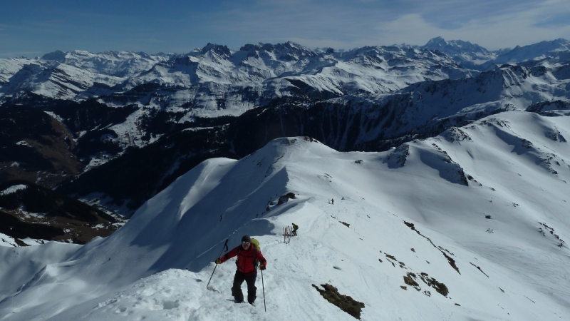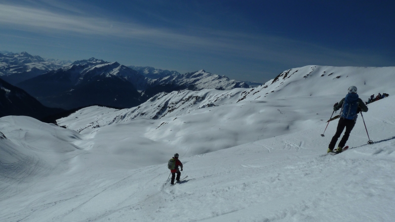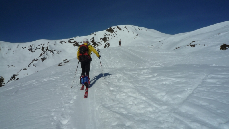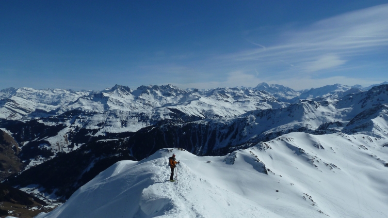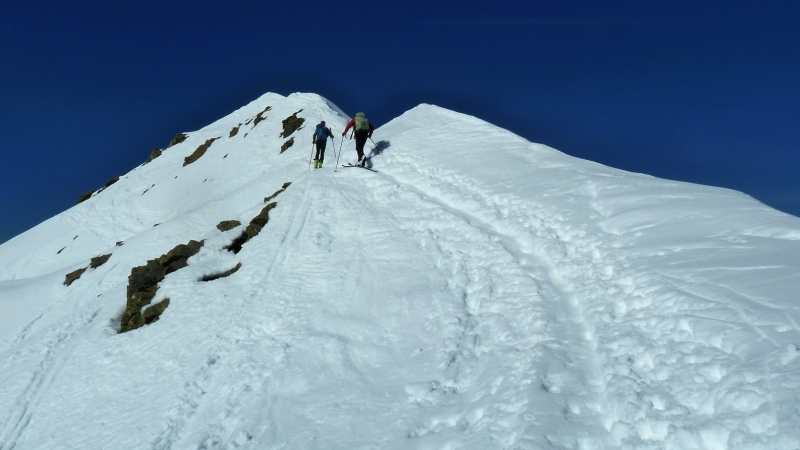 La longue route forestière au-dessus de La Bâthie est sèche jusqu’à Lachat, puis parfois enneigée mais carrossable jusque sous Le Daru. De là, après 3 minutes de portage, la route est skiable, malgré quelques courts passages de goudron. A La Ravoire, on opte pour la montée par le chalet du Soufflet, sur une neige dure mais ne nécessitant pas les couteaux ; puis une traversée nous amène dans le vallon conduisant au lac Sans Fond. De là, on rejoint la crête est de la Grande Journée au point 2376, puis le sommet, en remontant la crête, à skis puis à pied pour les 20 derniers mètres.