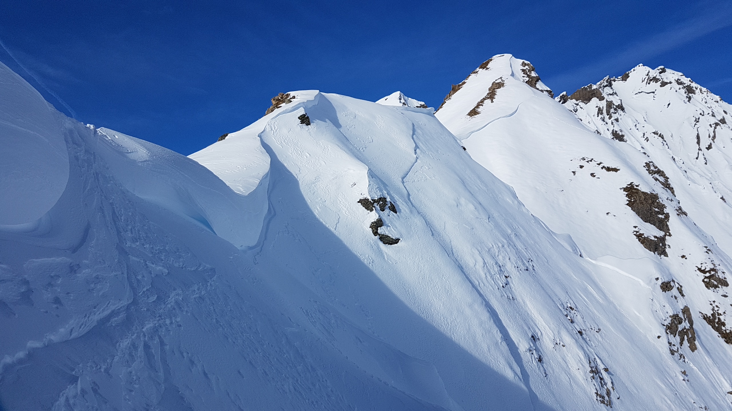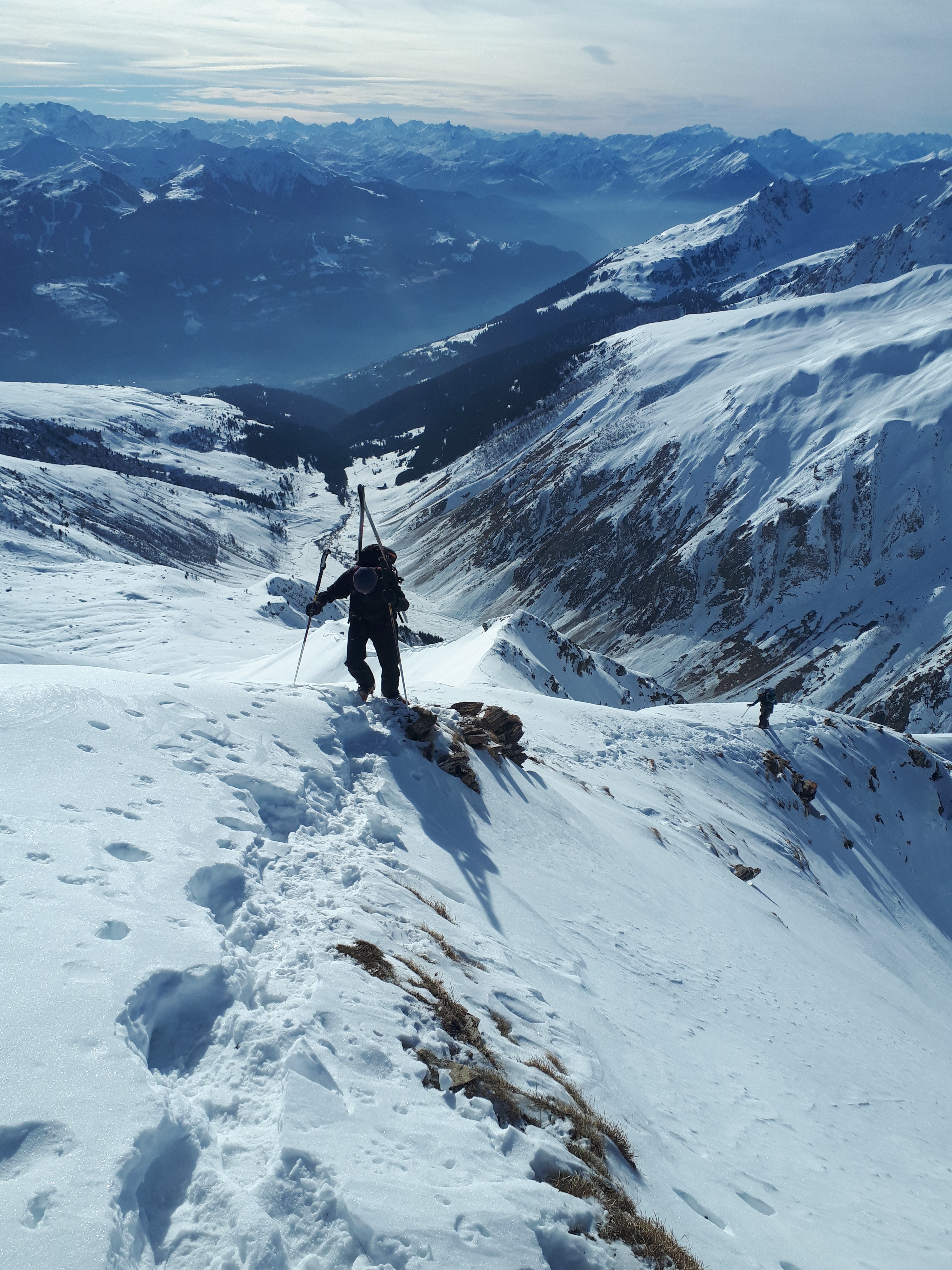 Nous sommes 4 au départ du foyer de ski de fond des Pars (1350m) au-dessus d’Aime. Il fait -7°, mais sans vent la température est très supportable. Pas de neige au départ en montant dans les champs jusque vers 1600m. Ensuite, en passant juste sous le Dôme de Vaugelas, puis en descendant 100m en contournant par l’est le Grand Chatelet, on remet les peaux pour gravir un couloir assez pentu menant, vers 2500m, sure la crête de Plovezan. Une petite descente sur une neige bien dure nous conduit à la face sud de la pointe, que l’on remonte en crampons jusqu’au sommet (2644m). Début de descente vers 14h, en crampons sur 50m, puis en virages (ou dérapages) sur cette pente encore bien dure. Ensuite, belle descente jusqu’au vallon de Foran, où la route enneigée nous ramène au parking. Belle boucle de 1400m de dénivelé (voir le topo de Ch. Hagenmuller), avec 3 manoeuvres de peaux…à refaire en neige moins dure pour plus de plaisir.