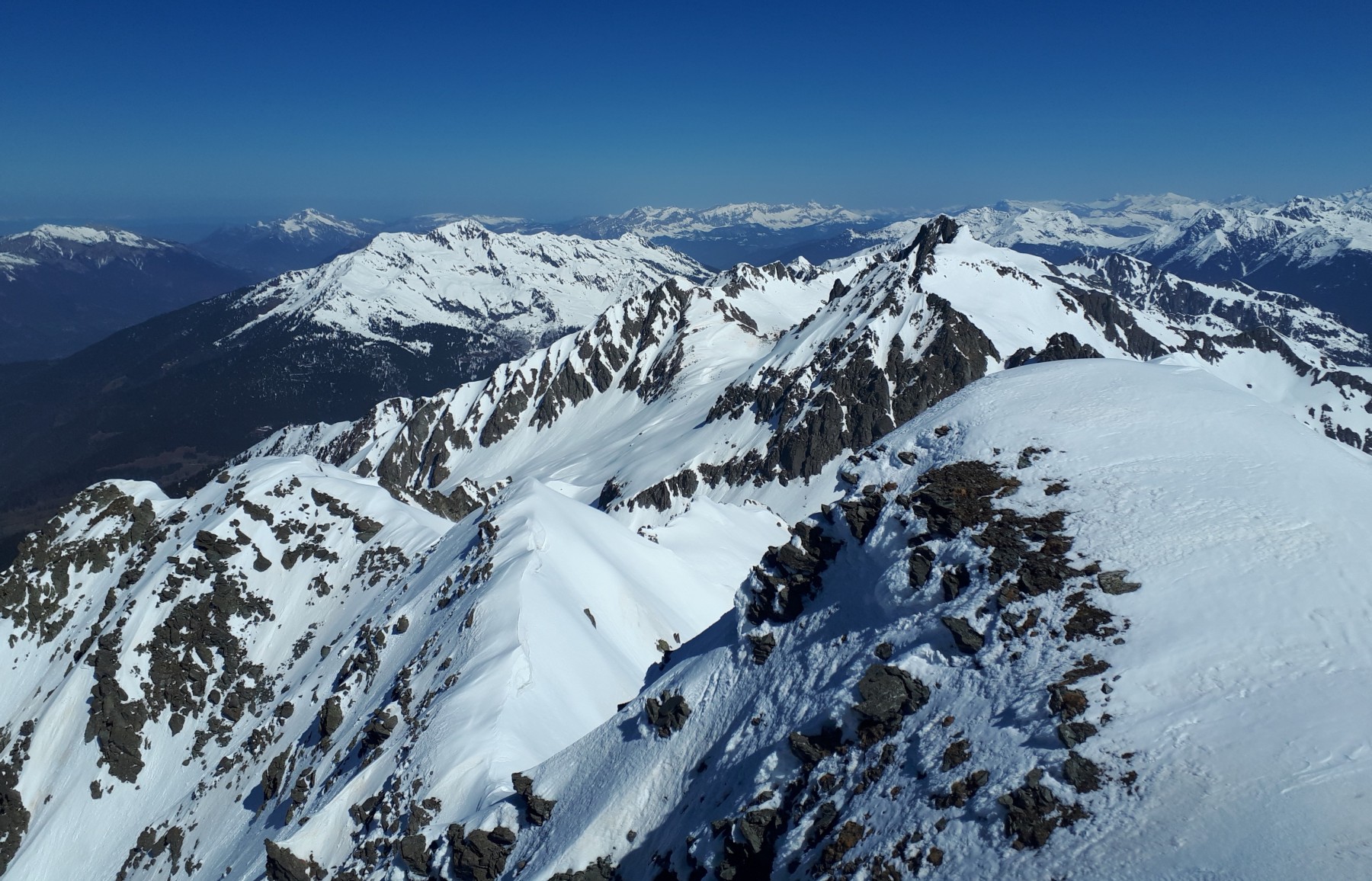 de portage, direction la Combe des Plans. Vers 2000mètres, nous prenons SW en direction du Col des Aiguillons. Avant l’arrivée au sommet de la Pointe de Balme 2683m, belle face SE triangulaire raide 40°/150m qui nous a fait bien transpirer. Sommet peu fréquenté magnifique panorama. Pour notre descente, le soleil bien présent transforme rapidement le manteau neigeux , et nous avons le plaisir de faire notre trace dans une bonne neige jusqu’à la Combe des Plans, puis celle-ci devient lourde et bien trafolée.
