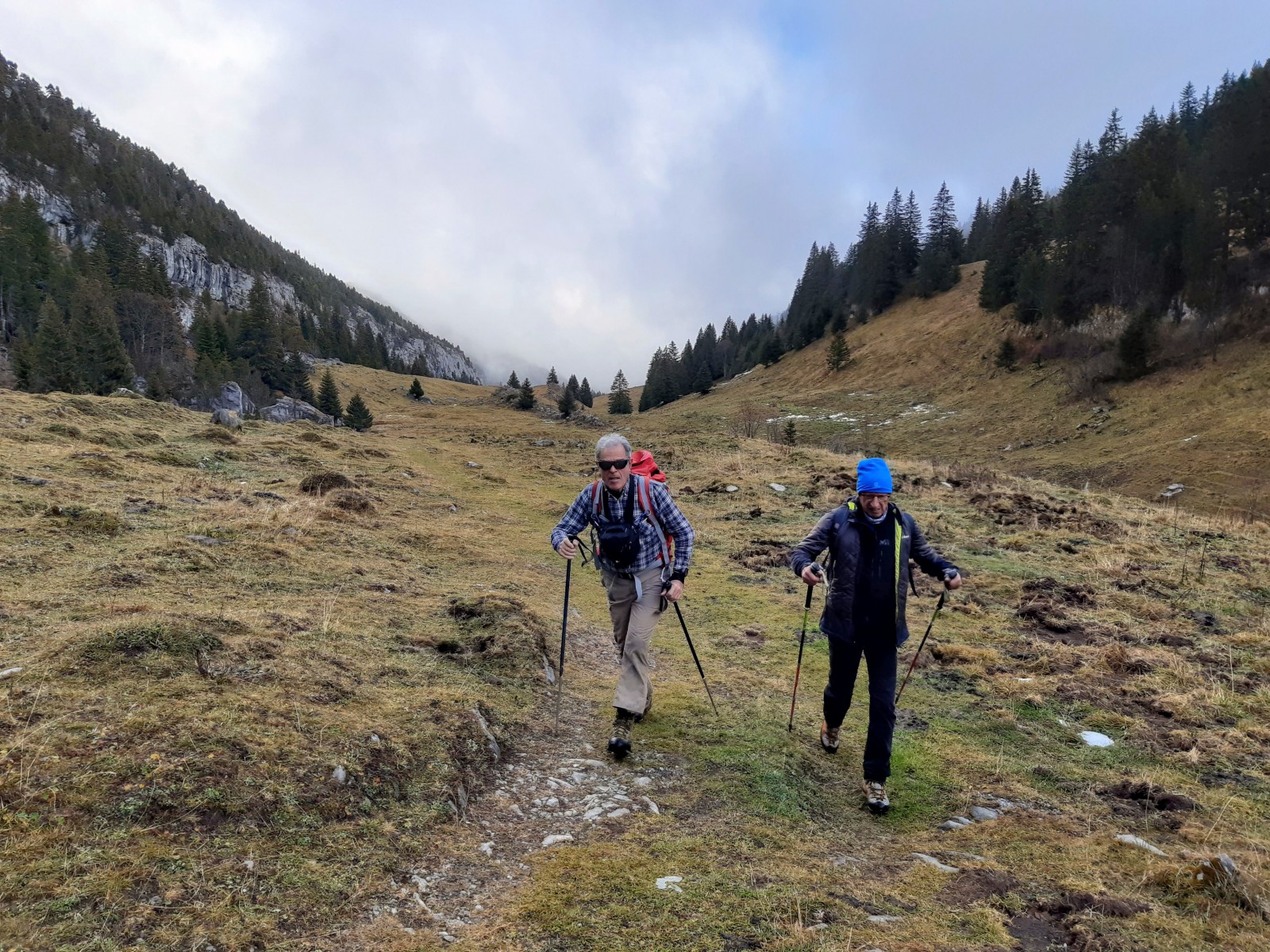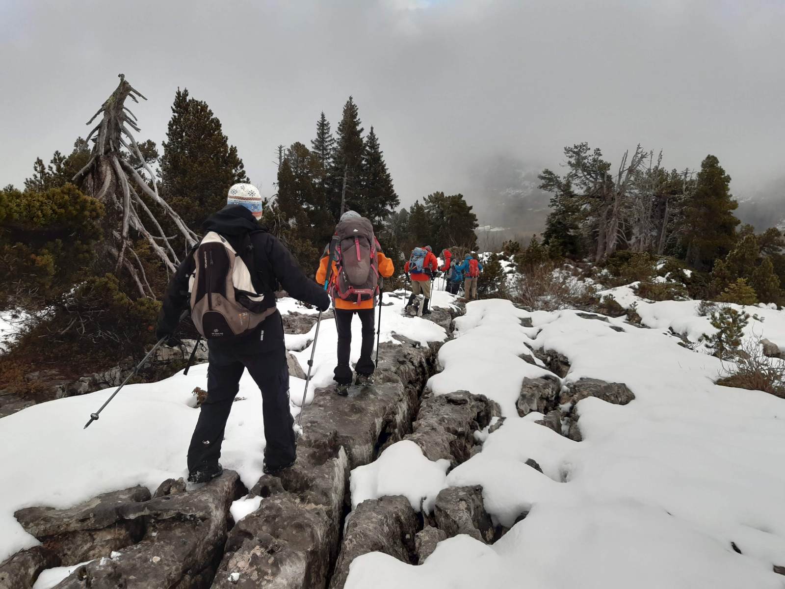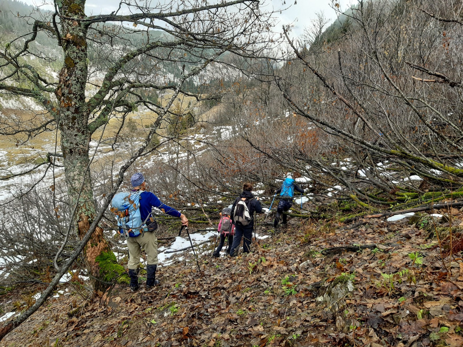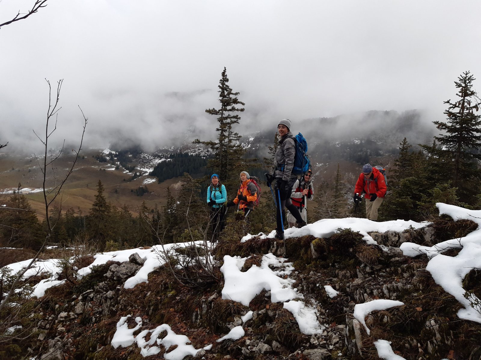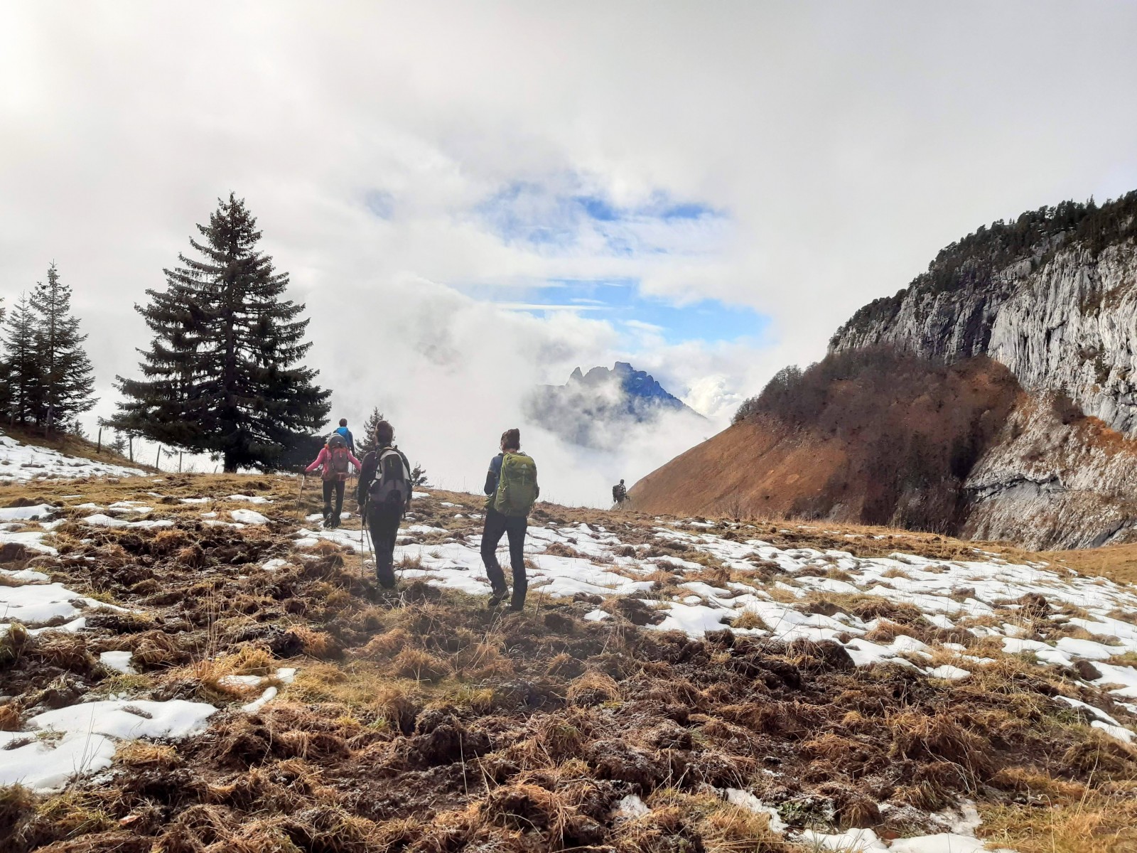 La météo de ce dimanche était mal partie, mais finalement elle nous a laissé parcourir les trois têtes des Glières ( l’Alpettaz, la Ronde , la Noire ). Bien sûr la sortie s’est déroulée parfois dans le brouillard ou sous une averse de grésil, parfois sous une éclaircie avec un soleil très timide . Mais le groupe voulait découvrir ce coin . En prenant les bonnes précautions dans les zones enneigées et glissantes nous avons pu réaliser ce parcours qui s’est terminé autour de chocolats et vins chauds. Merci à tous. Serge