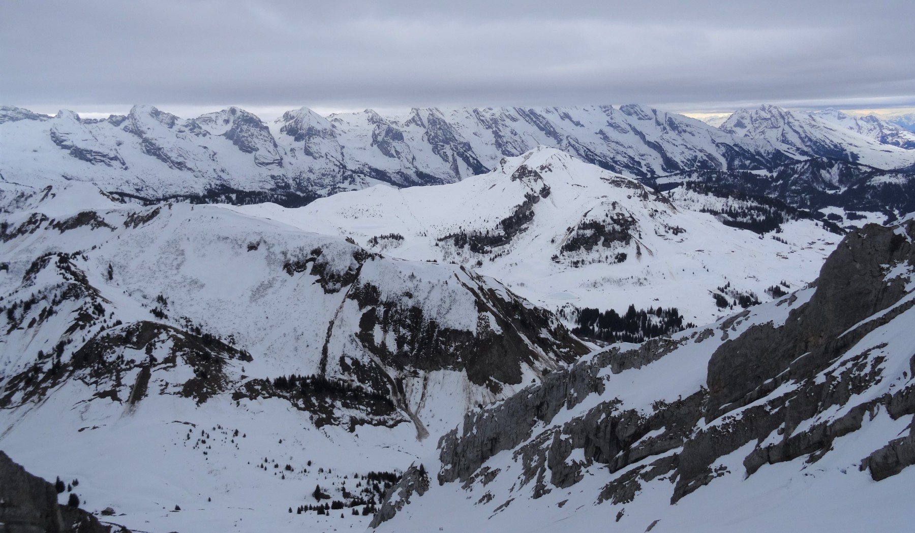 La météo du jour ( mardi 4 janvier) n’étant pas très optimiste, nous n’étions que 4 au départ du Chinaillon (parking des Bouts), au lever du jour, peu avant 8h, sous un ciel gris. Neige lourde au départ, par manque de regel nocturne, mais, à partir du col de la Colombière, la neige est plus dure, et les couteaux s’avèrent bien utiles. Montée par la combe de Balafrasse jusqu’au lac de Peyre, puis jusqu’au col dominant la “Combe Blanche”. Beaucoup de vent au sommet. Descente sans tarder dans cette combe en neige dure mais lisse jusque vers 1800m, puis neige lourde jusqu’au col, route damée, et picnic aux chalets de Cuillery.