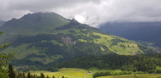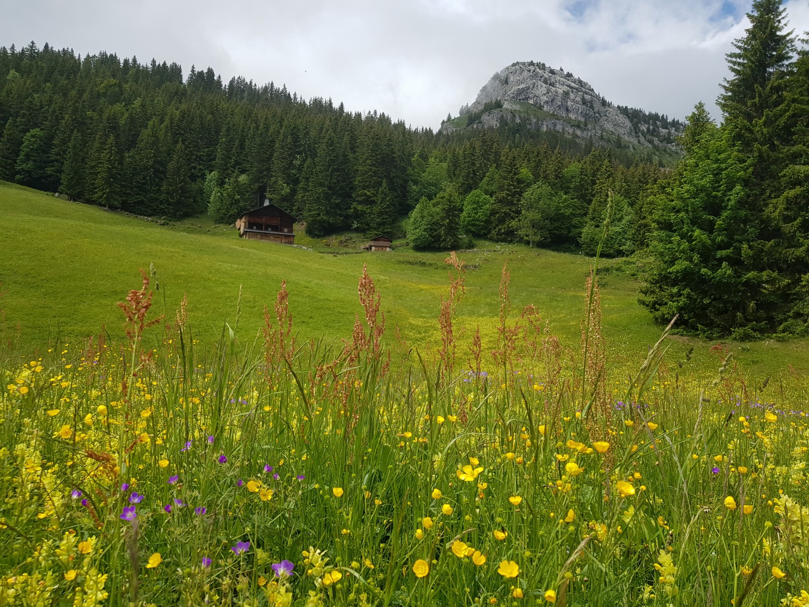 Direction Plan de la Forclaz par la forêt, on longe les rochers de la Forclaz, site d’escalade avec ses dévers impressionnants (que j’affronterai dans ma prochaine vie…), la Tannaz, les Parchets. Au point côté 1485, un choix se pose… soit on continue par un sentier facile en direction des Mouilles pour récupérer la voie normale, soit une petit sente qui se dirige plein ouest d’où, d’après mon topo, on peut rejoindre le sentier normal par le pierrier. Cette option est choisie et là… tout ce complique, aïe, aïe, aïe, le terrain tout droit vers le pierrier qu’il faut grimper de 150 m est miné de souches, branches et rochers. La pluie depuis un moment s’en mêle et le terrain est gras et glissant. Serge me propose de plutôt viser la crête ouest pour ensuite couper les courbes de niveau en tangente, ce que nous faisons. Sage décision et ouf, je retrouve le sentier bien tracé qui vient de la voie normale et passe au ras de ce pierrier.