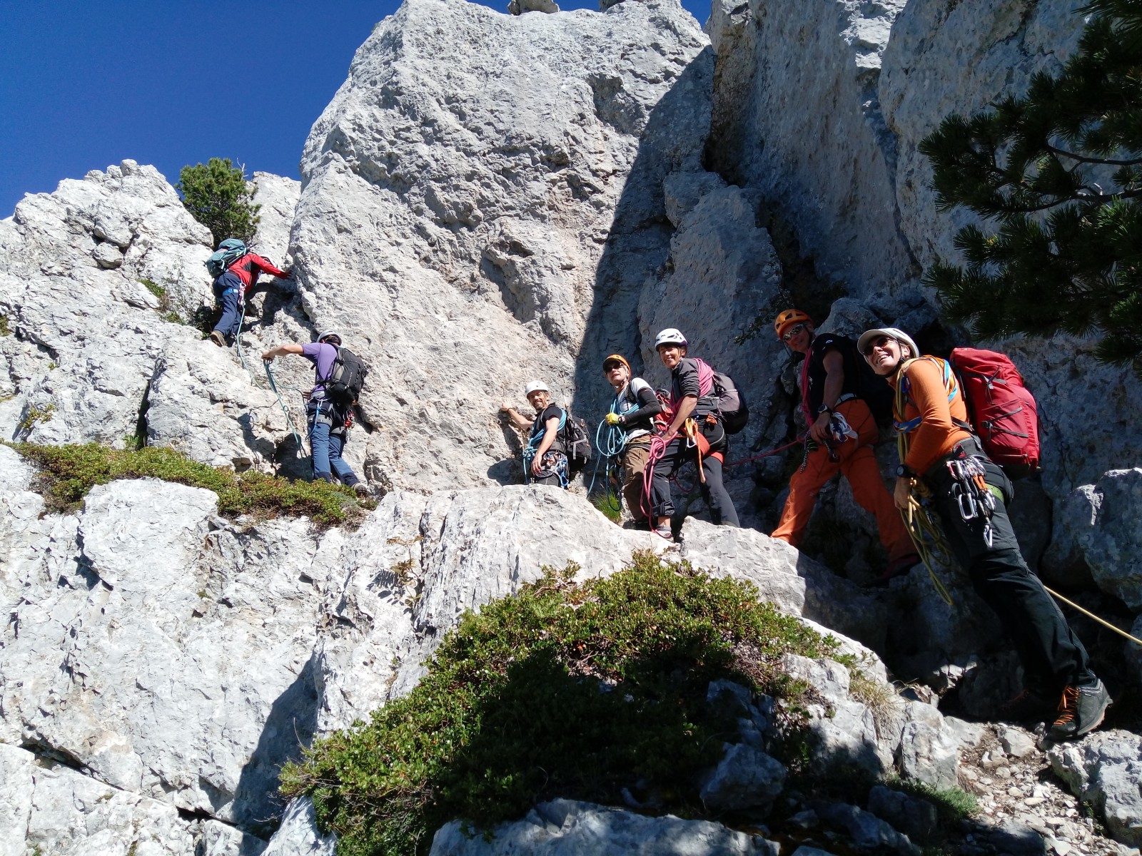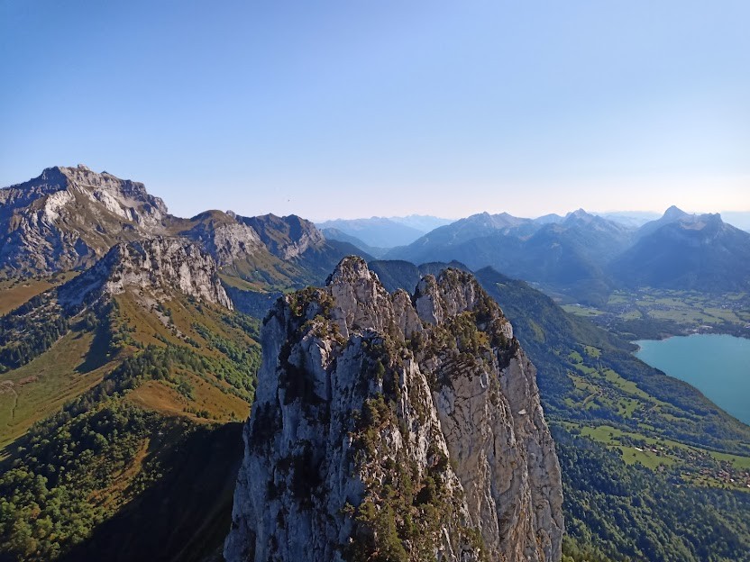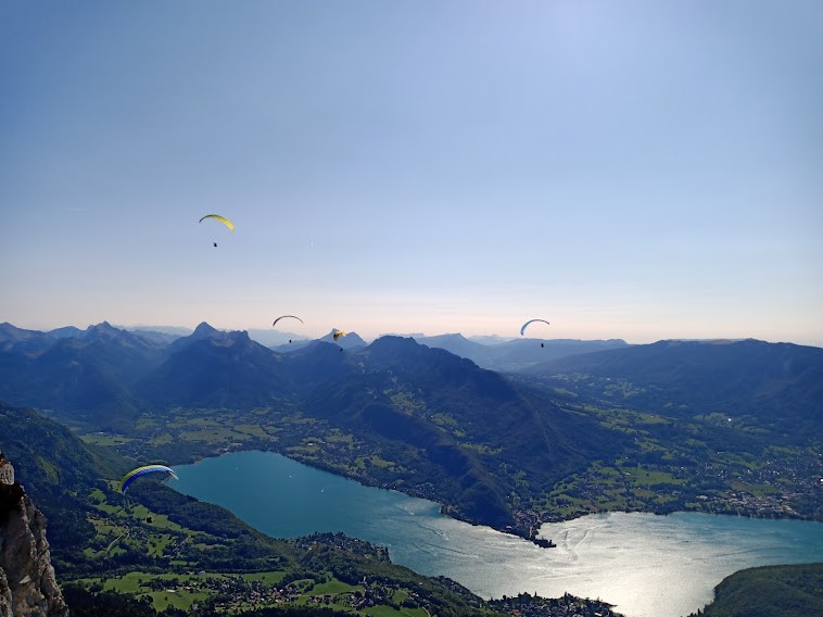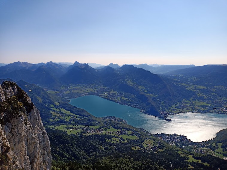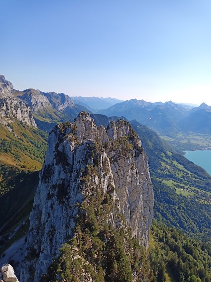 10h à l’attaque, sortie de la fameuse boite aux lettres et déjeuner à 16h sur la Centrale. Entretemps, des montées, des descentes, un rappel, un gouffre évité grâce à un toboggan, des petits pas impressionnants, un caillou sur un casque, des pins pour s’assurer, des racines qui servent de poignées, le tout avec le lac à nos pieds et sous le regard des parapentes, température douce, beau soleil, pas de vent.