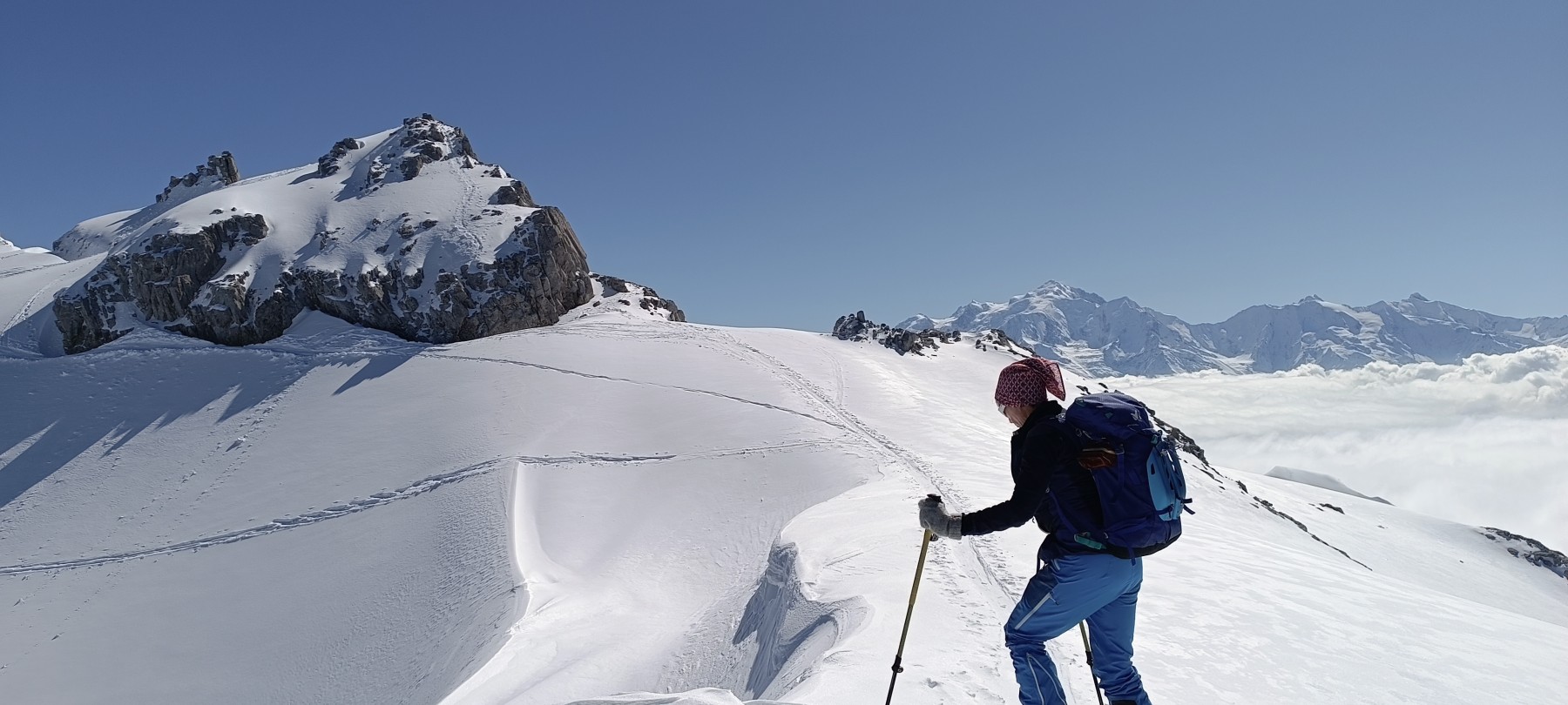 Nous démarrons skis aux pieds sur la route enneigée et gelée, dans un brouillard épais jusqu’au-dessus du col des Annes, où le soleil nous réchauffe. Col de l’Oulettaz, combe le long de la Rouelettaz , et plateau non loin de Gramusset nous amènent près de la Pointe Percée puis au sommet que nous atteignons finalement à pied.