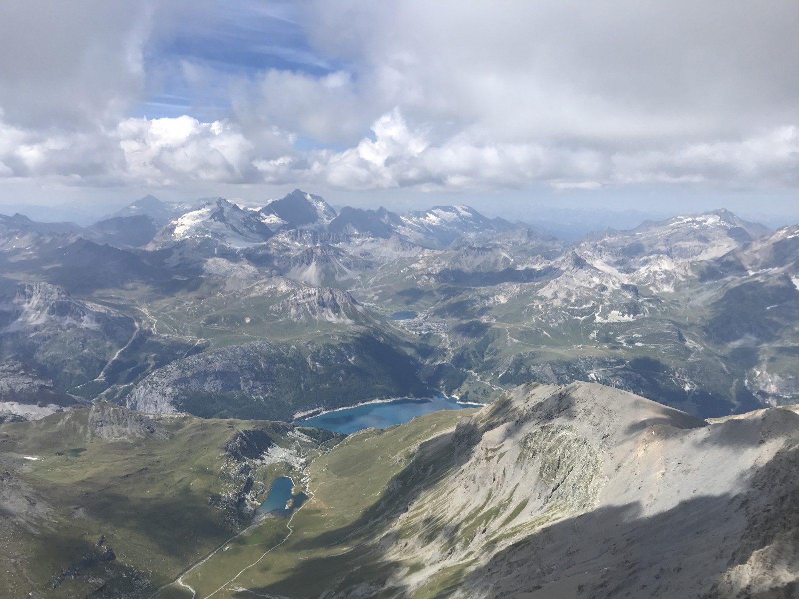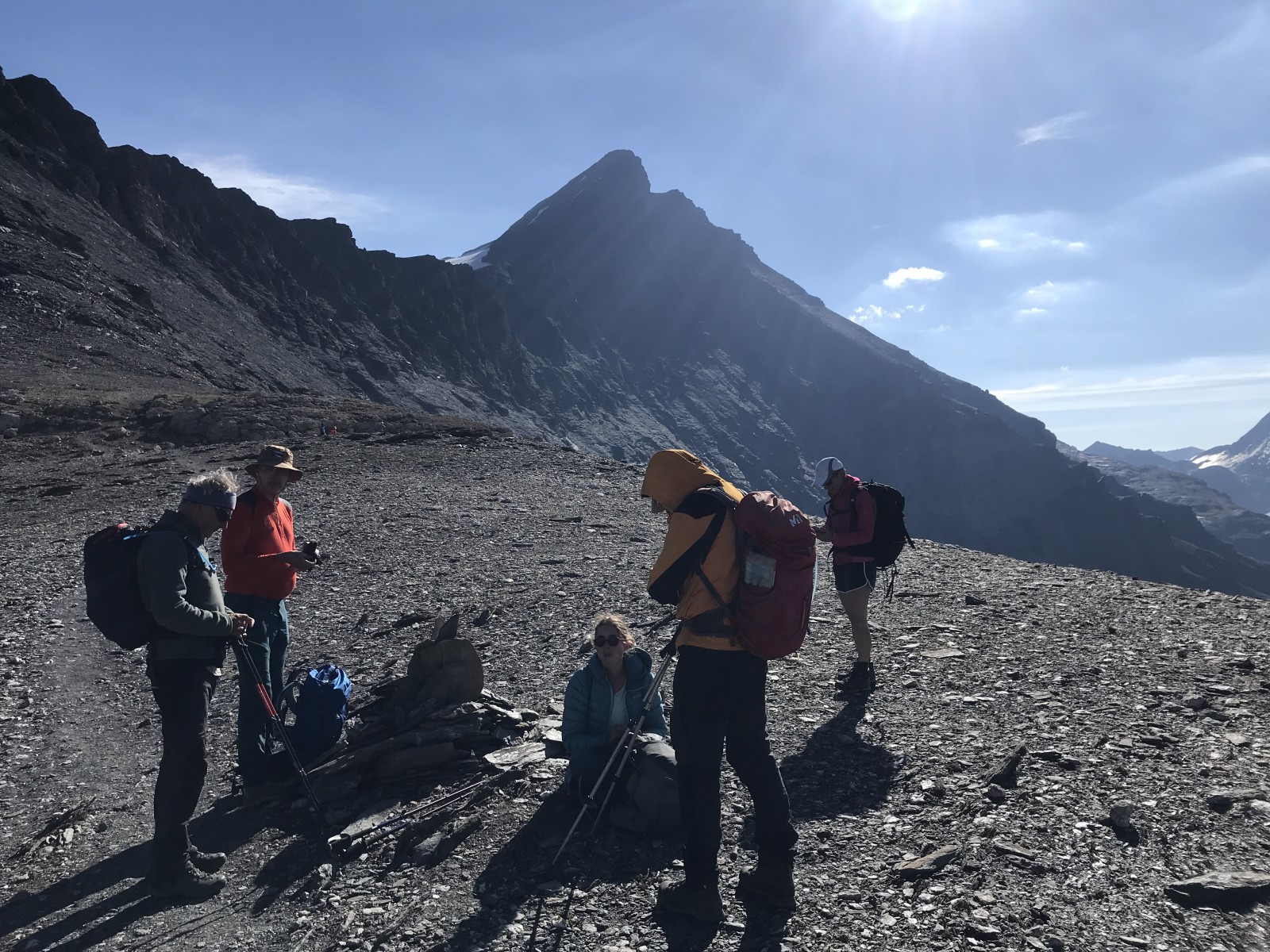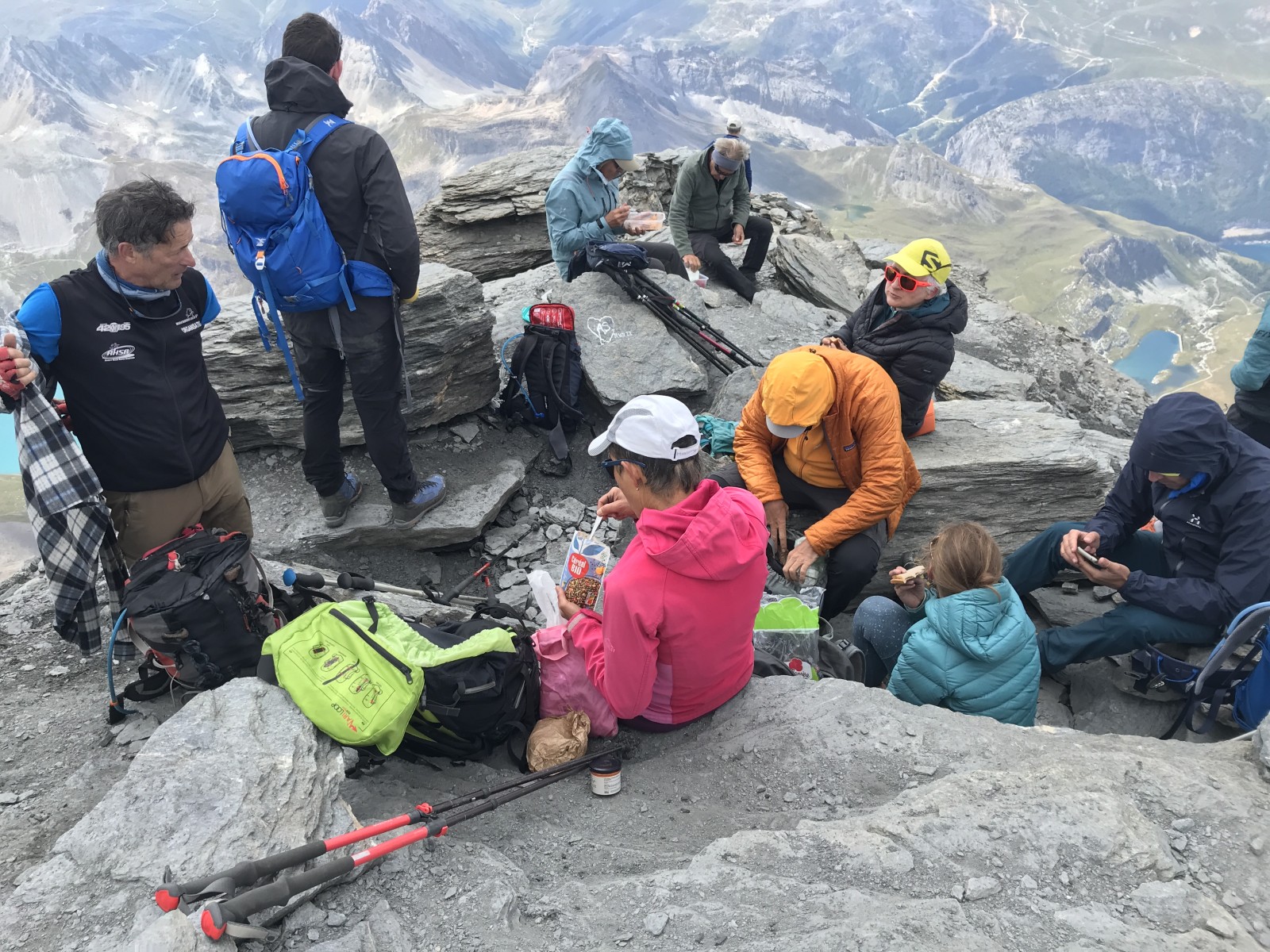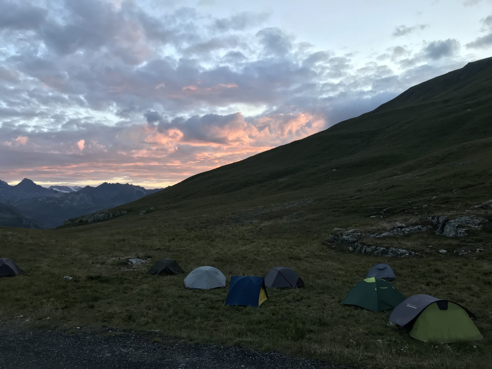 Départ au dessus du lac de Tignes, très beau paysage avec cette aiguille percée qui nous interpelle par sa géologie, petite mise en jambe avant la grande Sassière prévue le lendemain, petit verre de fin de randonnée au bord du lac avant de partir préparer notre bivouac au parking du Saut, une très belle averse nous surprend alors que nous installons les tentes, on se rappatrie dans les voitures en attendant que la pluie cesse. Enfin le beau temps revient, apéro, repas et nuit étoilée…