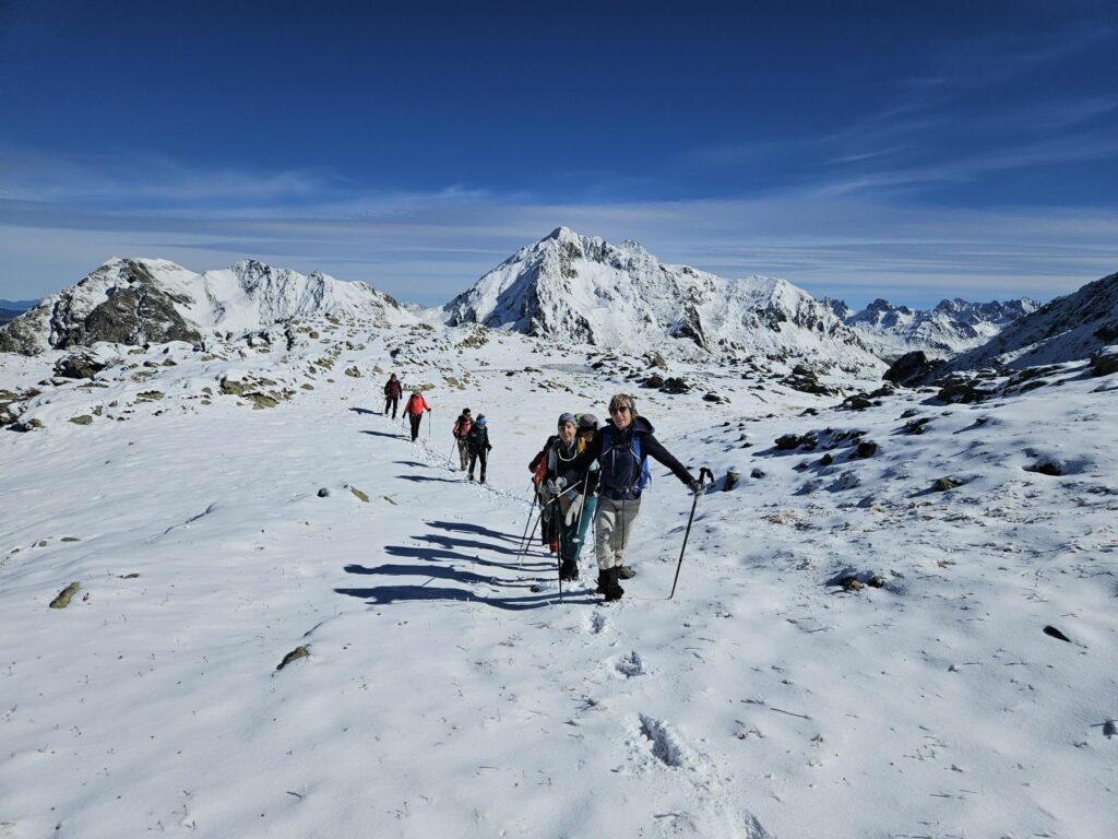 On commence par une dose de pentes raides et austères : direction le Lac des Cornaches, un sentier supérieur en balcon, du Col de Tourche au Col sans nom. Il fait froid et on supporte le bonnet et les gants. D’ici, au lieu de plonger dans le Vallon du Dard, nous quittons le sentier pour attaquer à droite, en bordure du versant Nord, une pente bien raide que l’on suit au fil de l’arête, et c’est parti pour 280m dans les rhododendrons et myrtilliers. La neige nous cache une sente de chamois qui permet le franchissement d’un ressaut, et après un bel effort (hah hah, on y croit !) nous débouchons au sommet de la crête.