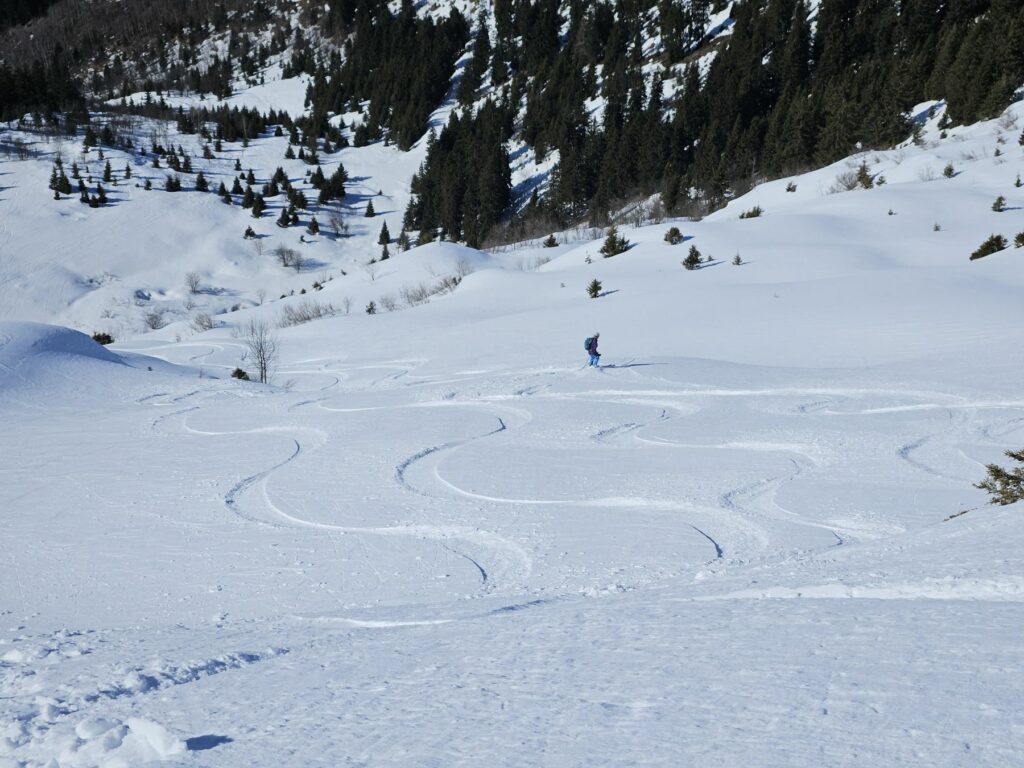 Passage au pied de la combe pour passer derrière, et revenir à gauche avec quelques surprises. Nous rejoignons la trace de la combe pour butter au pied du couloir, très tentant mais non prévu : il faudrait au moins 1 piolet. Descente dans une excellente neige : poudre et le bas en neige de printemps.