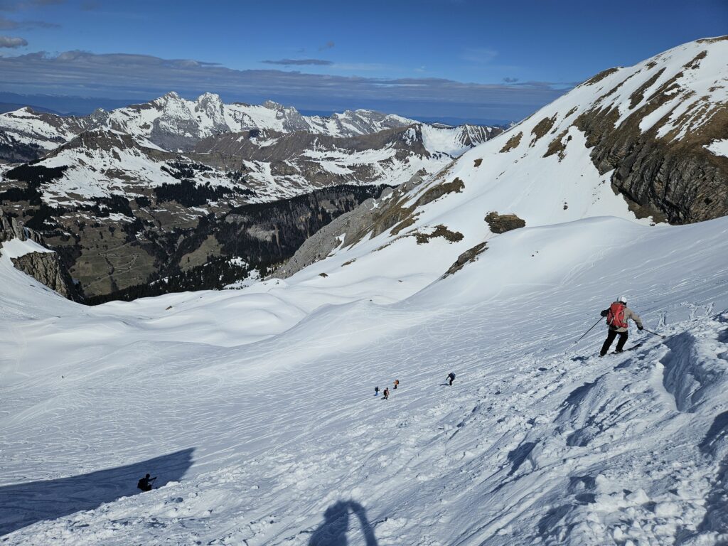 Montée agréable avec un ciel de plus en plus dégagé mais sans grosse chaleur. Arrivée au collu côté Tête de Paccaly un peu avant midi, il reste une légère croûte de surface sur la vieille poudre. Didier laisse échapper son casse croûte qui s’arrête 60m plus bas aussi nous décidons de manger plus tard. Le haut est est plutôt physique à skier mais plus bas au soleil nous trouvons une neige de printemps plus facile. Descente jusqu’au chemin sous les vernes pour profiter de la neige et pique-nique avant d’attaquer le retour avec ses petites remontées et retrouver la foule au parking.