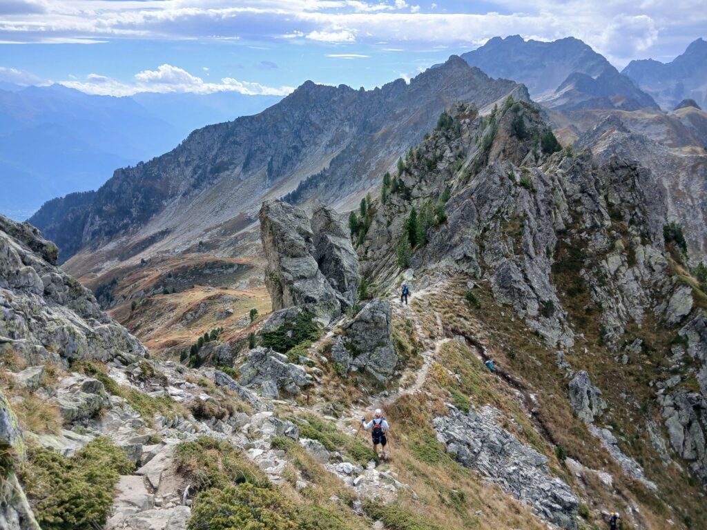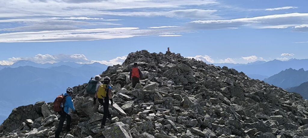 Rando tranquille jusqu’au col de la Perrière puis montée dans des éboulis, des chaos de blocs, quelques cheminées plus raides… mais le rocher est bon, les prises de mains et de pieds confortables. Les bâtons sont dans le sac et nous arrivons rapidement au sommet.