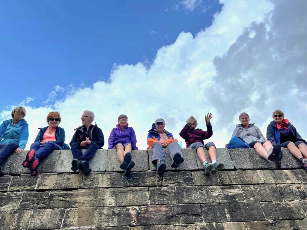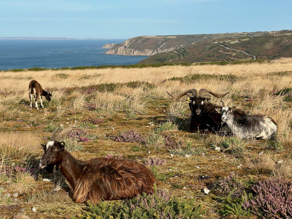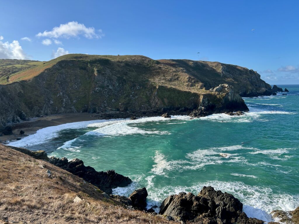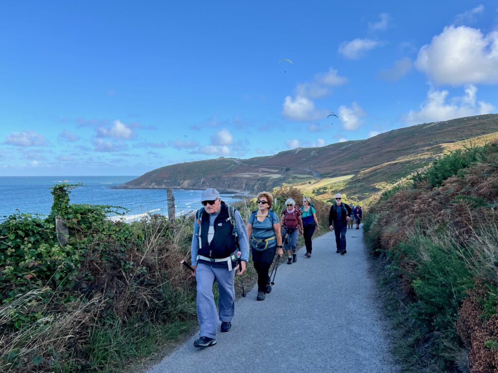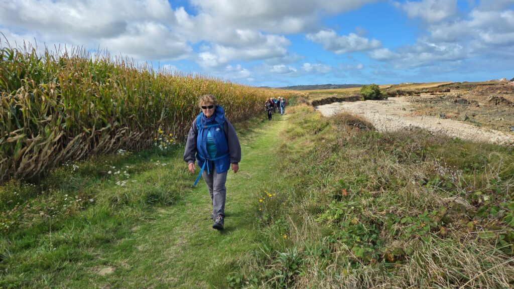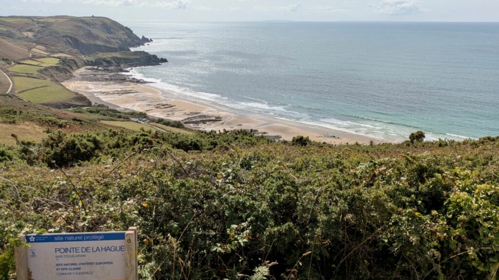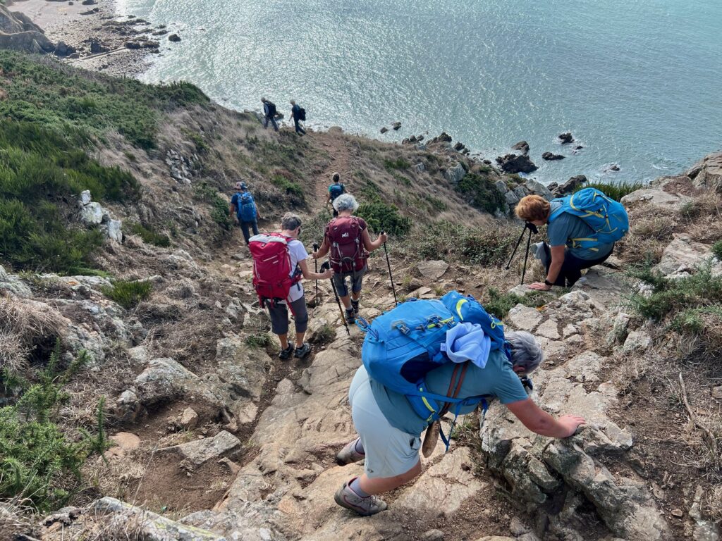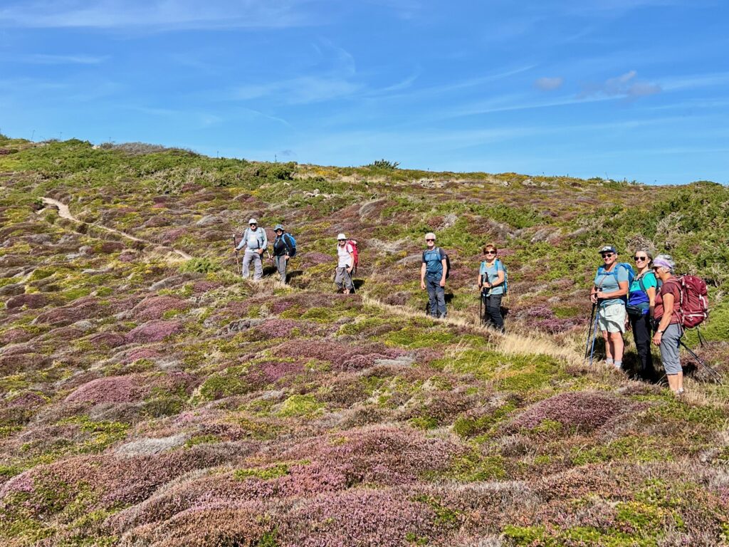 05/09/2025 – Encore du vent mais beau temps pour cette belle étape sur la partie Ouest de La Hague. Nous descendons par La Roche pour reprendre le chemin des douaniers : passage par la Pointe du Houpret, descente à la Baie d’Ecalgrain (spot pour la baignade du soir ?), puis passage à la Côte Soufflée d’où nous montons vers le Nez de Voidries ou se trouve notre restaurant de ce soir. La, mauvaise nouvelle, nous sommes « détournés » vers le village de Jobourg, une partie du chemin étant fermée suite à des incendies (nous ne passerons pas au Nez de Jobourg ni à la pointe du Bec de l’Ane). Retour sur le Chemin par la Descente de Moncaneval et remontée sur la falaise pour passer au-dessus de l’Anse du Tas de Pois, et atteindre l’Anse des Moulinets (et les installations d’Orano sous le barrage des Moulinets). Nous remontons sur le plateau par un chemin raide longeant le lac du barrage. Pique-nique au Hameau Mouchel, Café à la crêperie du Hameau Dannery, Glace artisanale au Hameau Sanson, puis retour à Auderville par le plateau : Merqueteot, la Lande de Verbec, Laye, et le haut des falaises jusqu’à La Roche en passant par un spot de parapente. Superbe étape dans les rochers et dans les landes. Nous auront parcouru 21,5km pour 517m de dénivelé. En prime, au retour, départ en minibus pour la Baie d’Ecalgrain et la baignade des pluscourageux(ses)… Repas du soir à l’Auberge des Grottes à Jobourg.