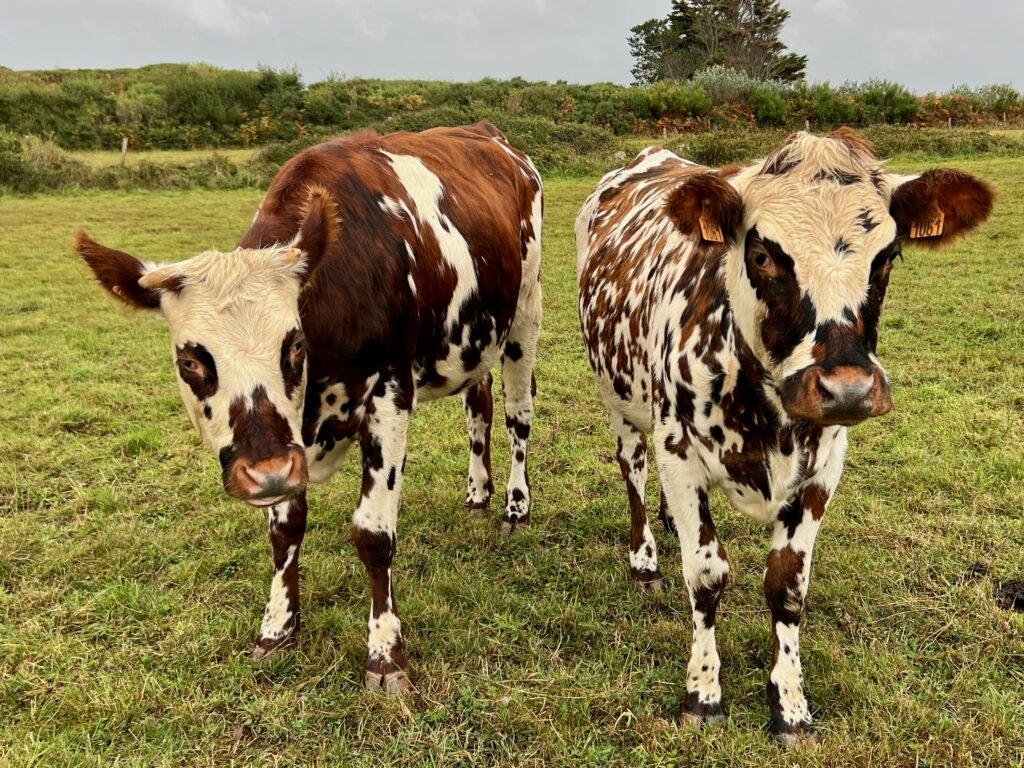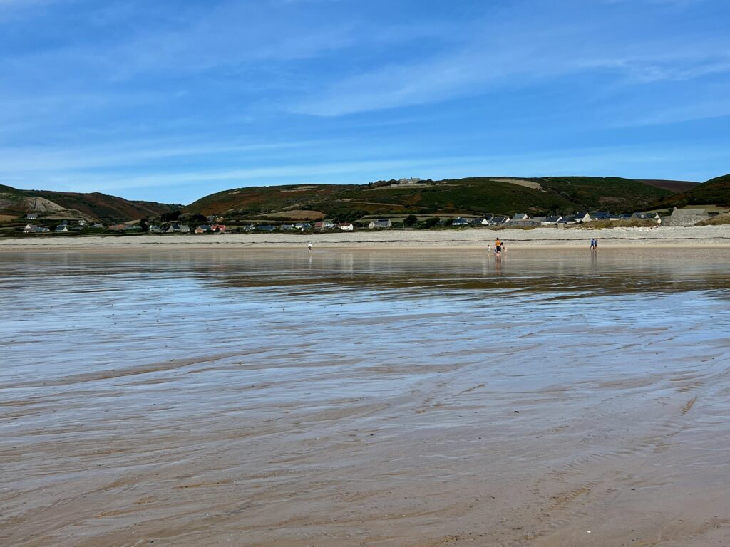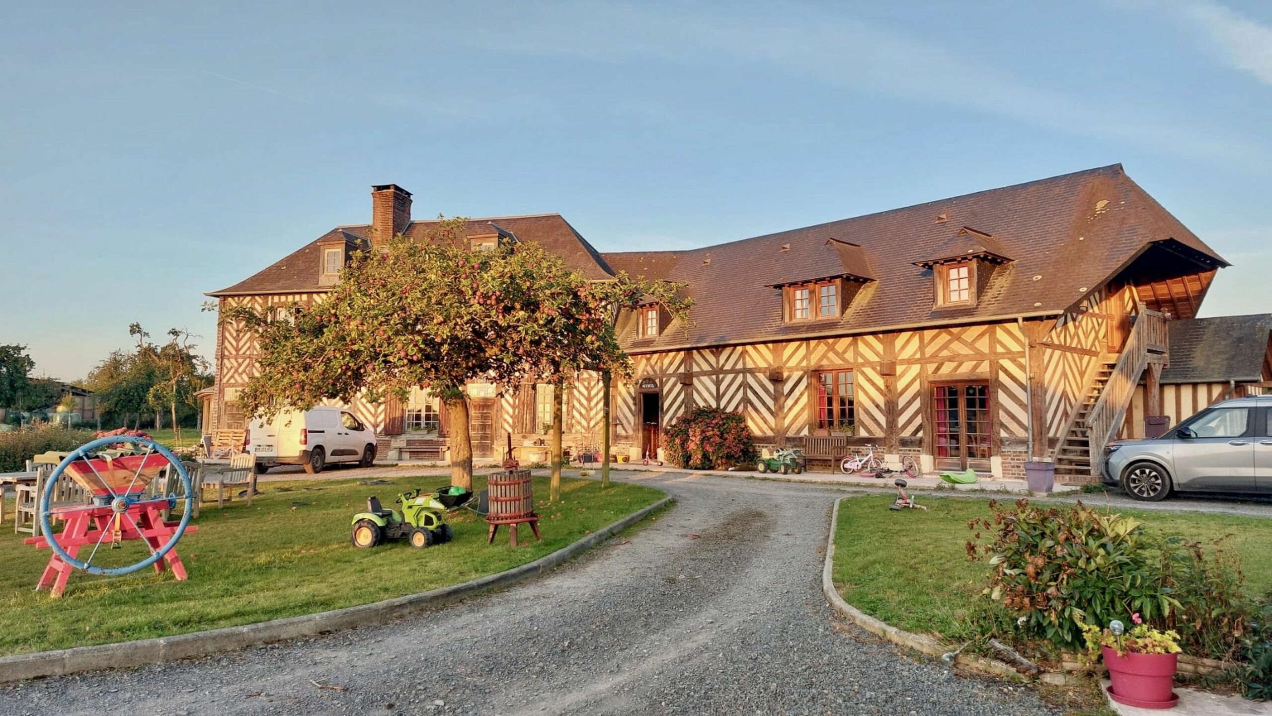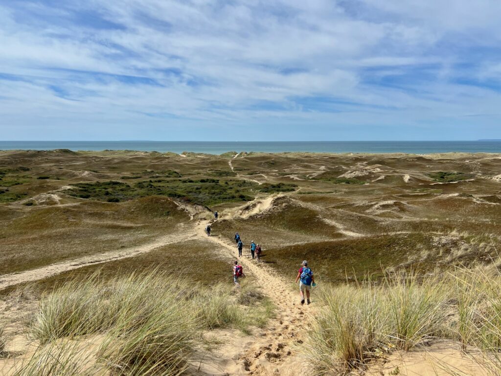 06/09/2025 – Temps correct avec encore du vent . Nous quittons Auderville en minibus pour aller voir Les Pierres Pouquelées (sépulture néolithique) et descendre au Jardin de Vauville que nous visitons (jardin botanique de la famille Pellerin de Turckheim ou sont rassemblées et bichonnées de nombreuses espèces de plante de l’hémisphère australe). Nous « posons » le minibus vers la plage : nous longeons la réserve naturelle de la Mare de Vauville, puis nous montons à travers les dunes jusqu’au Calvaire de Biville : pique-nique face à la mer avec vue sur les dunes, l’Anse de Vauville et le Cap de Flamanville. Brusque départ de Michel en courant pour une descente « écervelée » , un tout droit dans les dunes pour rejoindre le chemin qui nous ramène au minibus ( 7,5 km et 146 m de dénivelé). Récompense pour les baigneuses et un baigneur : un plongeon dans l’océan à marée basse sur la plage de Vauville. Départ pour le port de Dielette (bateaux pour Guernesey), le Cap de Flamanville, son dolmen « Pierre au Rey » et pose café au sémaphore transformé en bistrot. Il se fait tard : nous repartons pour Bayeux(et son Leclerc pour acheter les fromages normand) sans voir la Tapisserie (Musée fermé en prévision de sa restauration et son envoi à Londres….). Sur la route qui nous conduit à notre dernière étape – La Ferme de la Vicomté d’Auge à Clarbec – nous faisons un passage rapide au village normand typique de Beuvron en Auge. Le soir, repas à la ferme (normande) avec le propriétaire, un kir au cidre, et deux variétés de cidre.