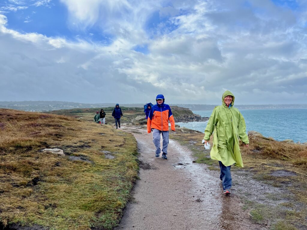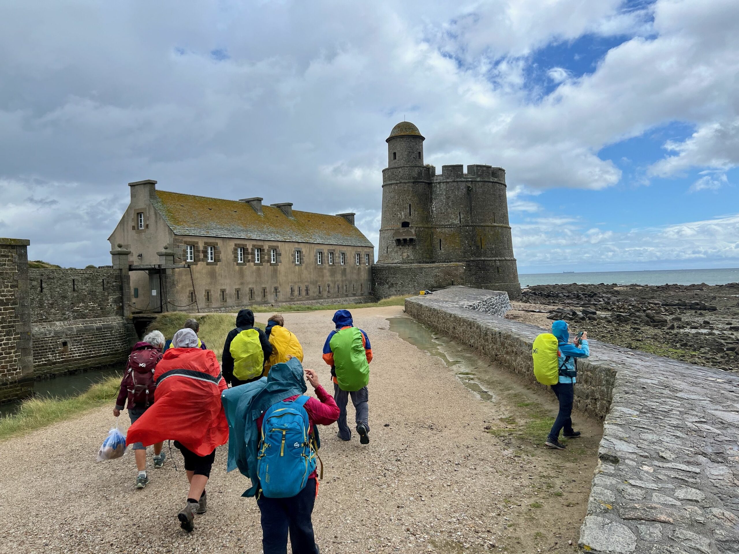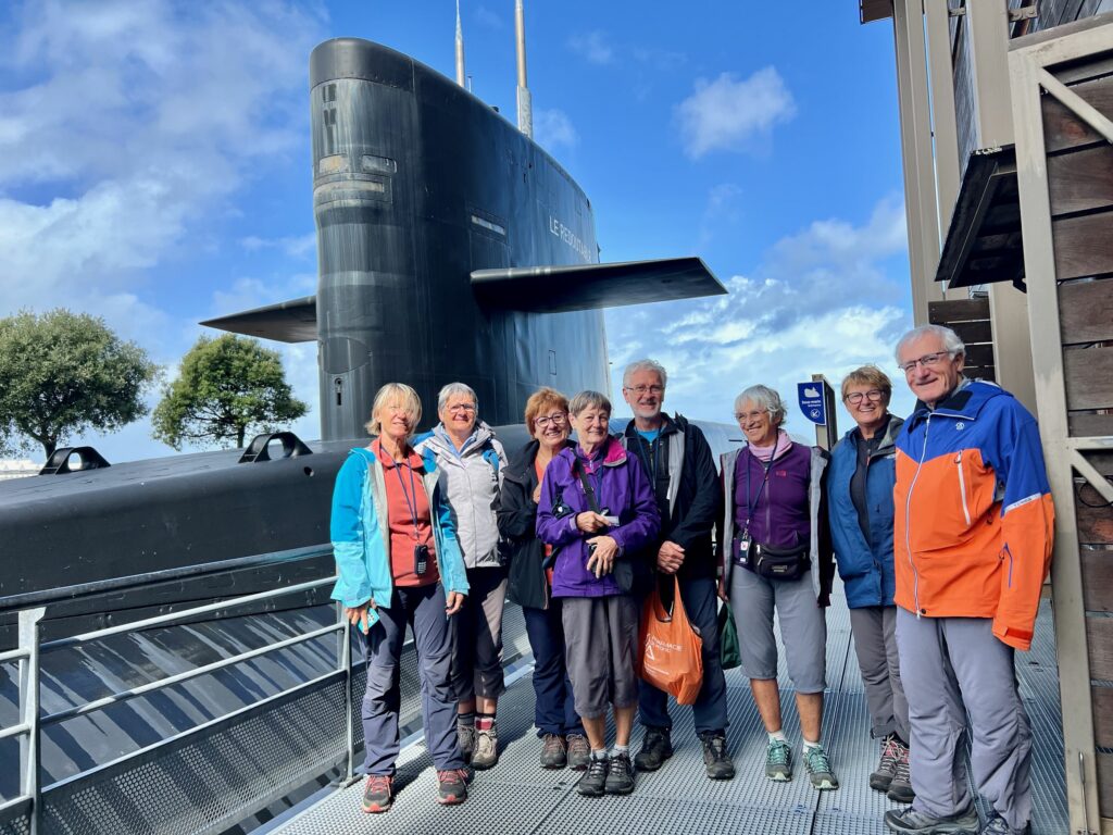 03/09/2025 – Temps humide, venteux. Nous partons à Fermanville et, vu le temps, nous ne faisons pas la randonnée prévue. En minibus nous rejoignons le Fort du Cap Levi. Nous profitons d’une accalmie pour prendre le chemin du bord de mer qui nous amènera au Fort, puis au Cap (avec son sémaphore), puis à Port Pignot (carrière de granite rose). Au retour nous rejoignons Cherbourg en minibus pour notre plan B du jour : la visite du Musée de la mer : Pique-nique à l’abri dans le musée alors qu’il pleut des cordes … Puis visite du Redoutable, de la Gare Maritime d’où est parti le Titanic (et d’autre transatlantiques comme le France) et son superbe aquarium. Re-minibus pour traverser Cherbourg (par le pont tournant), le port de plaisance, les usines de la DCN, et la jetée de Querqueville d’où nous pouvons découvrir tous les forts et autres ouvrages d’art qui ont permis de « construire » la 2ème plus grande rade du monde (1500ha) dès 1783. Minibus de nouveau pour rejoindre notre hébergement à Auderville- Hague (Goury) via un petit arrêt à la maison natale de Jean François Millet. Repas du soir dans un restaurant d’Auderville. Au total, nous aurons marché près de 7 km.