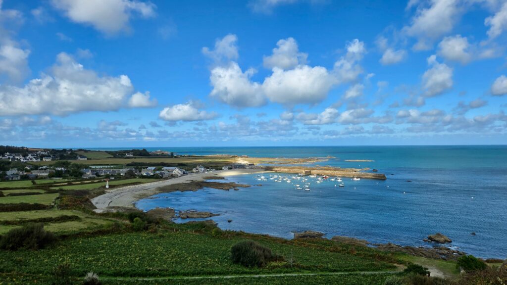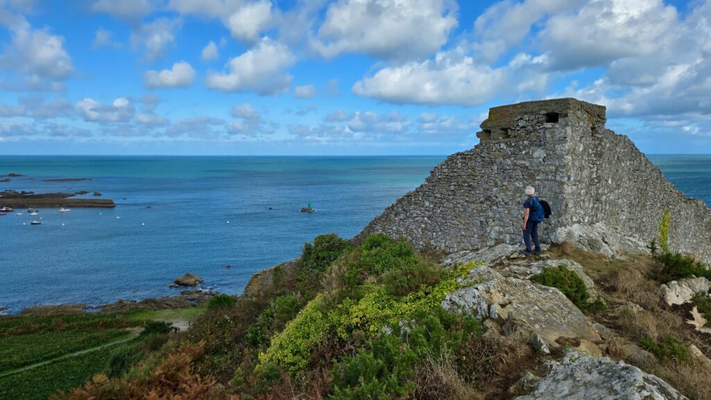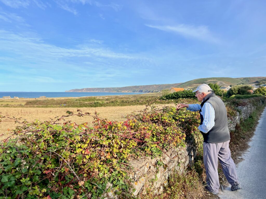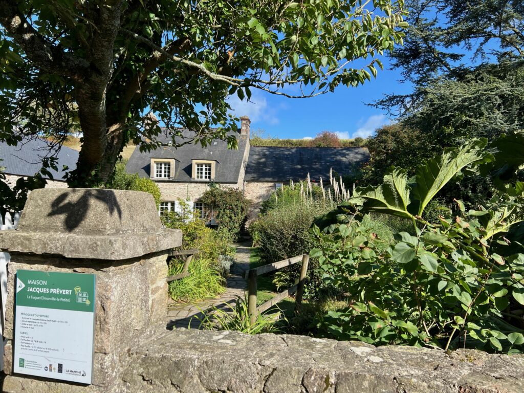 04/09/2025. Temps correct mais beaucoup de vent (SSO) – Après le petit déjeuner, nous partons à pied à Goury, pour faire le chemin des douaniers sur la partie Nord de la Hague : port de Goury, sémaphore de la Hague, Pointe de la Loge, pointe du Nez Cabot, Port Racine (un corsaire – le plus petit port de France), l’Anse St Martin, la Pointe de Jardeheu (pique-nique), le Port du Hâble et son Fort. Pose café dans un bistrot du port avant de repartir en minibus (garé la veille par Michel sur le parking du port) pour les visites culturelles de la journée : un petit tour dans Omonville la Rogue, le Manoir du Tourp (Maison de la Hague), Maison de Jacques Prévert à Omonville la Petite, ainsi que le cimetière ou est enterré Prévert. Retour à Auderville et repas du soir dans un autre restaurant local. Au total nous aurons marché 17,5 km pour 126 m de dénivelé.