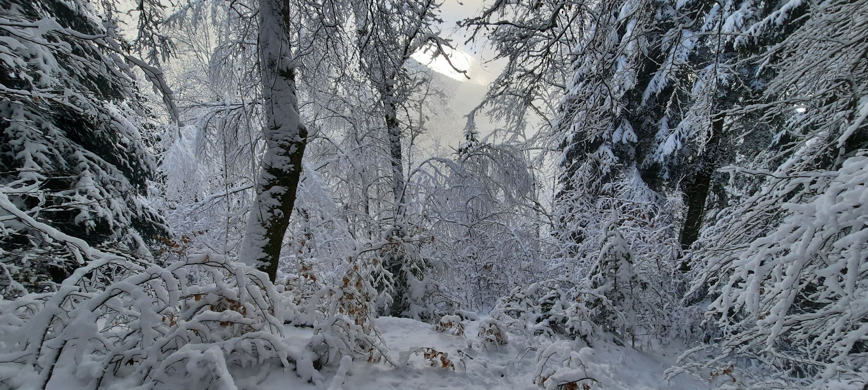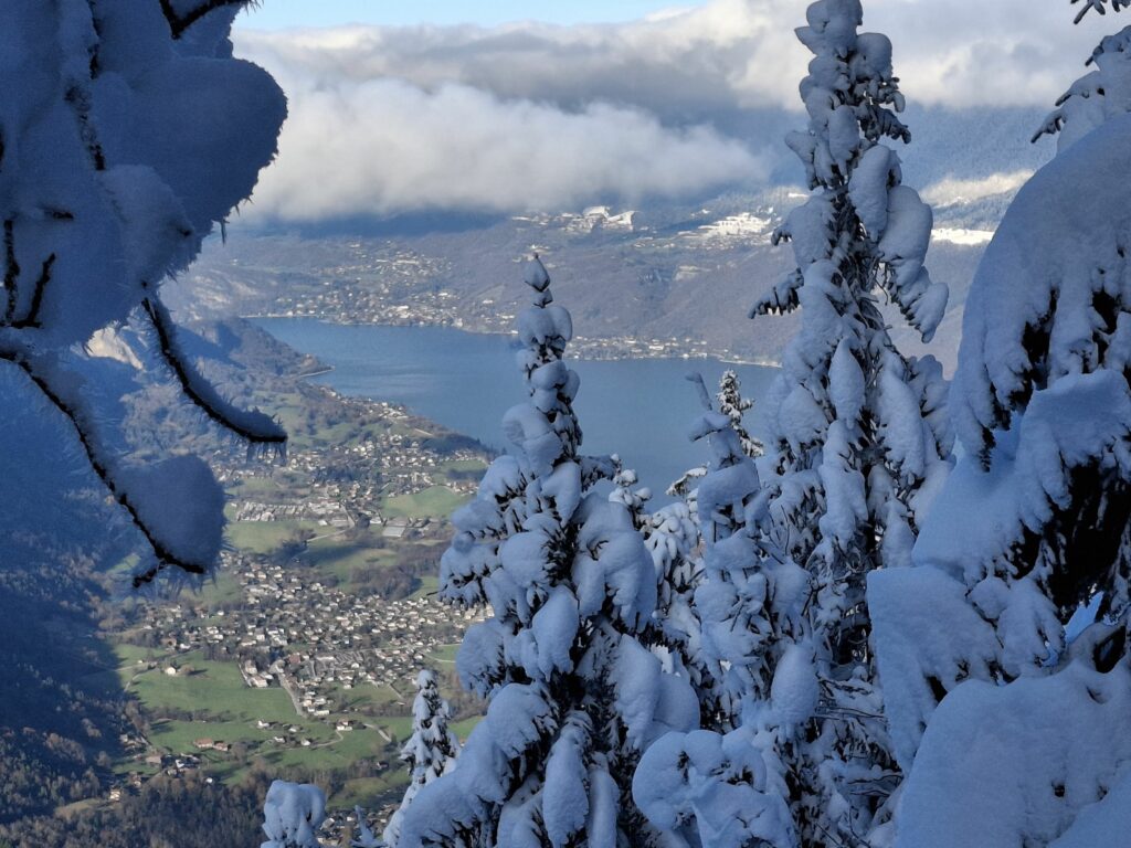 Partis du parking de Saury (Lathuile) vers 8h45, nous avons remonté toute la forêt et avons trouvé la neige en chemin et avons mis les raquettes vers 1300m.