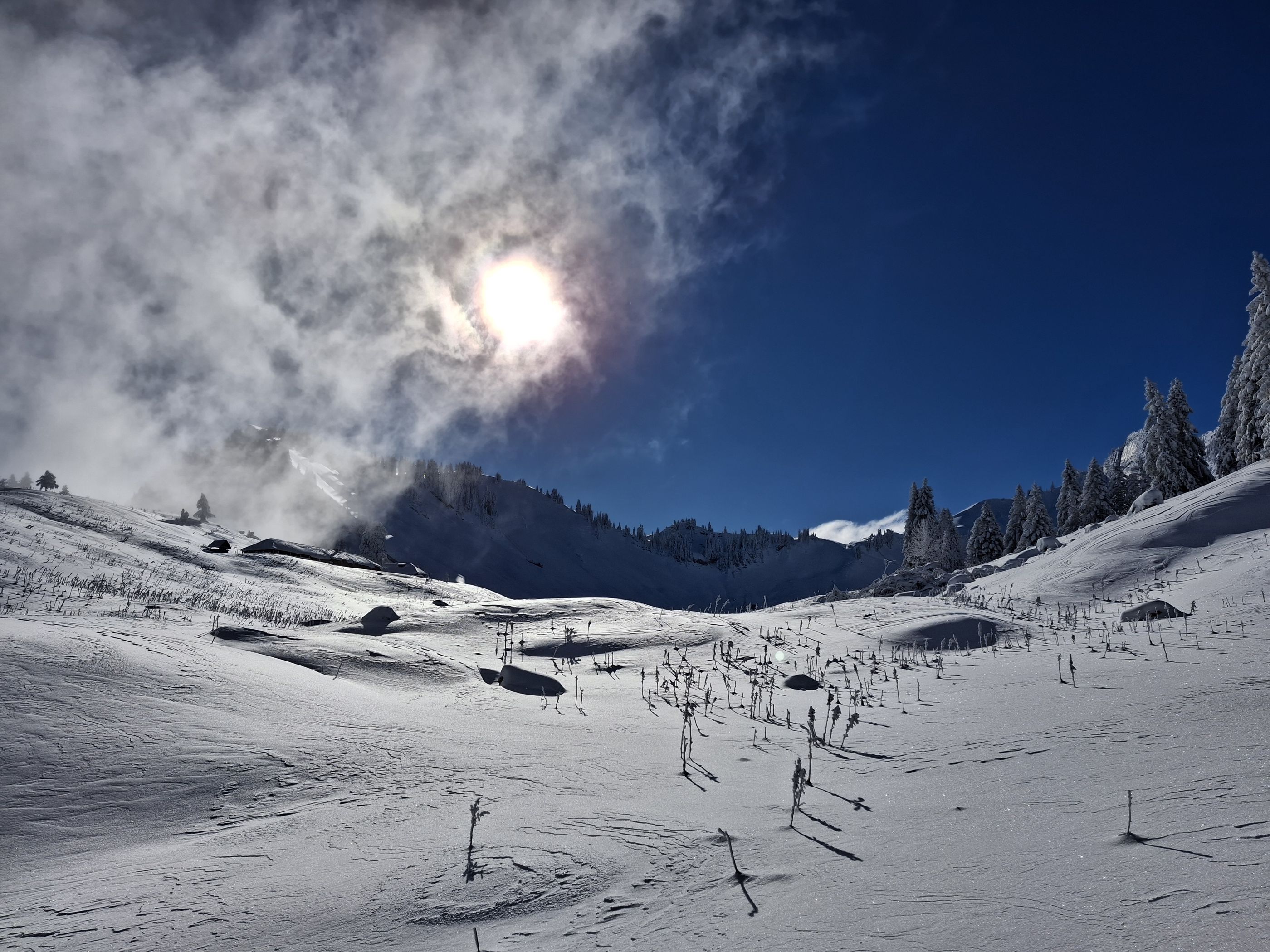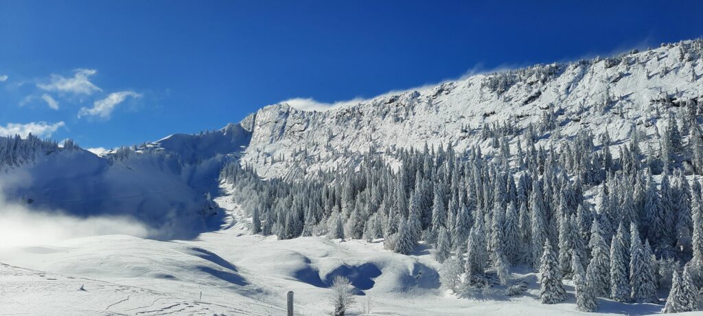 C’est pour des journées comme celle-ci que nous sommes heureux de faire de la raquette, dans un espace vierge de toutes traces et une très belle neige. Quelque soit le lieu, l’instant est magique, en sous bois, dans les alpages ou encore plus haut, si l’on respecte et gardons en mémoire les risques potentiels de se déplacer dans un milieu comme celui-ci, ce n’est que du bonheur….