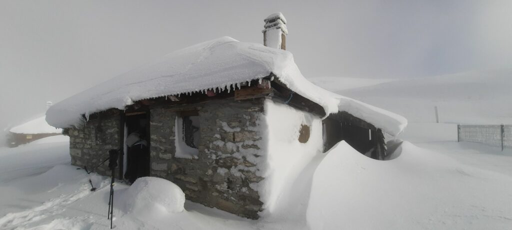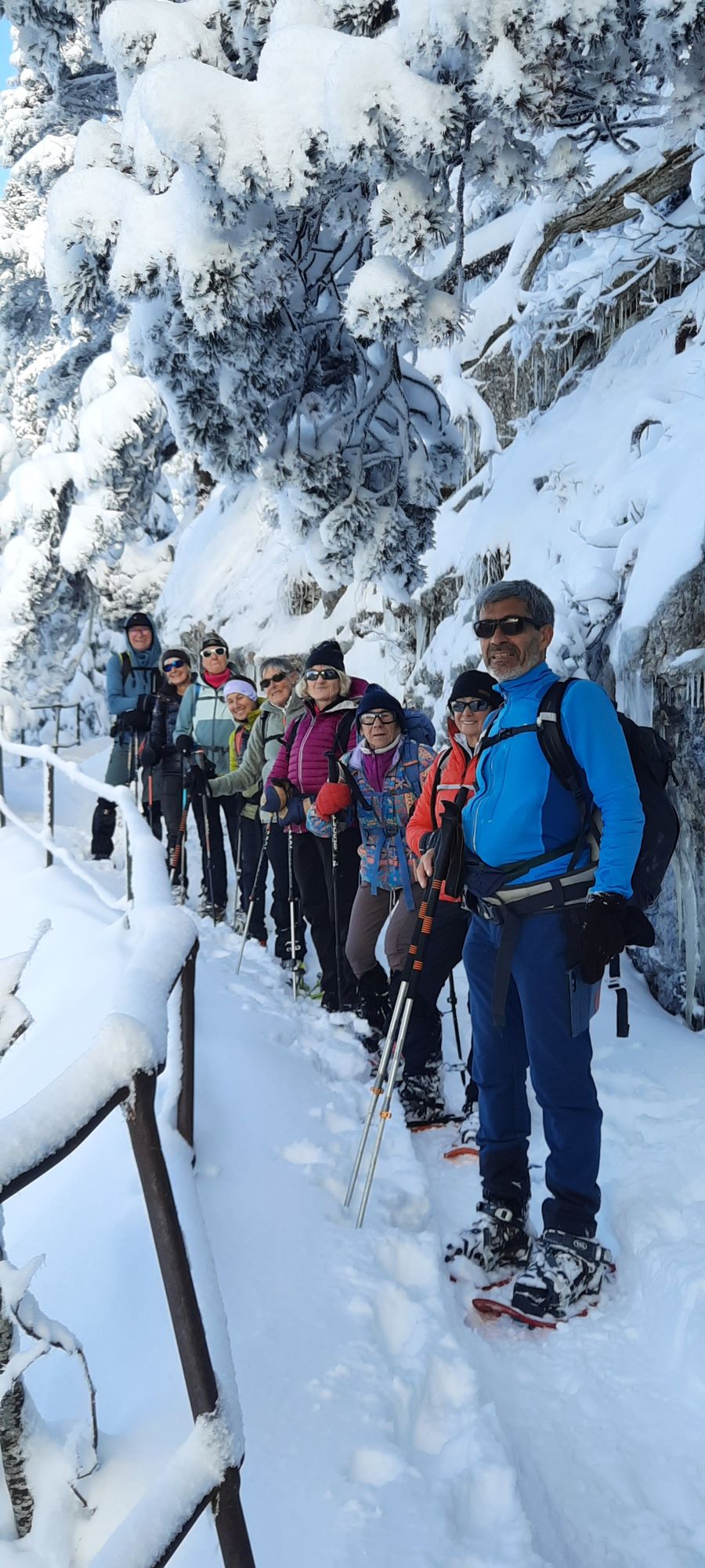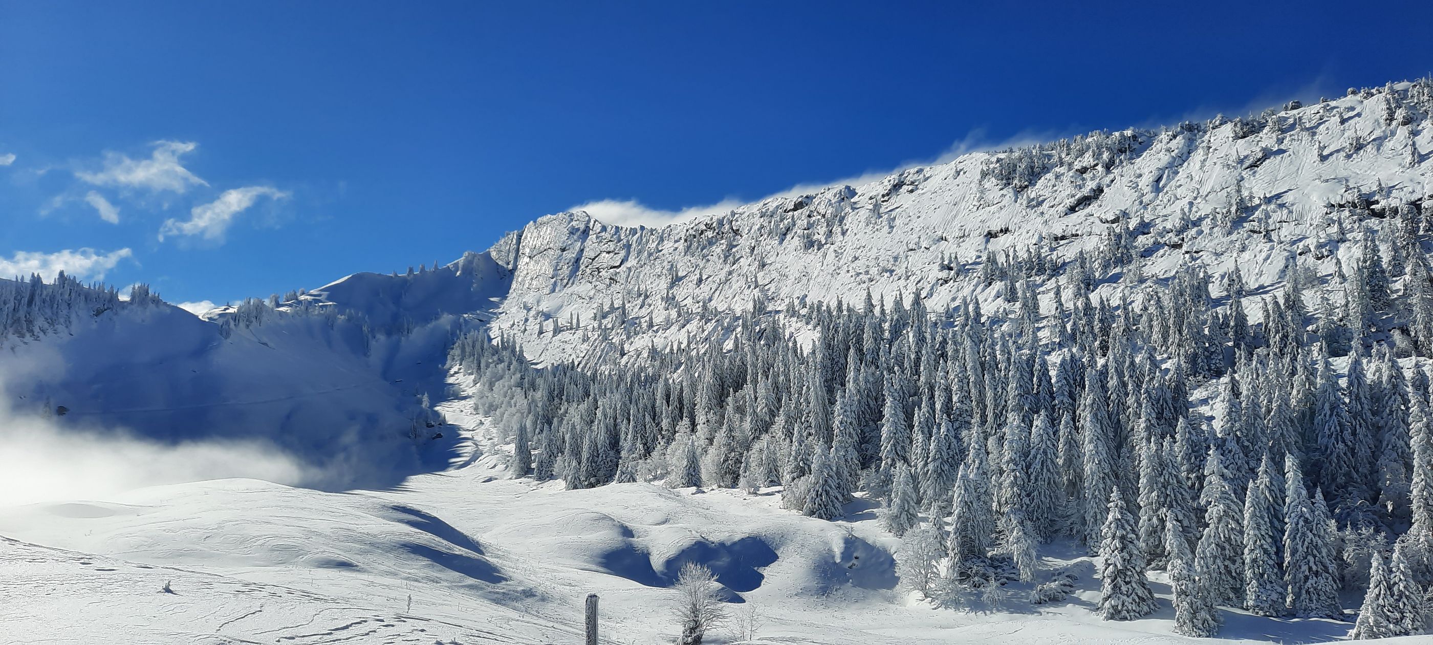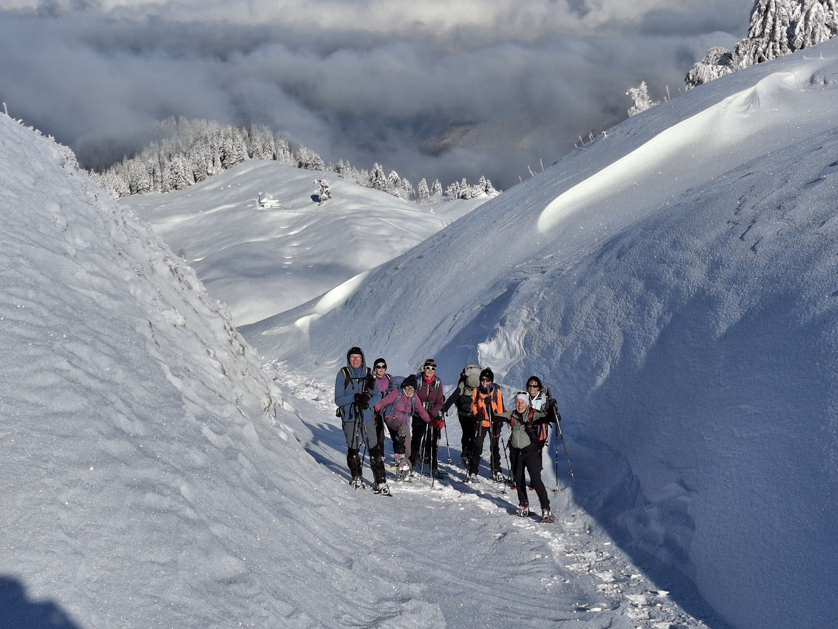 Arrivés au passage étroit avec les barrières de protection, la vue a commencée à s’ouvrir, sur le versant du lac dans un premier temps, puis plus haut sur le vallon de la Combe. Arrivés au chalet de la combe, la vue était magnifique. Nous avons ensuite remonté tout le vallon en restant sur la piste que nous devinions encore sous une épaisse couche de neige et avons rejoint le col vers 13h. Compte tenu de l’horaire et malgré un bon groupe de marcheur, le retard pris par une progression lente nous a obligés à s’arrêter là et de déjeuner sans poursuivre jusqu’à la croix, qui nous aurait mis en retard pour le retour.