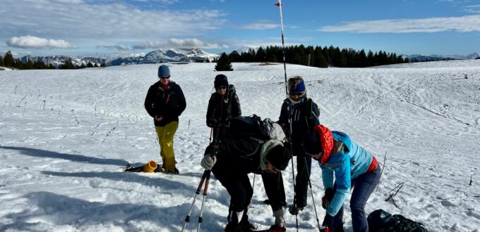 Après un topo sur les chances de survie, la connaissance et l’utilisation du DVA, la conduite à tenir en cas d’avalanche, les méthodes de recherche, de sondage, et de pelletage, nous sommes passés aux exercices de recherche (ça réchauffe !) sous le chalet nordique du Plateau, versant Est.