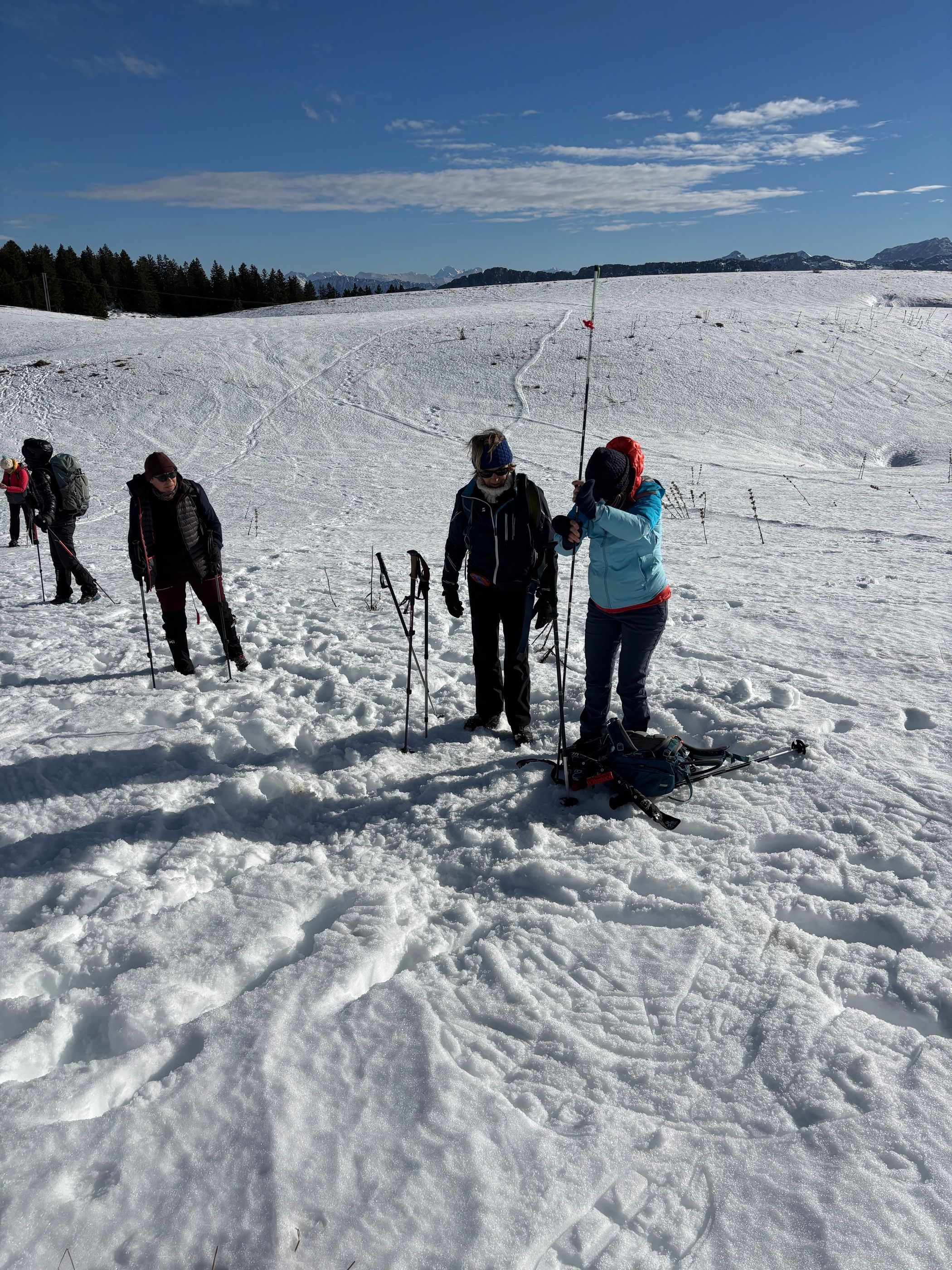 Après un topo sur les chances de survie, la connaissance et l’utilisation du DVA, la conduite à tenir en cas d’avalanche, les méthodes de recherche, de sondage, et de pelletage, nous sommes passés aux exercices de recherche (ça réchauffe !) sous le chalet nordique du Plateau, versant Est.