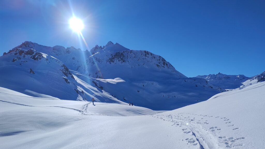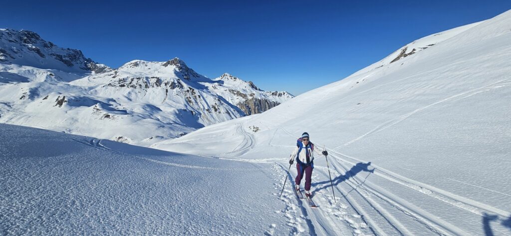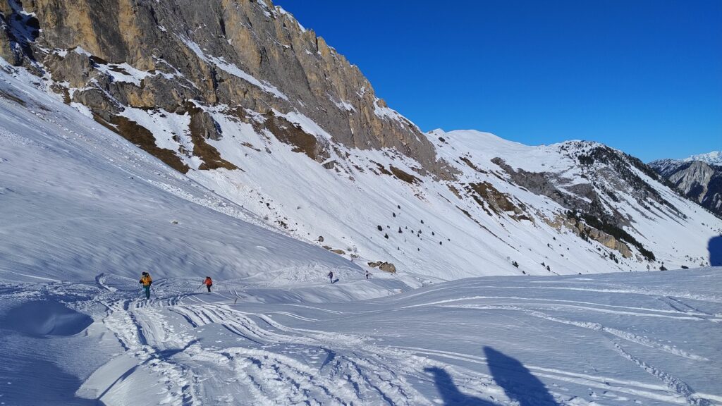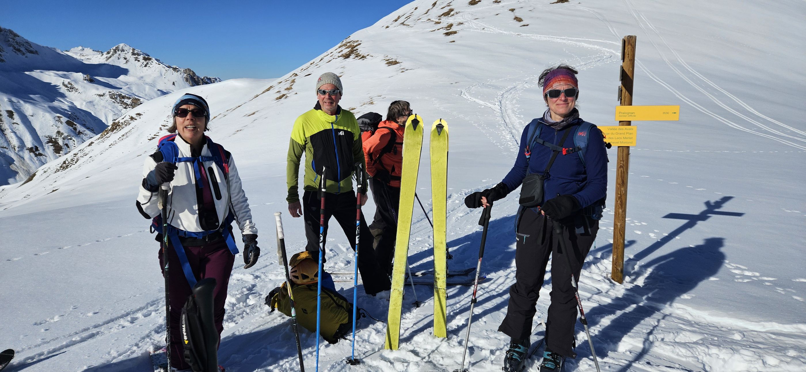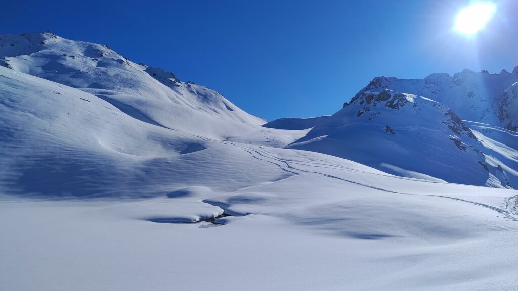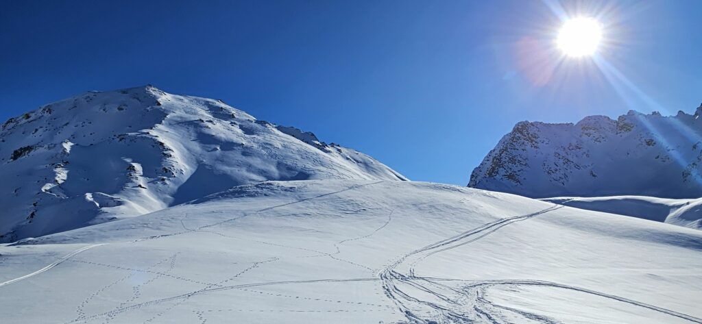 Nous montons en voiture jusqu’à Pralin-Mugnier où nous chaussons les skis en direction du vallon des avals sauvage et peu fréquenté. De la, en suivant la trace, nous montons jusqu’au col des Saulces (2456m). Le petit Mont-Blanc n’est plus très loin mais il est déjà 13h et nous n’avons pas encore mangé le picnic. Ce n’est pas grave, nous reviendrons…Le soleil brille et la neige ne manque pas, On commence à rêver de la descente qui n’a quasiment pas été tracée mais il s’avèrera difficile de trouver de bons passages, la neige n’est pas encore totalement décaillée…