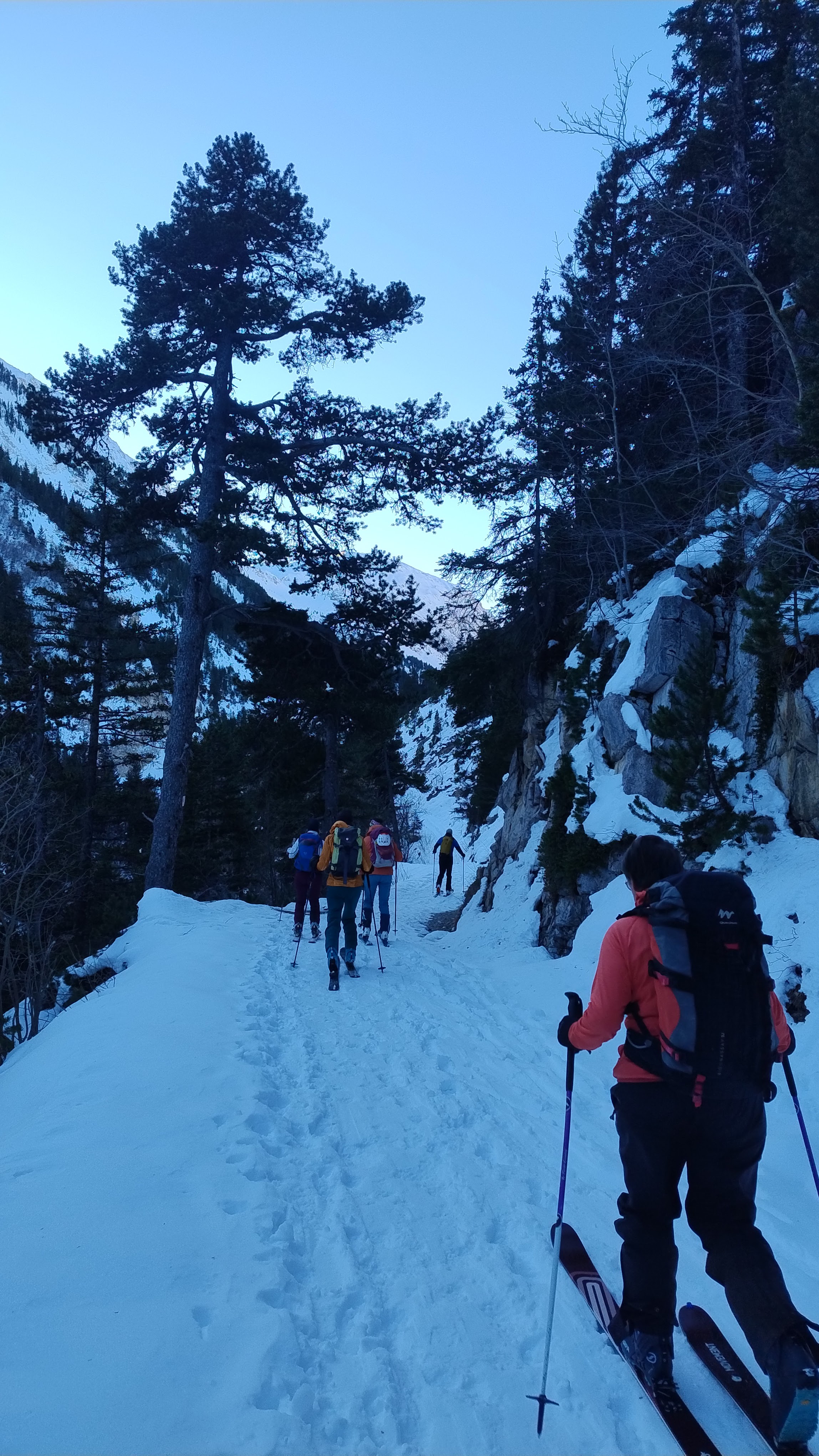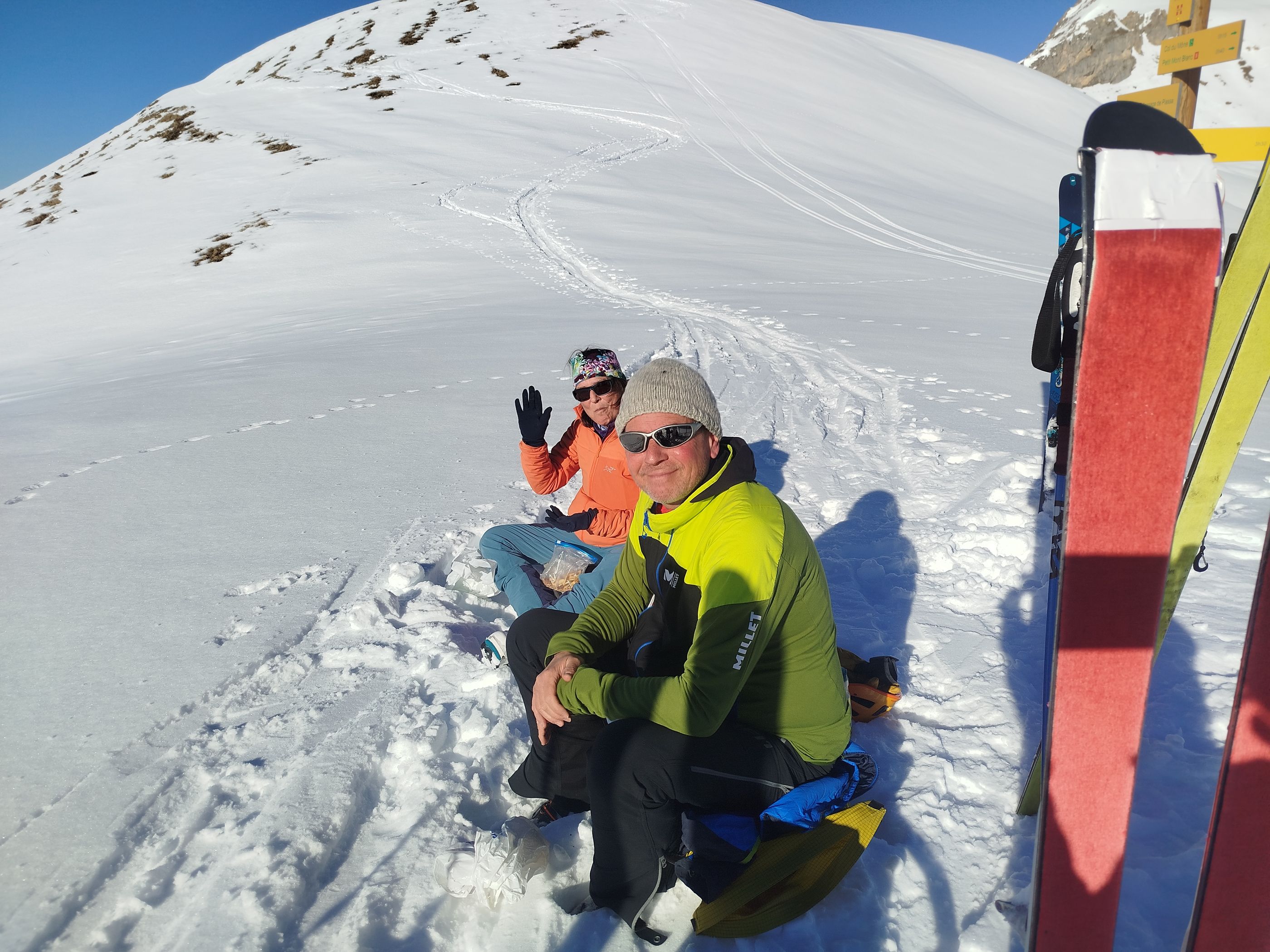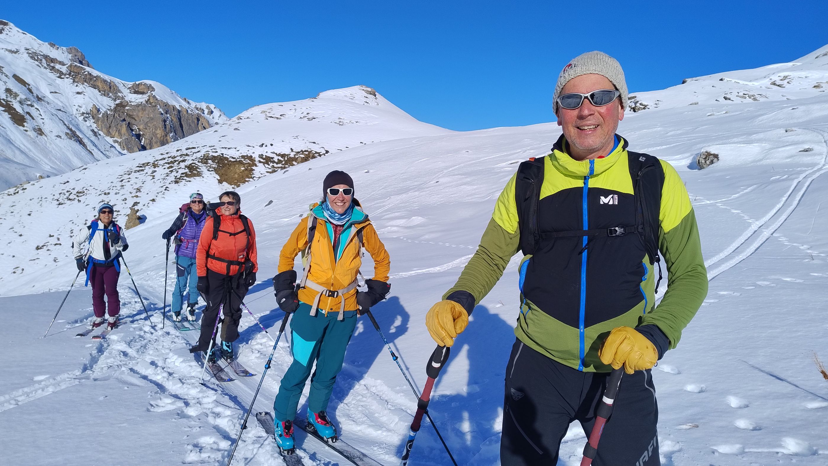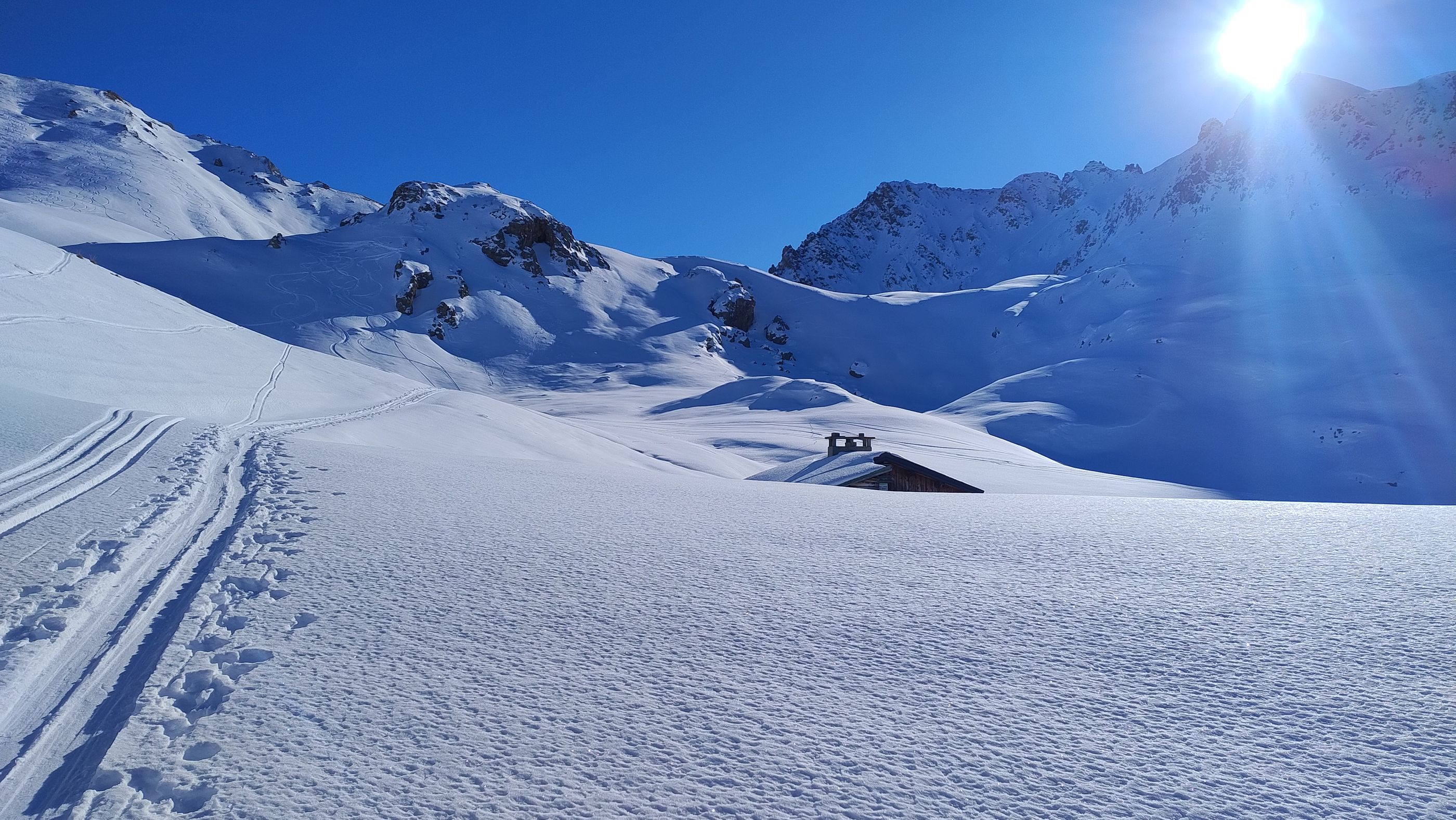 Nous montons en voiture jusqu’à Pralin-Mugnier où nous chaussons les skis en direction du vallon des avals sauvage et peu fréquenté. De la, en suivant la trace, nous montons jusqu’au col des Saulces (2456m). Le petit Mont-Blanc n’est plus très loin mais il est déjà 13h et nous n’avons pas encore mangé le picnic. Ce n’est pas grave, nous reviendrons…Le soleil brille et la neige ne manque pas, On commence à rêver de la descente qui n’a quasiment pas été tracée mais il s’avèrera difficile de trouver de bons passages, la neige n’est pas encore totalement décaillée…