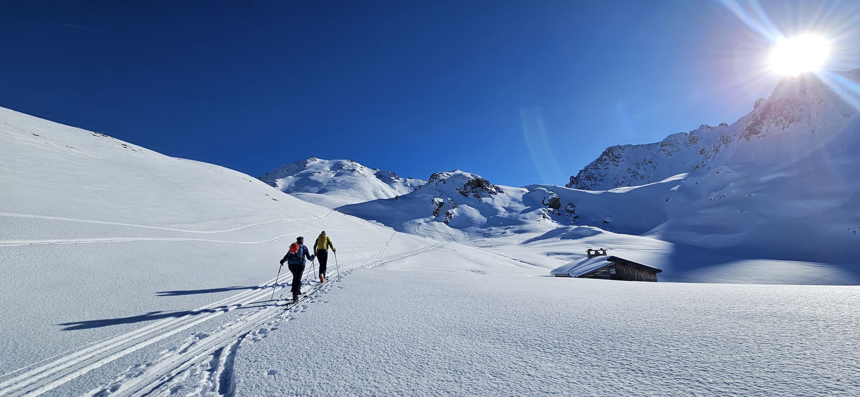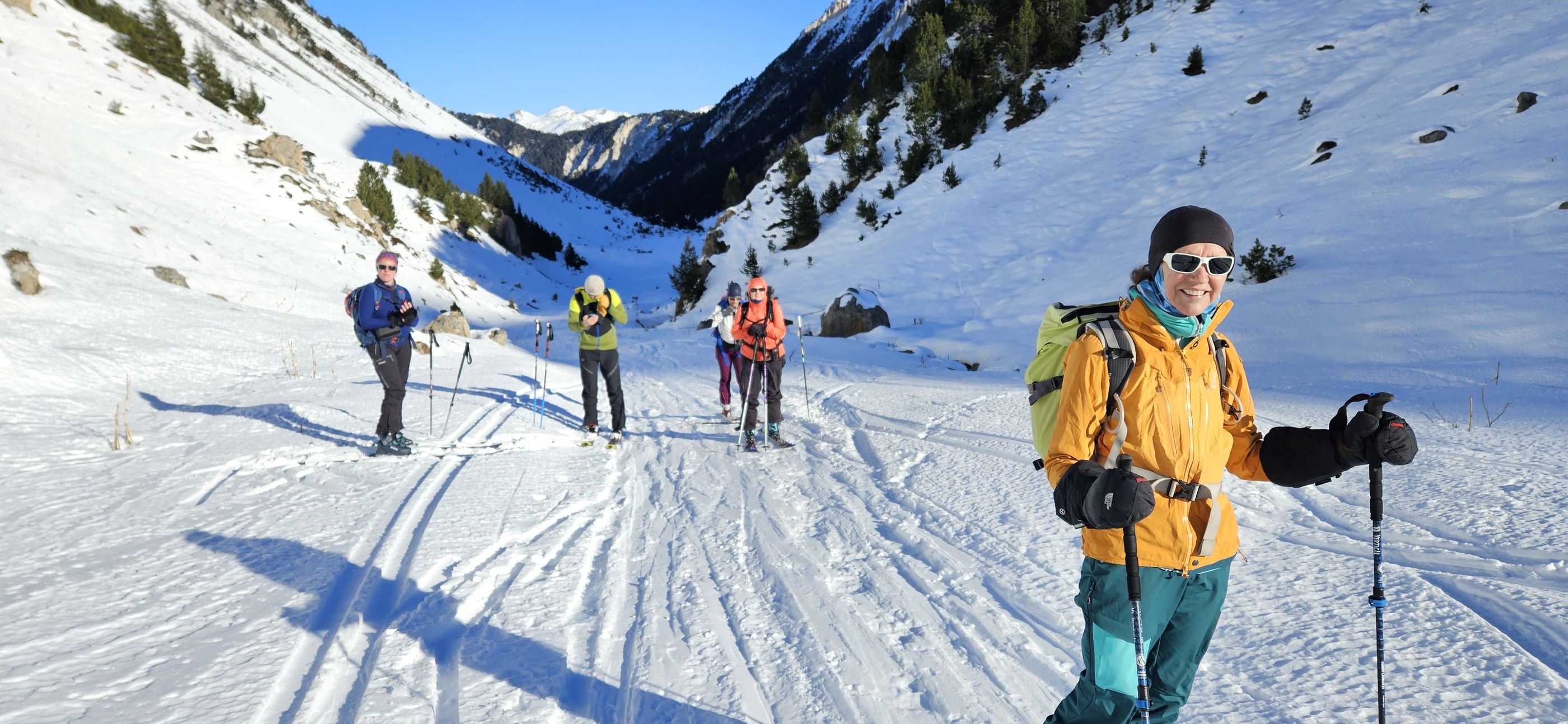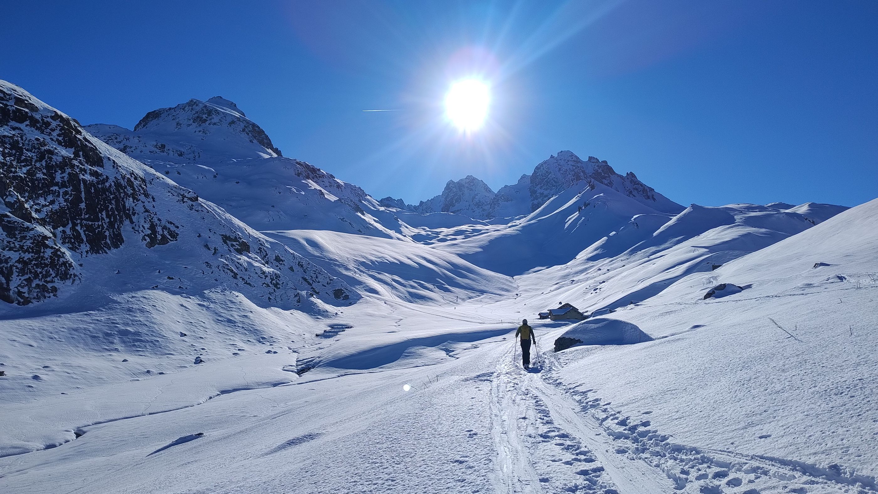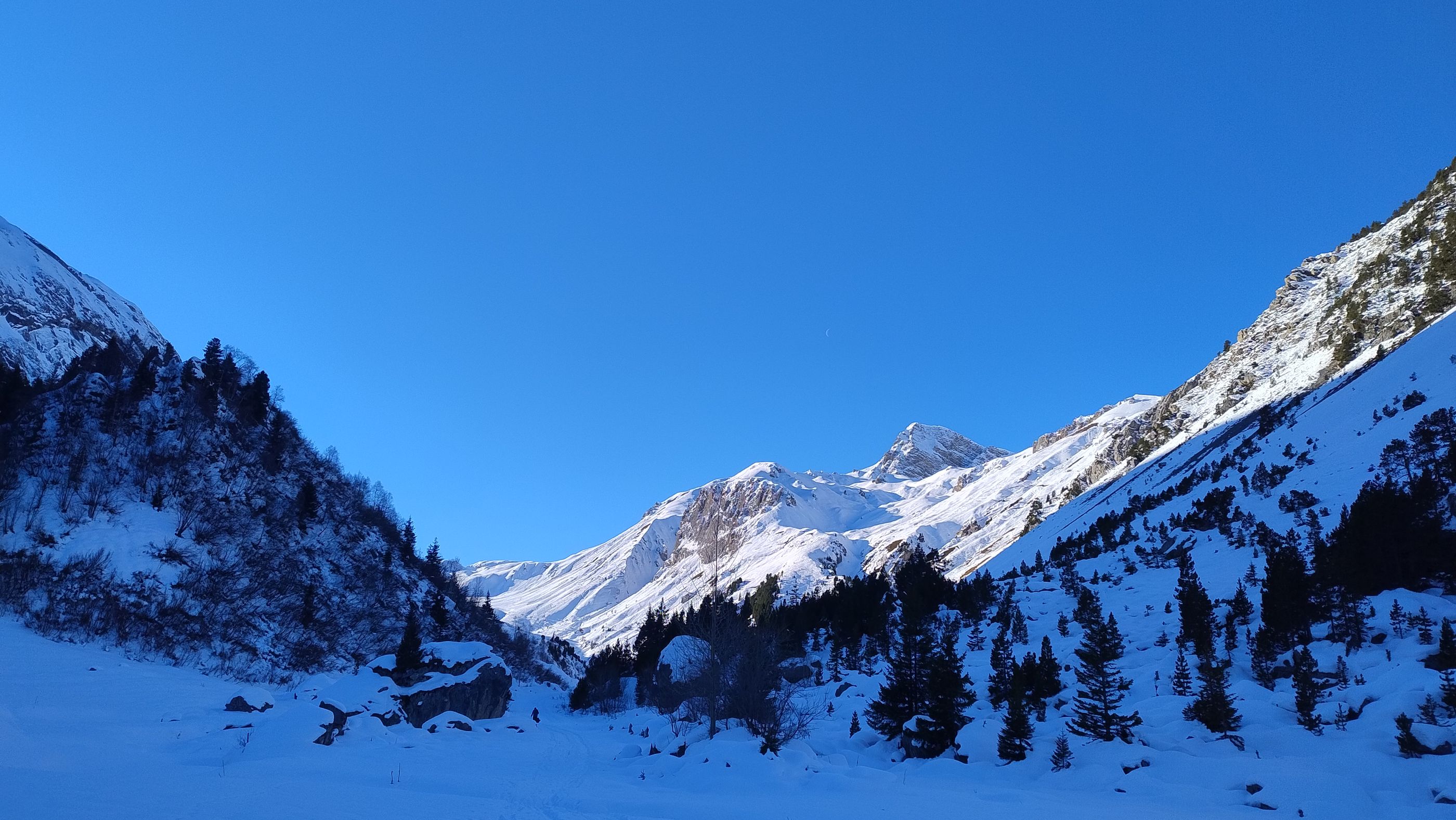 Nous montons en voiture jusqu’à Pralin-Mugnier où nous chaussons les skis en direction du vallon des avals sauvage et peu fréquenté. De la, en suivant la trace, nous montons jusqu’au col des Saulces (2456m). Le petit Mont-Blanc n’est plus très loin mais il est déjà 13h et nous n’avons pas encore mangé le picnic. Ce n’est pas grave, nous reviendrons…Le soleil brille et la neige ne manque pas, On commence à rêver de la descente qui n’a quasiment pas été tracée mais il s’avèrera difficile de trouver de bons passages, la neige n’est pas encore totalement décaillée…