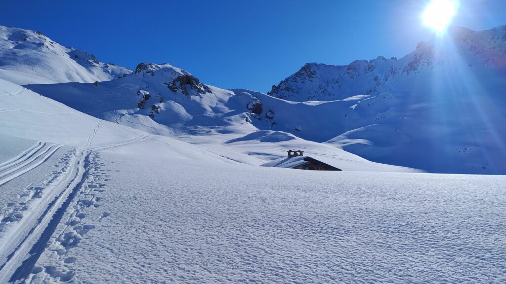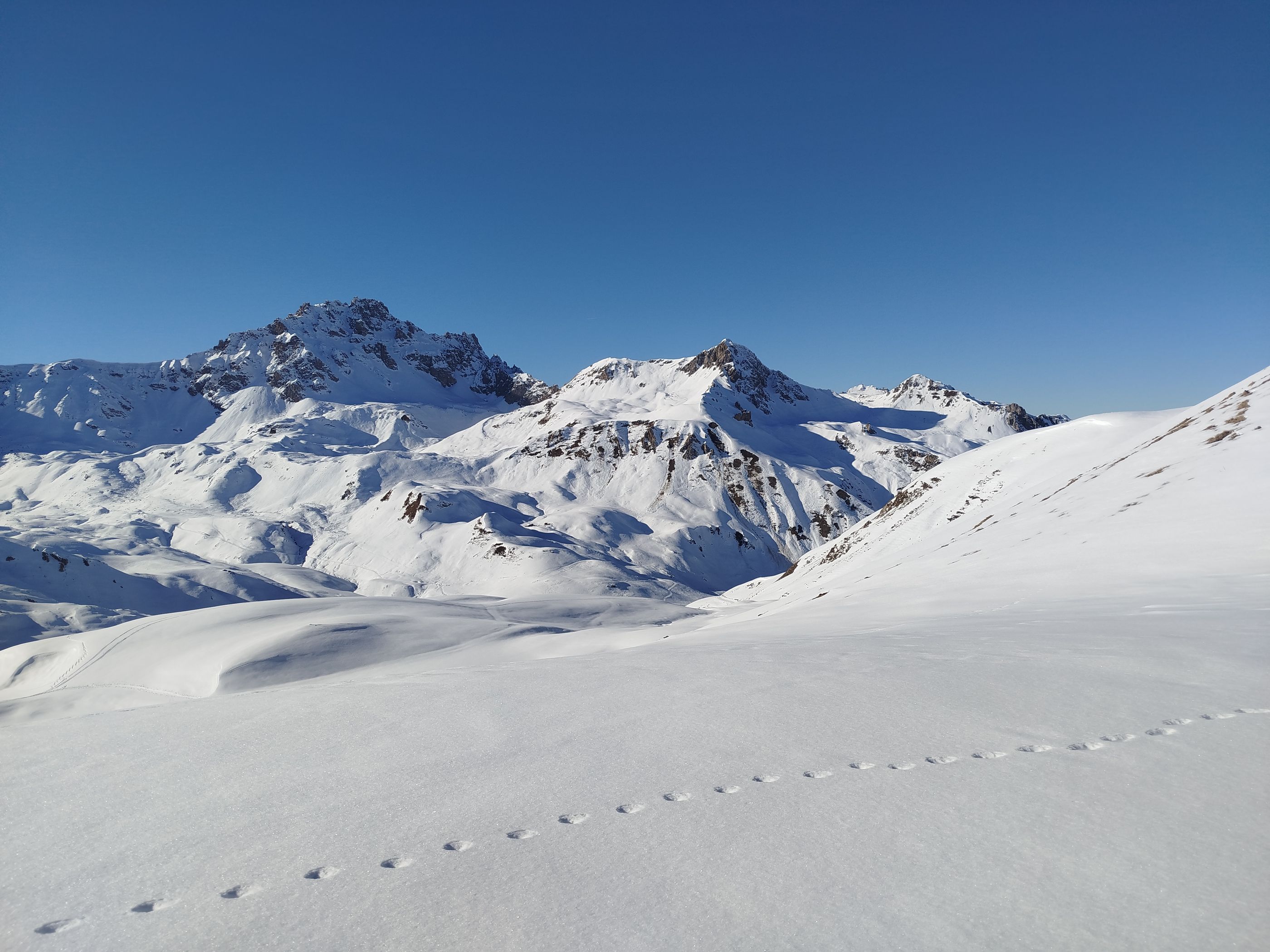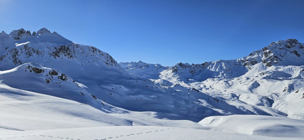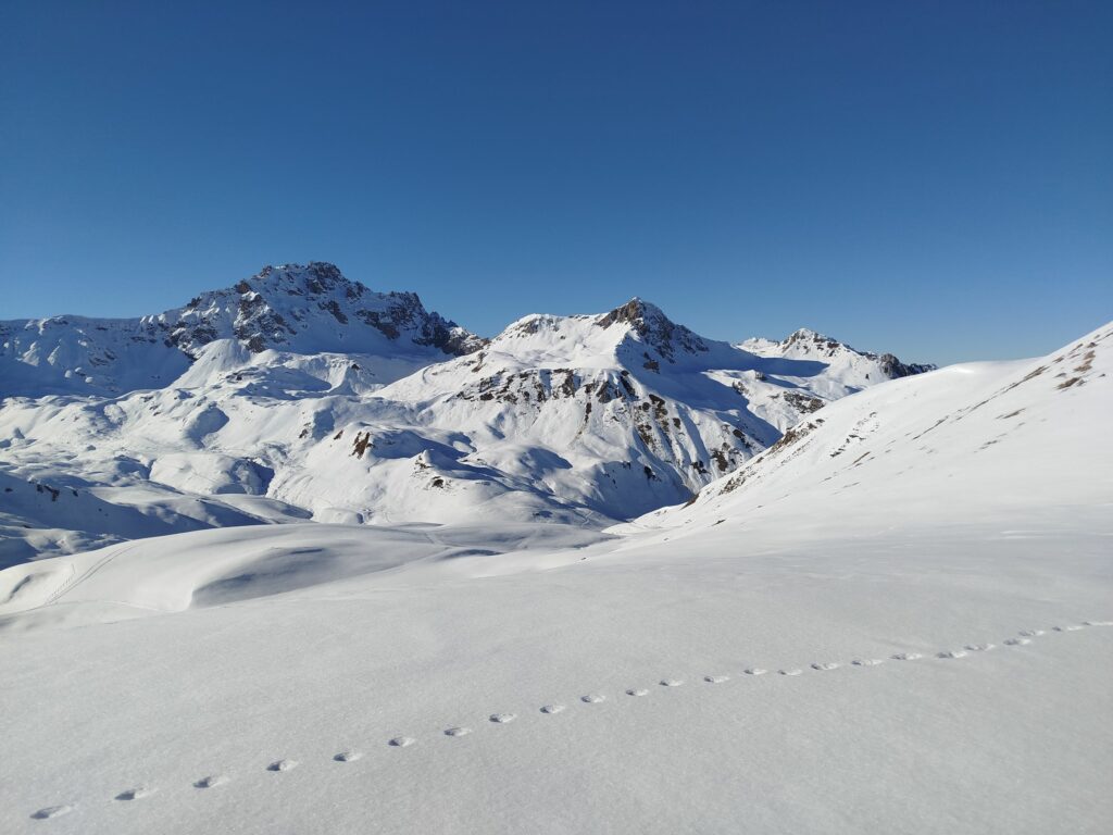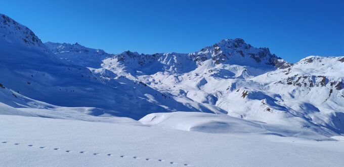 Peu de neige au Praz d’où nous avions prévu de débuter la randonnée et il y a déjà beaucoup de skieurs dans la station alors que la saison d’hiver commence à peine…alors on déclenche le plan B qui se révélera être bien meilleur que le plan A.