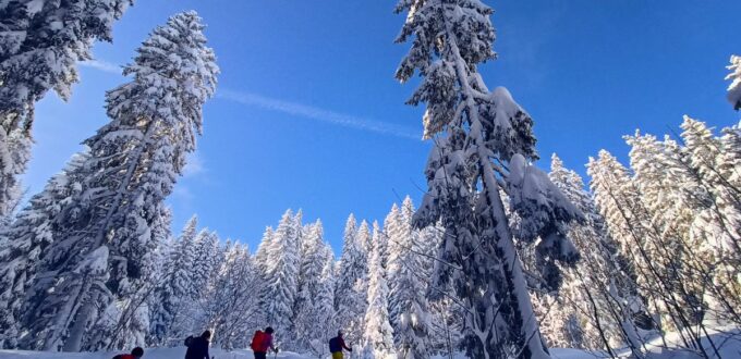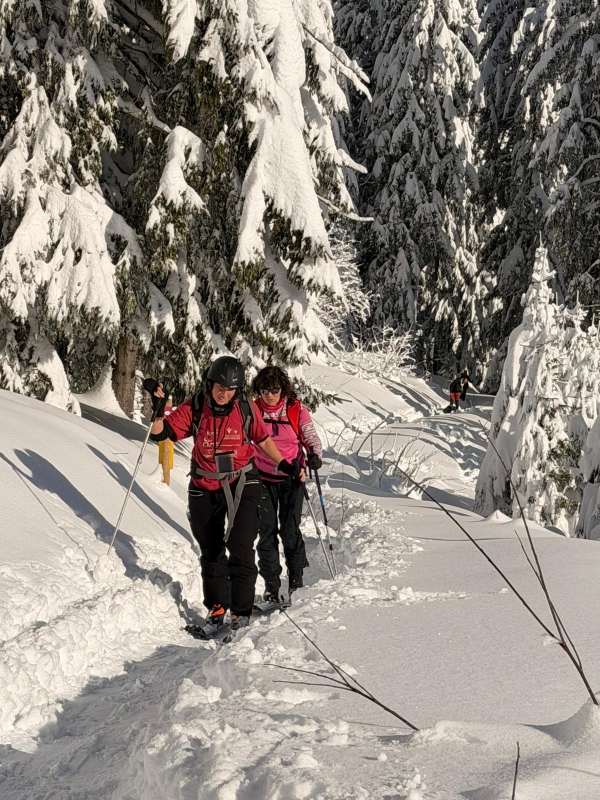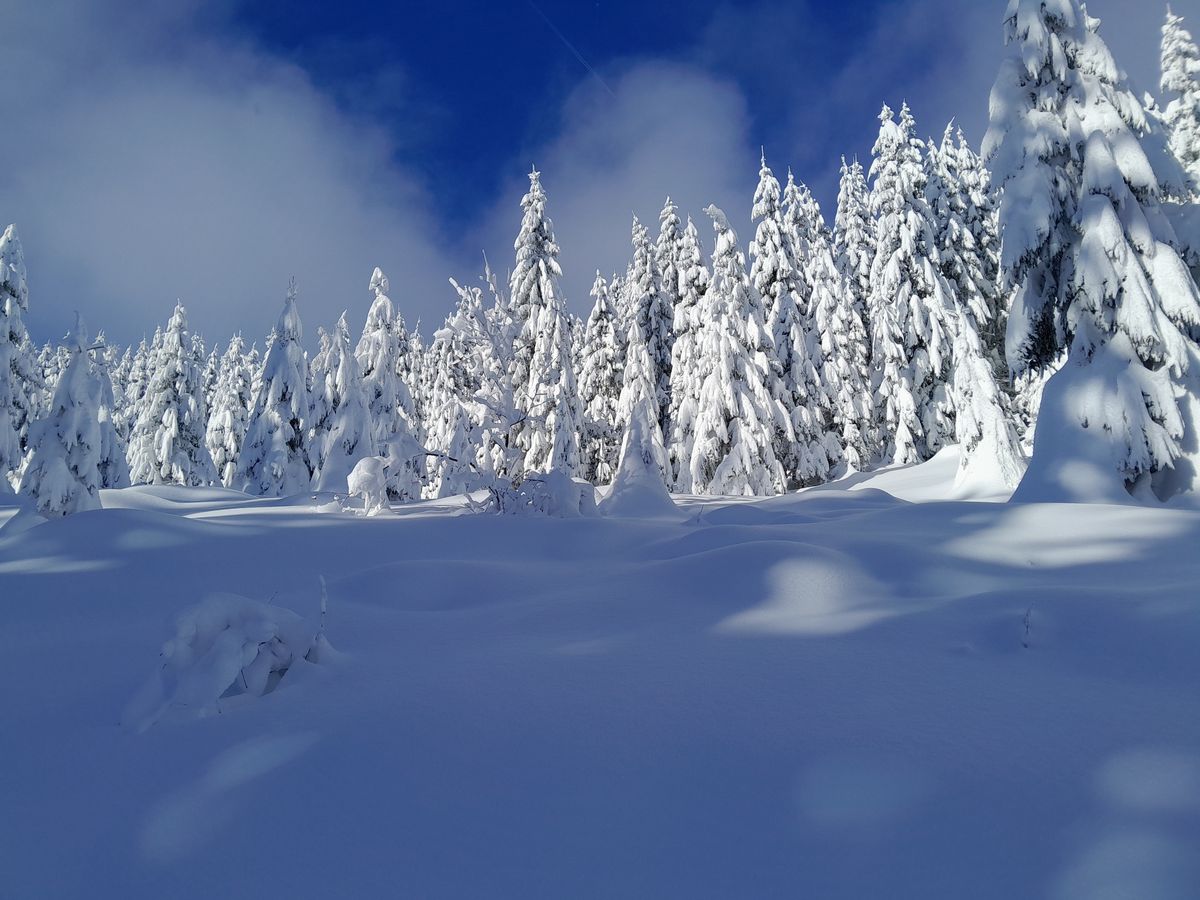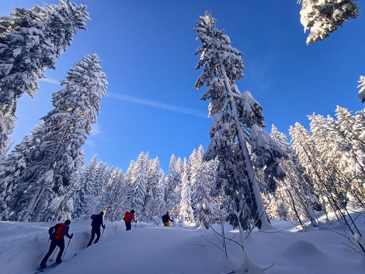 A partir du parking de la Cry nous avons emprunté les itinéraires balisés de ski de rando Le Crève-Coeur (larges pistes de randonnée) et le Plan des Dames (trace plus sauvage) en deux montées-descentes pour atteindre le sommet des Salles 1757m et la croix des Salles 1704m, dénivelée cumulée de 1050m.