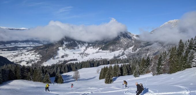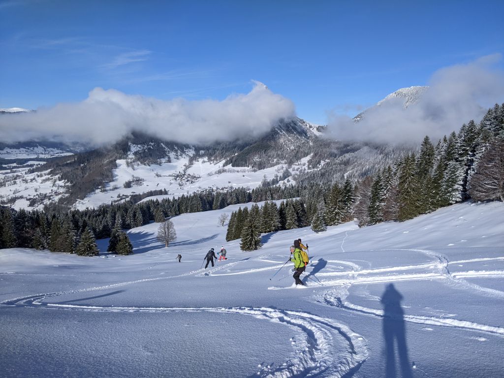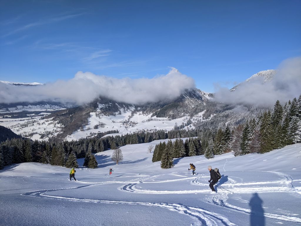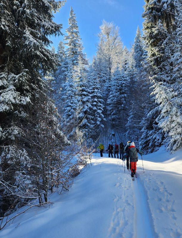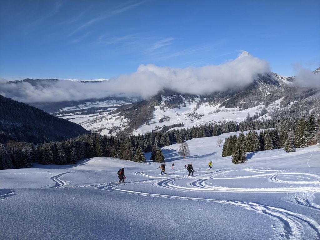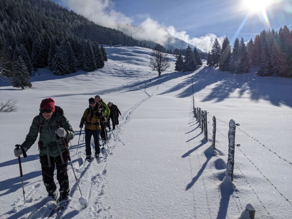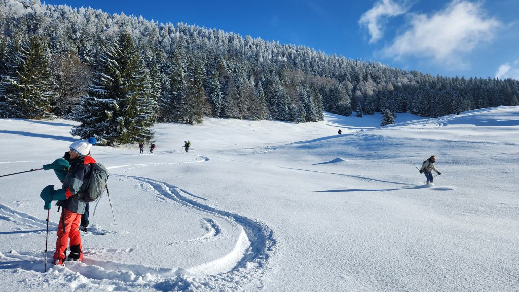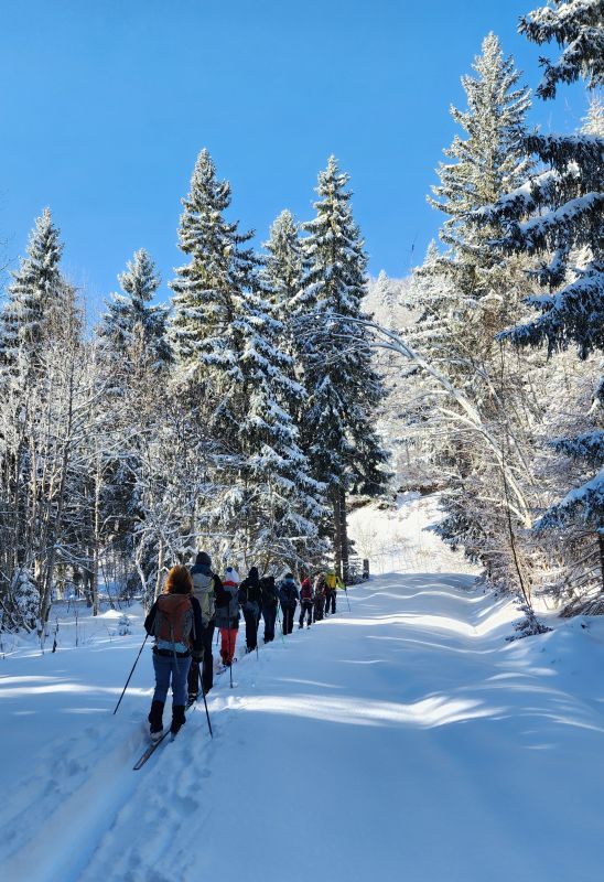 Très belle neige et bonne météo ce dimanche 11 janvier, pour une magnifique randonnée sur les pistes forestières autour du col du Plane un peu gâchée par des traces de voitures mais les dix participants ont pu profiter de la descente des prés de Montermino pour s’essayer au télémark.