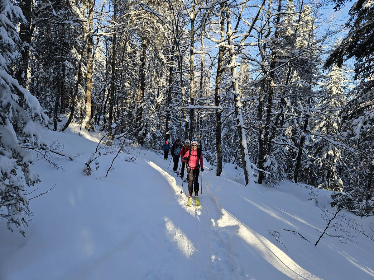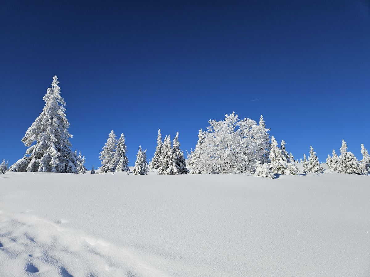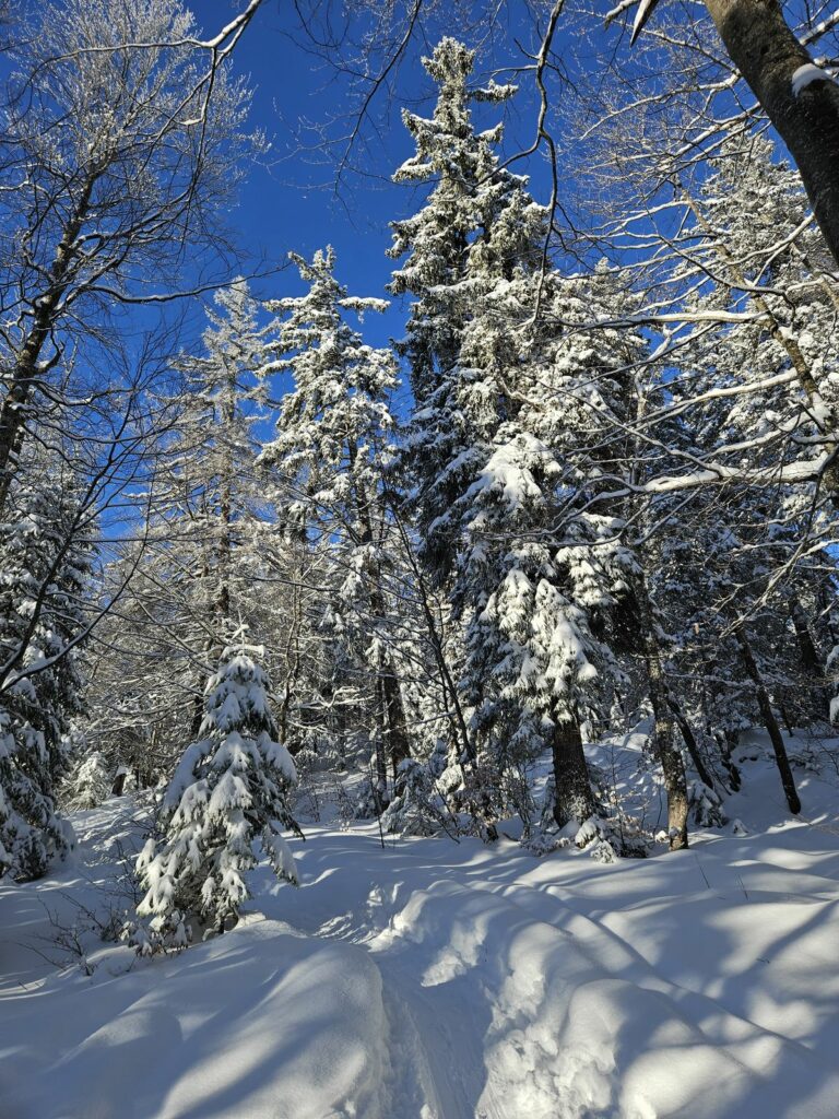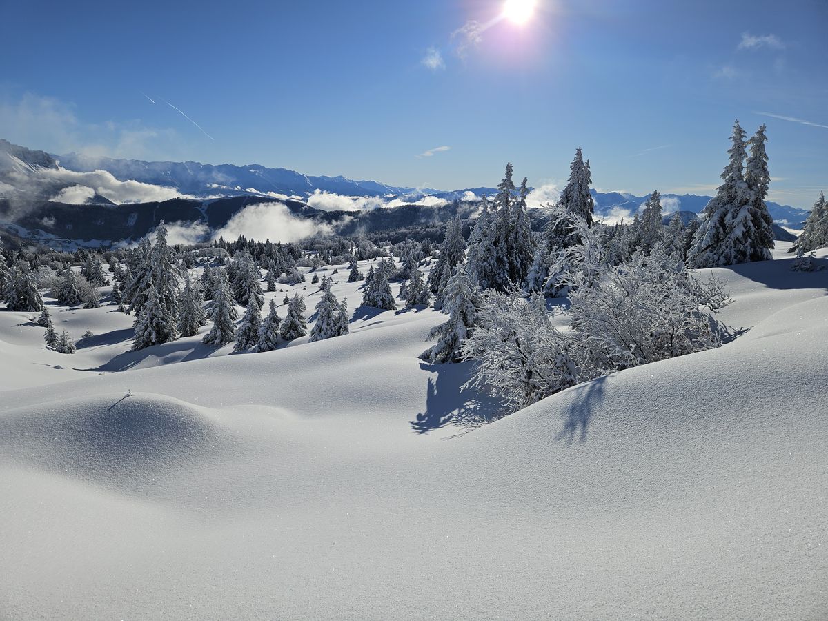 Début du parcours dans la forêt dans une ambiance feutrée. En sortie de forêt nous découvrons un paysage immaculé avec un panorama exceptionnel.
