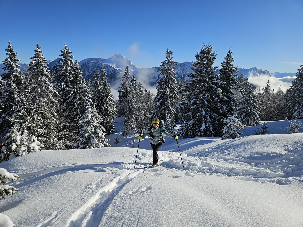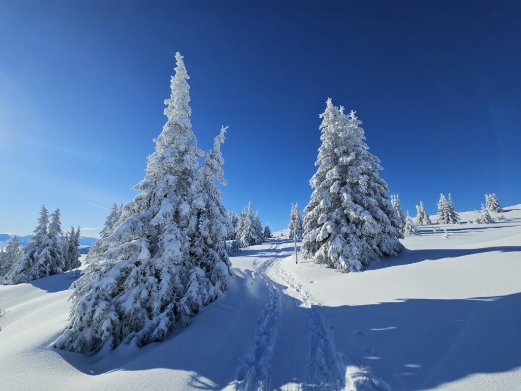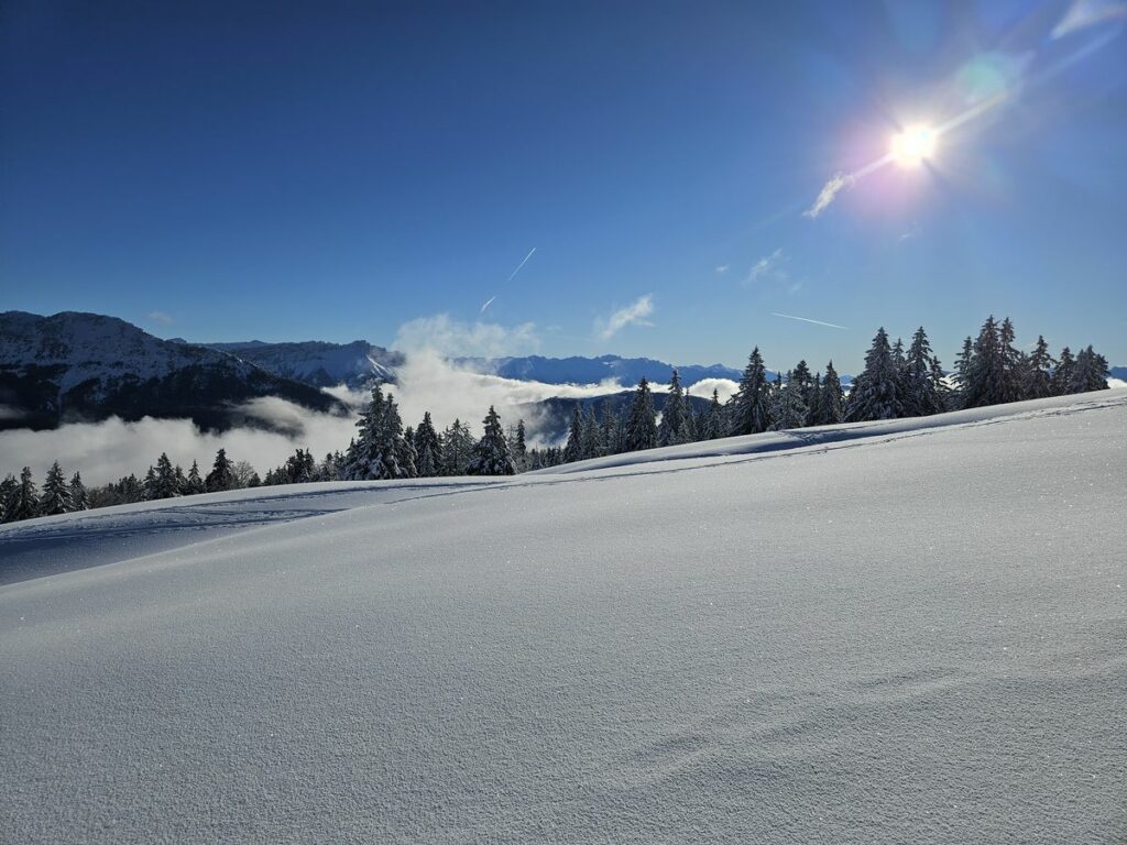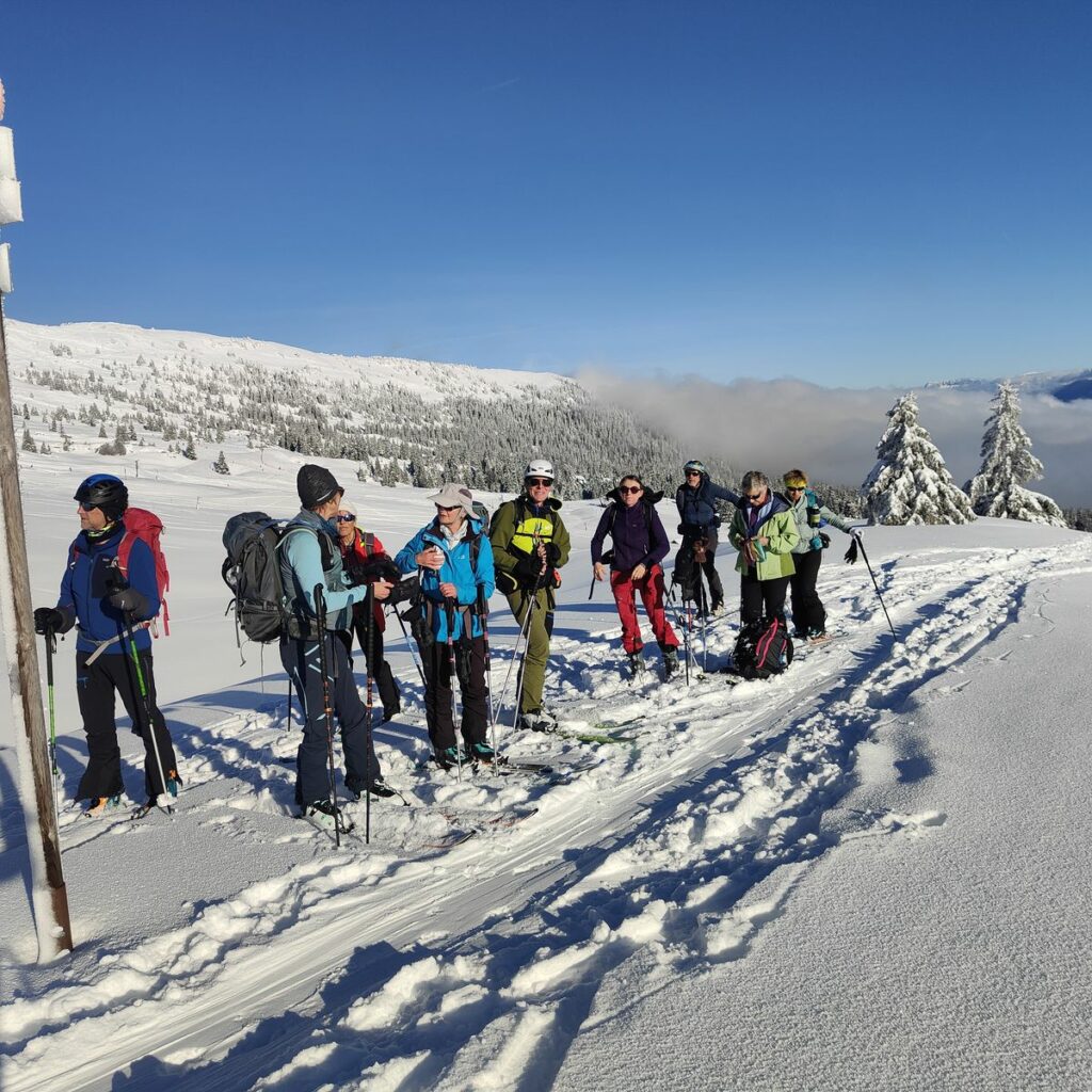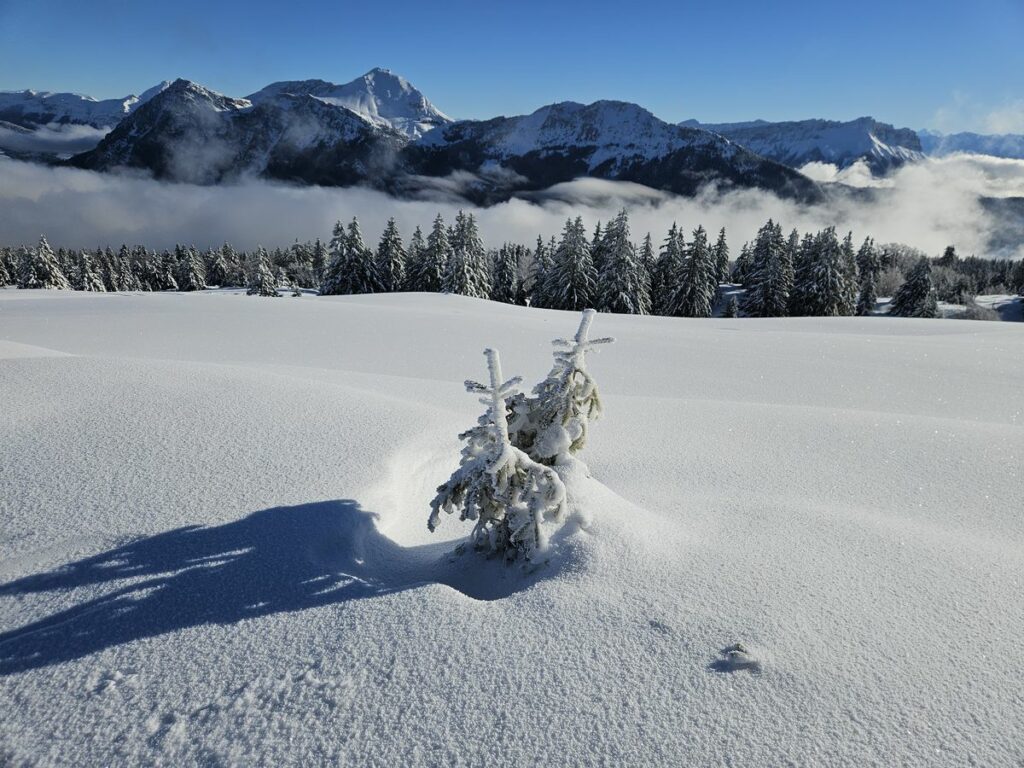 Début du parcours dans la forêt dans une ambiance feutrée. En sortie de forêt nous découvrons un paysage immaculé avec un panorama exceptionnel.
