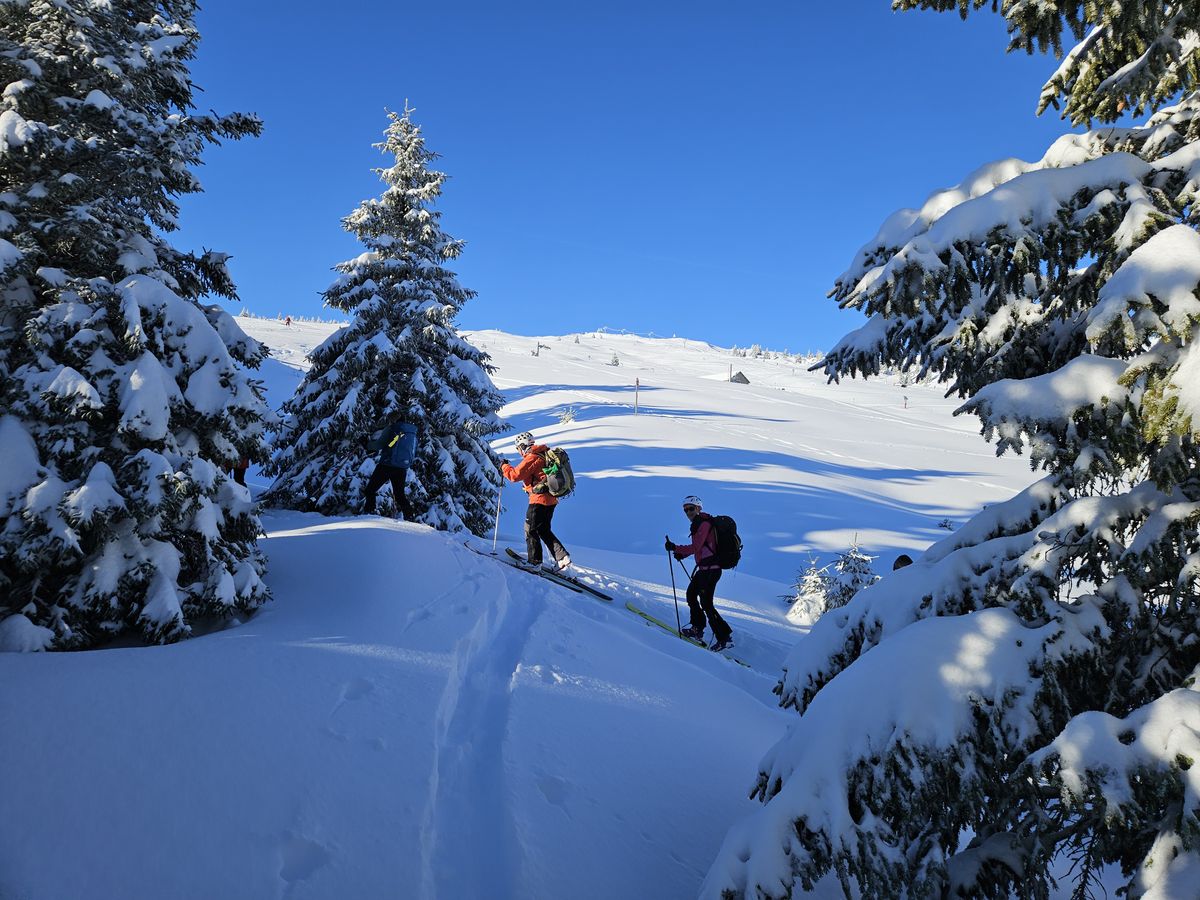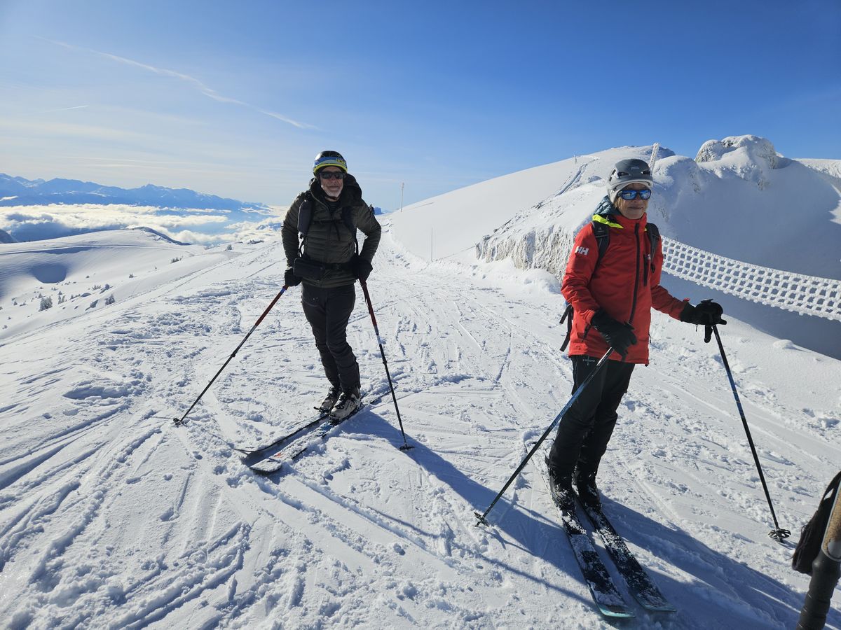Descente en profitant d’une quarantaine de centimètres de poudre avant de retrouver les pistes sur une neige douce et facile à skier.