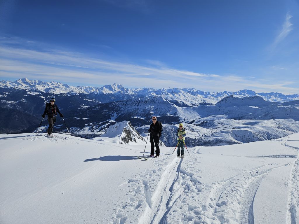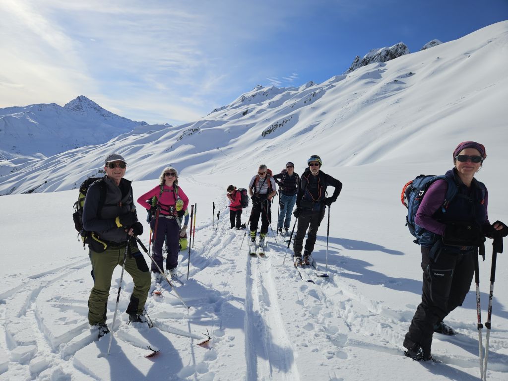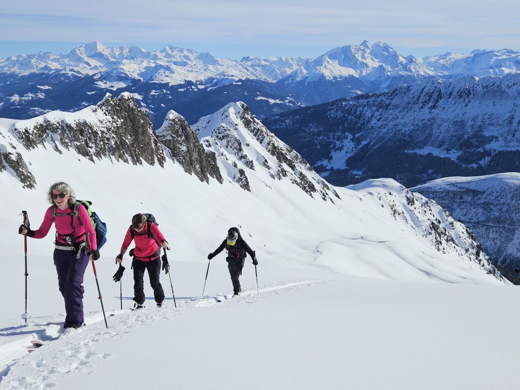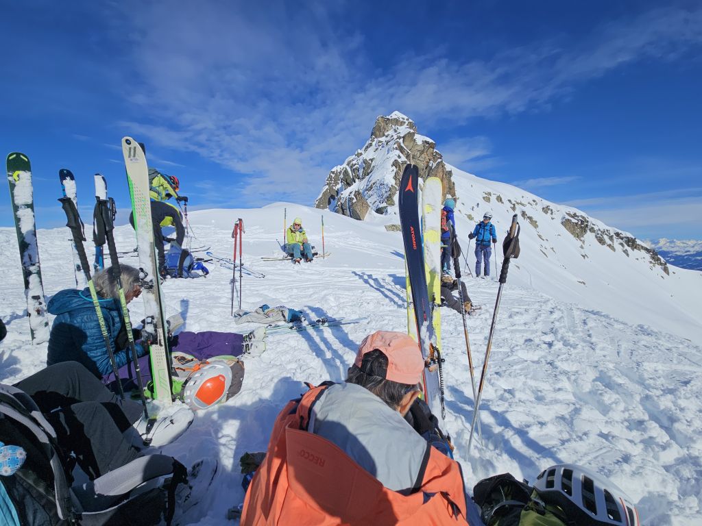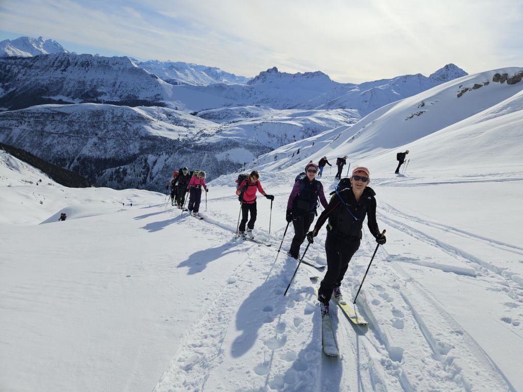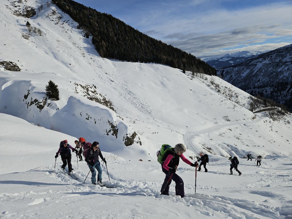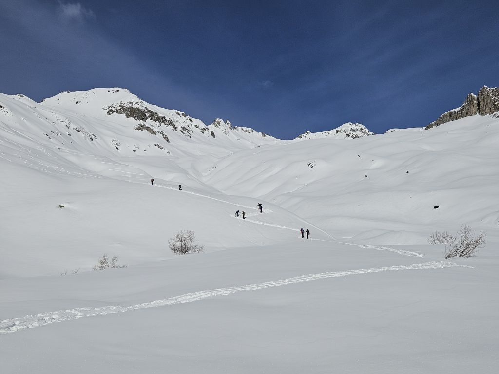 Nous étions 9 ce dimanche 1er février au départ de Celliers Dessus. Le thermomètre était à peine en dessous de zéro et le ciel légèrement nuageux. A l’arrivée en vue de la combe des Plans les contreforts enneigés du Grand Château commencent à se détacher sur un ciel qui vire au bleu. Nous ne sommes pas les seuls dans ce paysage recouvert d’une bonne couche de neige fraîche. Heureusement la trace de montée est déjà faite, il n’est pas facile d’en sortir pour doubler les groupes plus lents. Le ciel est définitivement bleu et la chaleur se fait sentir par moment. Nous progressons à un rythme régulier avec quelques pauses pour arriver au col juste avant 12h30. Nous avons bien profité du soleil et du panorama pour manger avant qu’un petit vent ne se lève et le ciel se voile légèrement. Nous commençons alors une descente où tout le monde peut faire sa trace dans une neige bien préservée et encore poudreuse suivant l’exposition.
