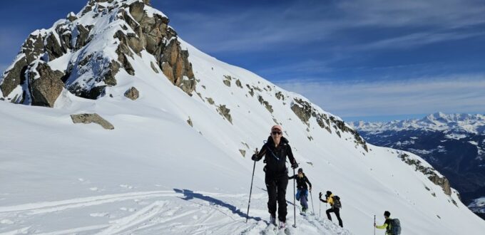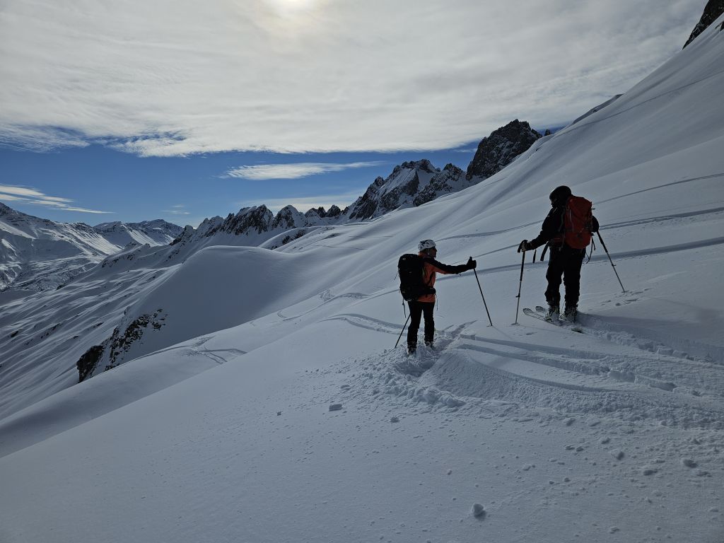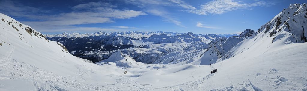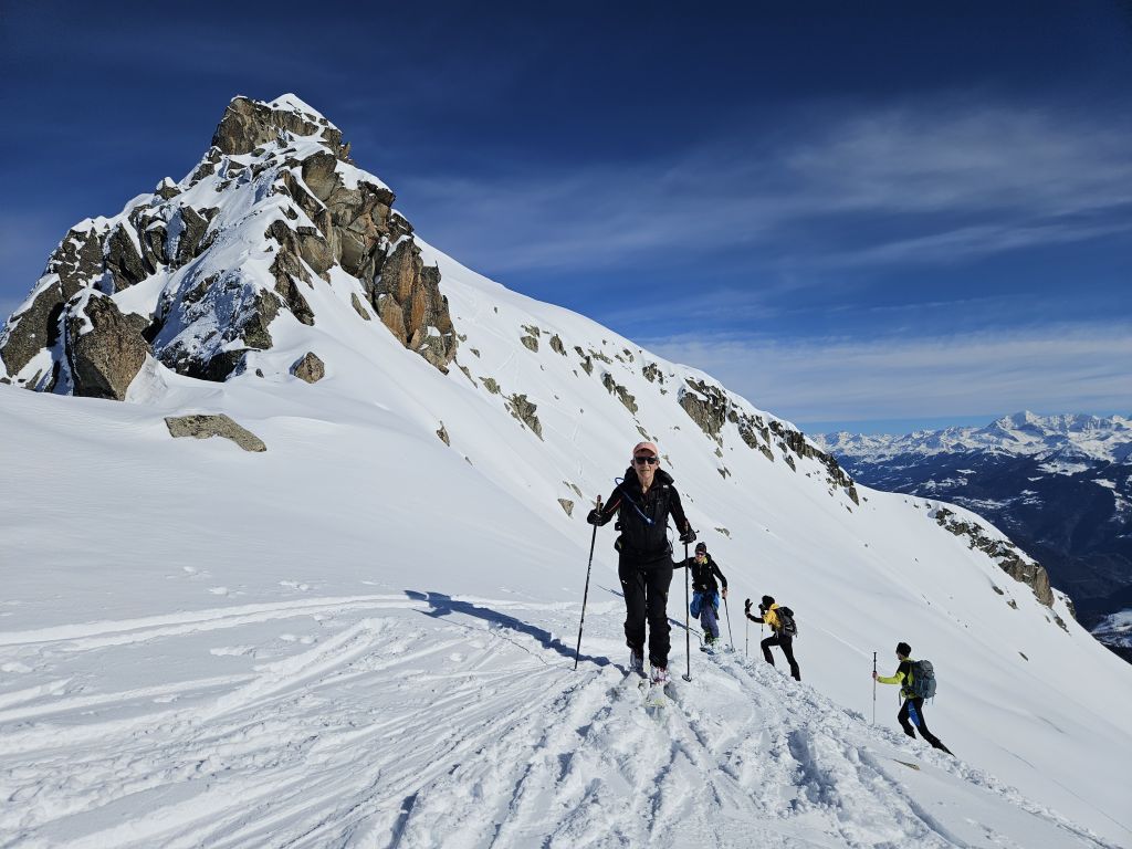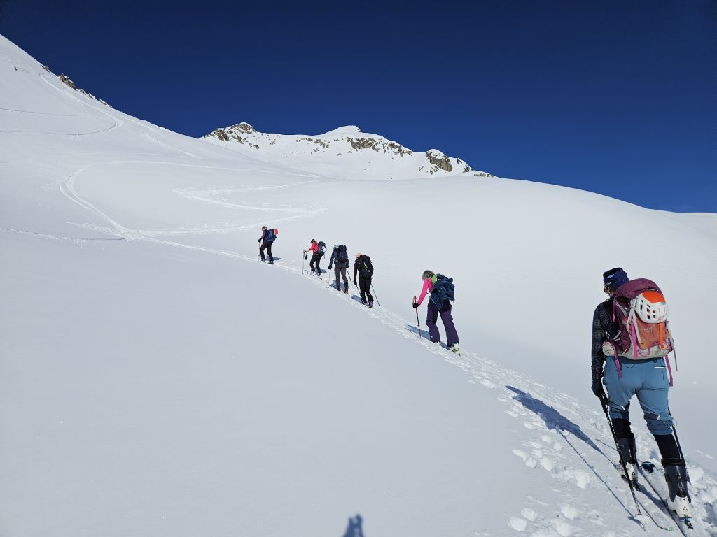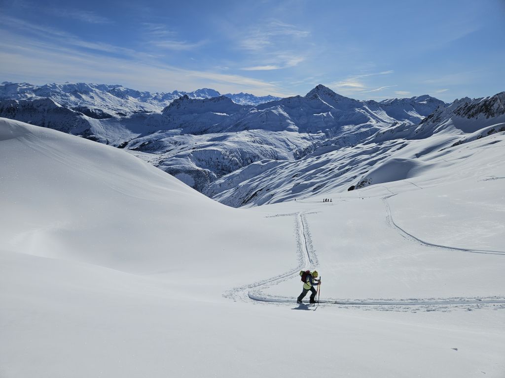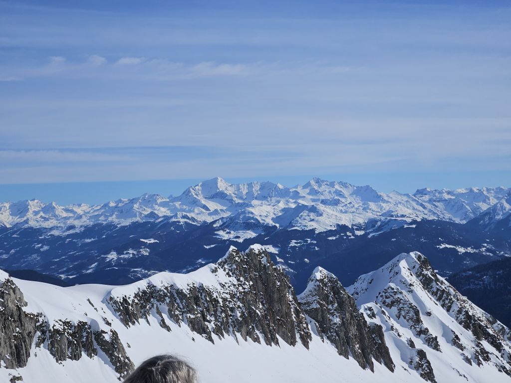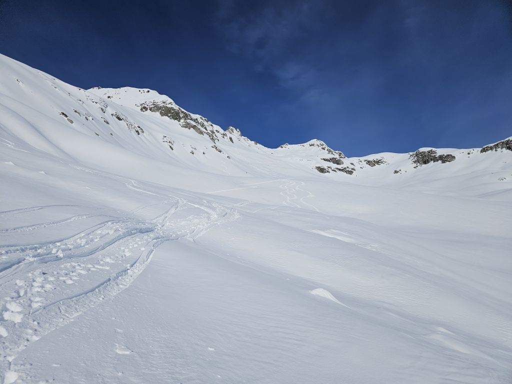 Nous étions 9 ce dimanche 1er février au départ de Celliers Dessus. Le thermomètre était à peine en dessous de zéro et le ciel légèrement nuageux. A l’arrivée en vue de la combe des Plans les contreforts enneigés du Grand Château commencent à se détacher sur un ciel qui vire au bleu. Nous ne sommes pas les seuls dans ce paysage recouvert d’une bonne couche de neige fraîche. Heureusement la trace de montée est déjà faite, il n’est pas facile d’en sortir pour doubler les groupes plus lents. Le ciel est définitivement bleu et la chaleur se fait sentir par moment. Nous progressons à un rythme régulier avec quelques pauses pour arriver au col juste avant 12h30. Nous avons bien profité du soleil et du panorama pour manger avant qu’un petit vent ne se lève et le ciel se voile légèrement. Nous commençons alors une descente où tout le monde peut faire sa trace dans une neige bien préservée et encore poudreuse suivant l’exposition.