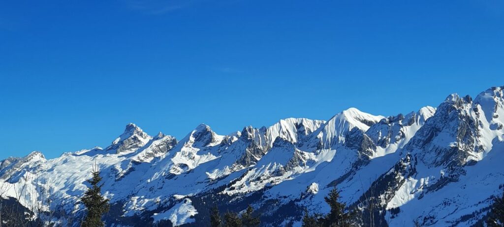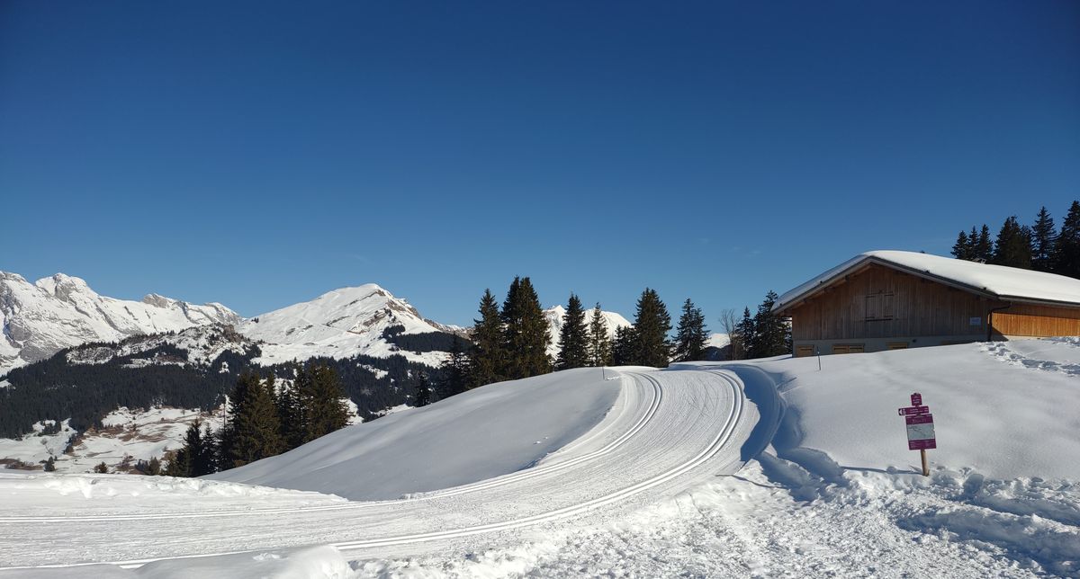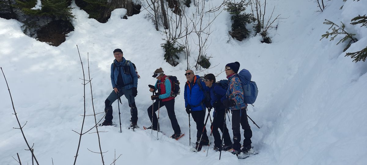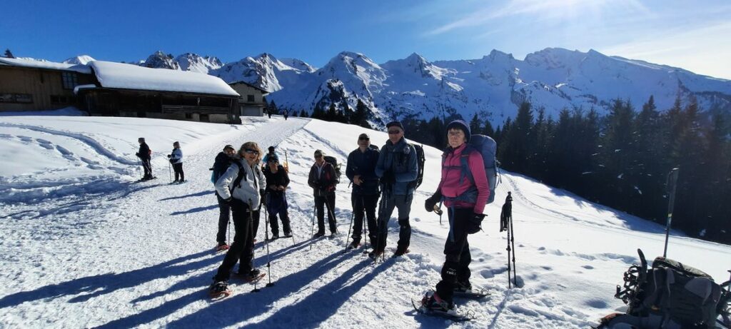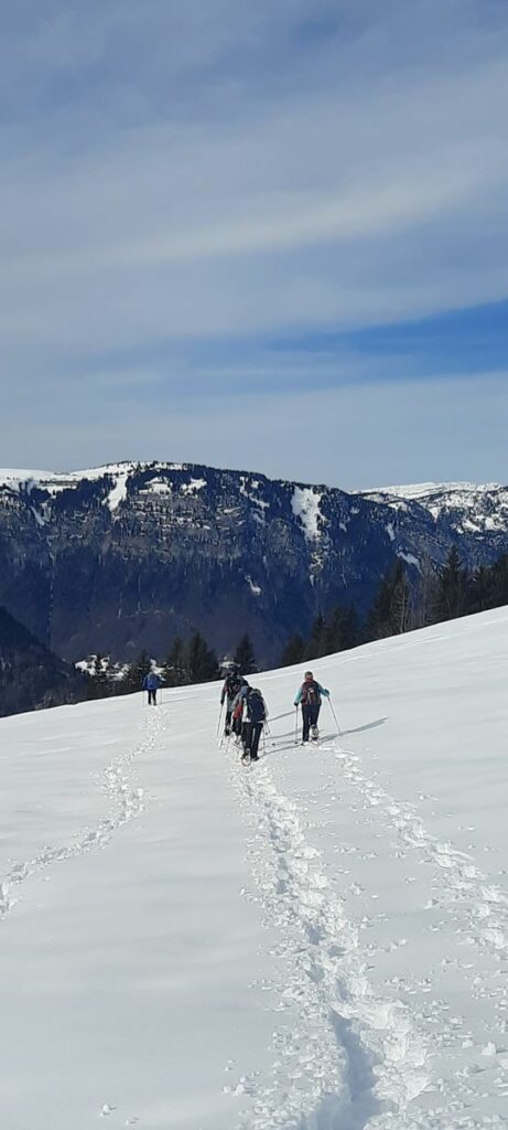 Jeudi 5 février, nous sommes partis du parking de la Source au Grand Bornand vers 9h15. Nous avons suivi jusqu’au sommet un fléchage spécial raquettes N°32, qui nous a permis d’éviter les pistes de ski de fond.