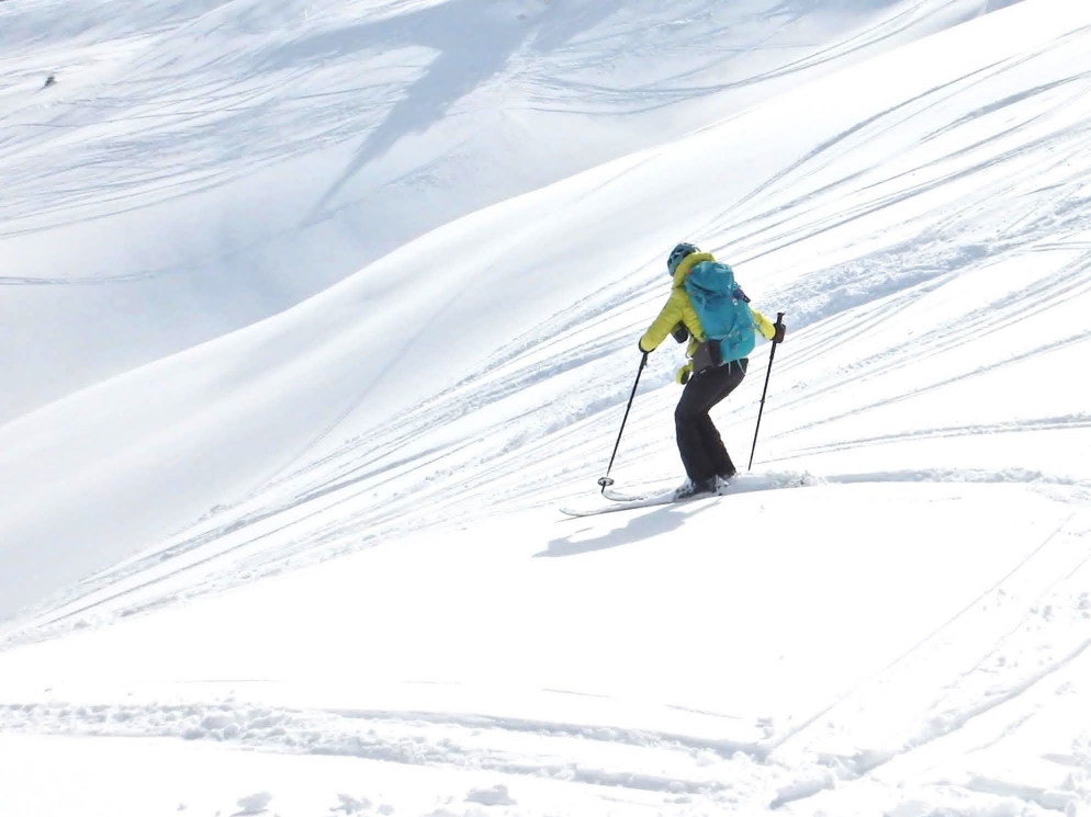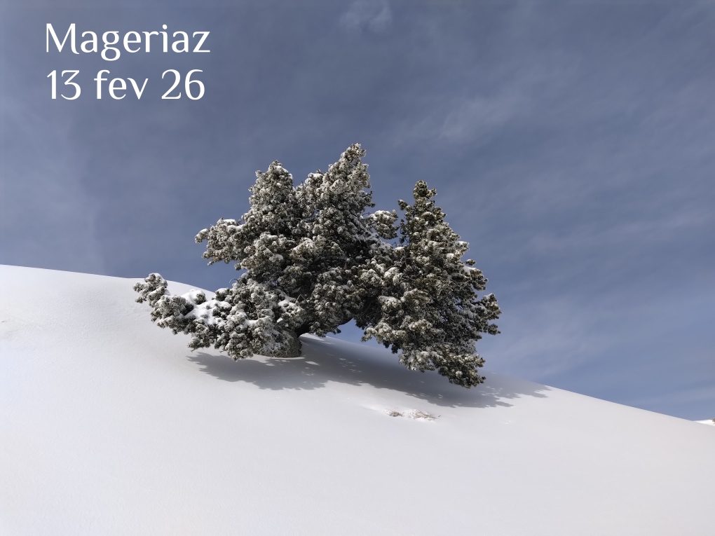 Ce vendredi 13 février, nous revoilà dans le beau temps sur une Margériaz refaite à neuf après les chutes de neige soutenues des jours précédents. Il fallait trouver un but de sortie pas trop loin compatible avec un BERA 4, cette montagne s’imposait comme une évidence (compatible ne veut pas dire sans aucun risque, en cherchant bien on trouve des pentes de plus de 30° sur cette montagne).