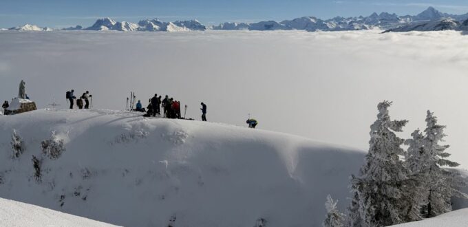 Nous chaussons les skis à 1040m au parking (le BERA indiquait limite skiable à 1200m). Nous commençons à monter sur une neige très dure. Quand la pente se redresse les couteaux sont mis pour quelques minutes. La montée se déroule sur une trace déjà faite, dans le brouillard puis sous un ciel couvert. Il y a un peu de monde. Nous arrivons au sommet au-dessus d’une mer de nuage qui s’étend à perte de vue. Le massif du Bargy est caché par la brume.