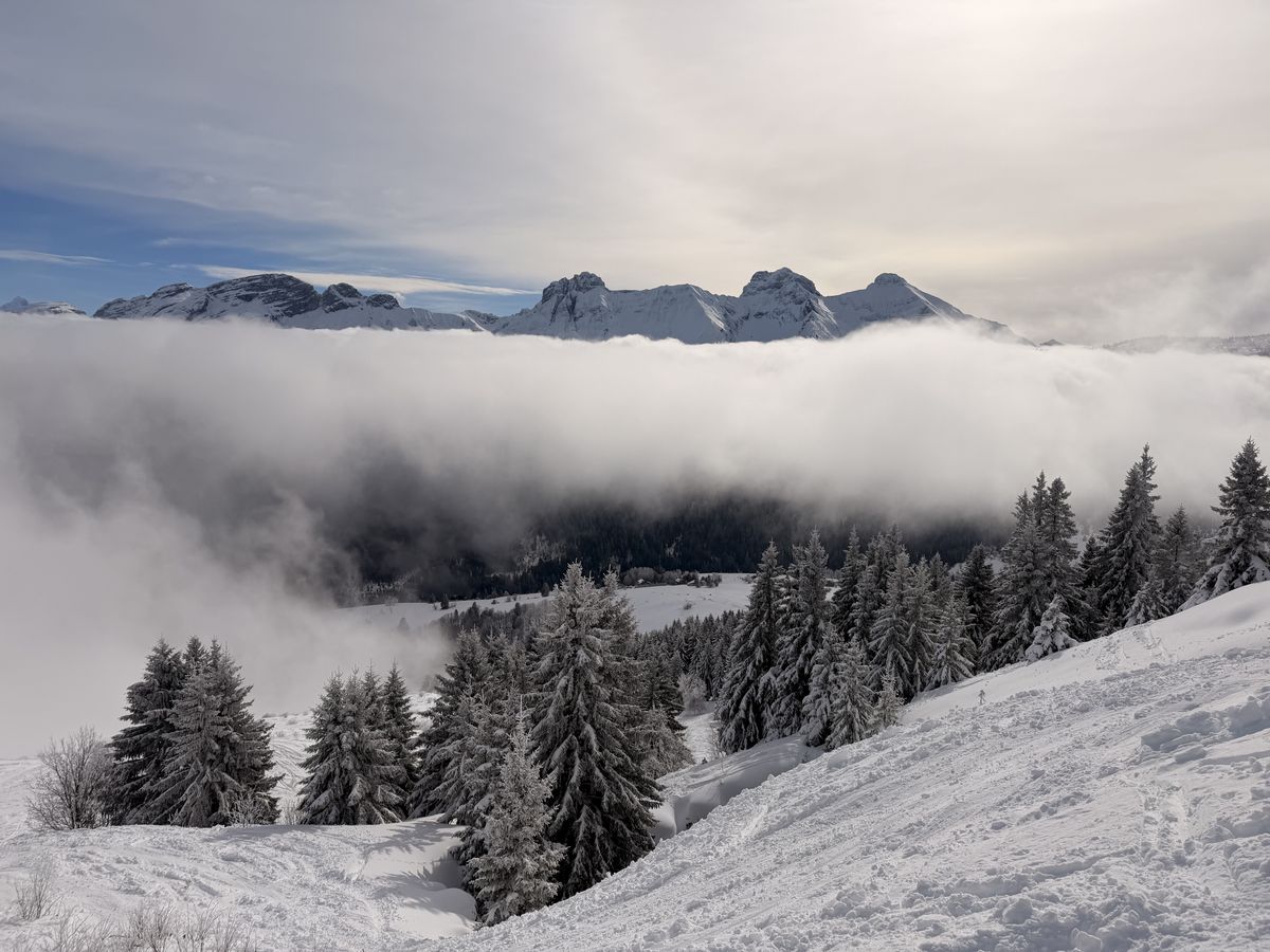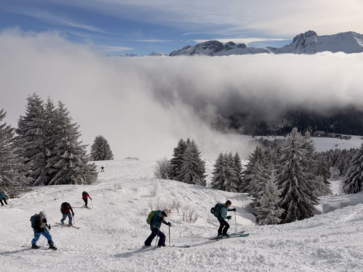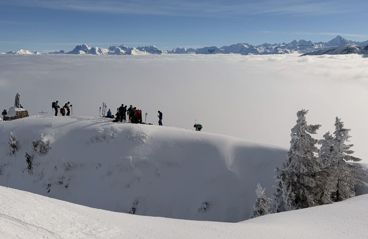Nous chaussons les skis à 1040m au parking (le BERA indiquait limite skiable à 1200m). Nous commençons à monter sur une neige très dure. Quand la pente se redresse les couteaux sont mis pour quelques minutes. La montée se déroule sur une trace déjà faite, dans le brouillard puis sous un ciel couvert. Il y a un peu de monde. Nous arrivons au sommet au-dessus d’une mer de nuage qui s’étend à perte de vue. Le massif du Bargy est caché par la brume.