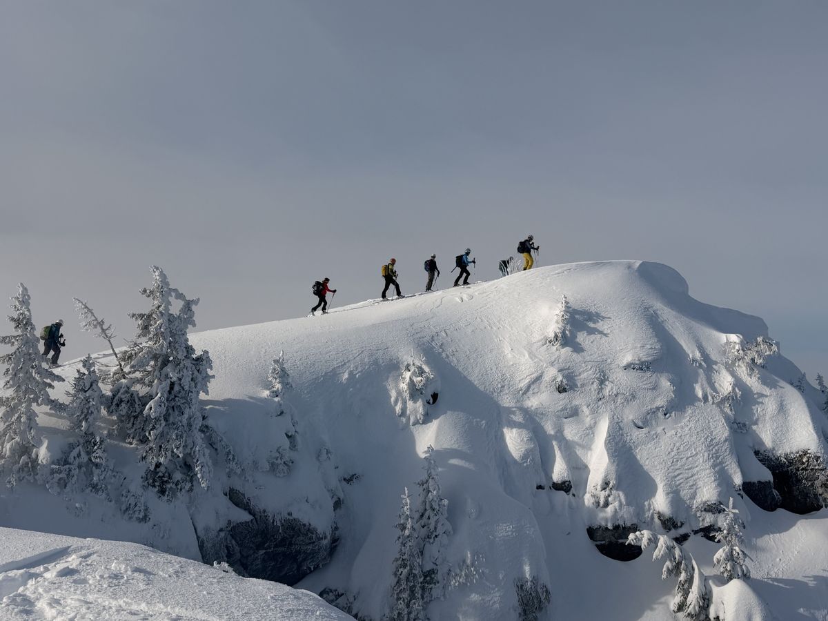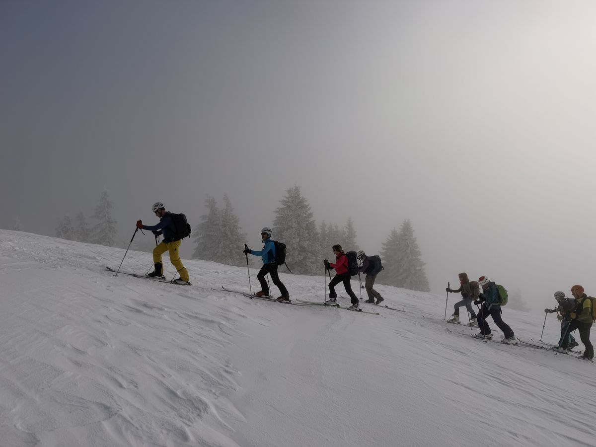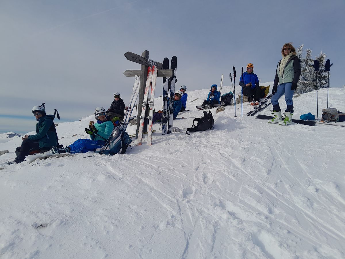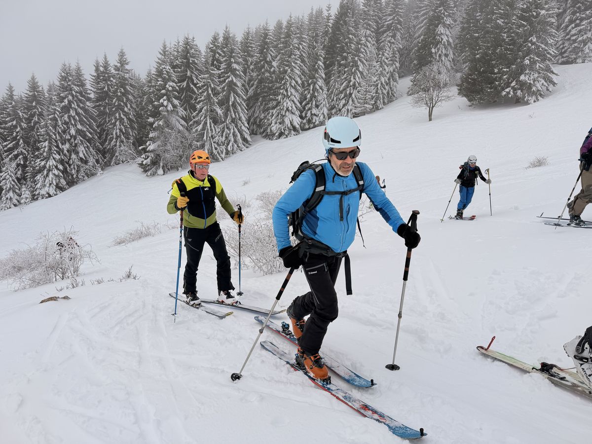 Attention pièges vers 1400m : je me prends un fil de clôture traînant au ras de la surface de la neige, ce qui me vaut une chute sans conséquence. Dénivelée totale : 1120 m. Belle journée au final pour 9 participants