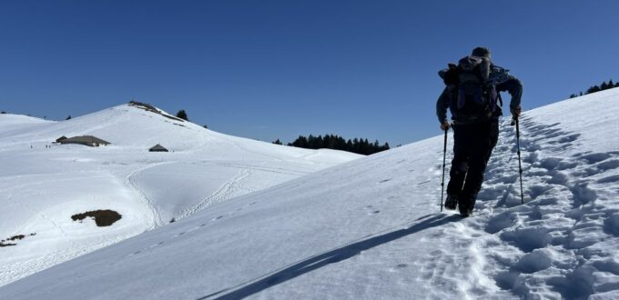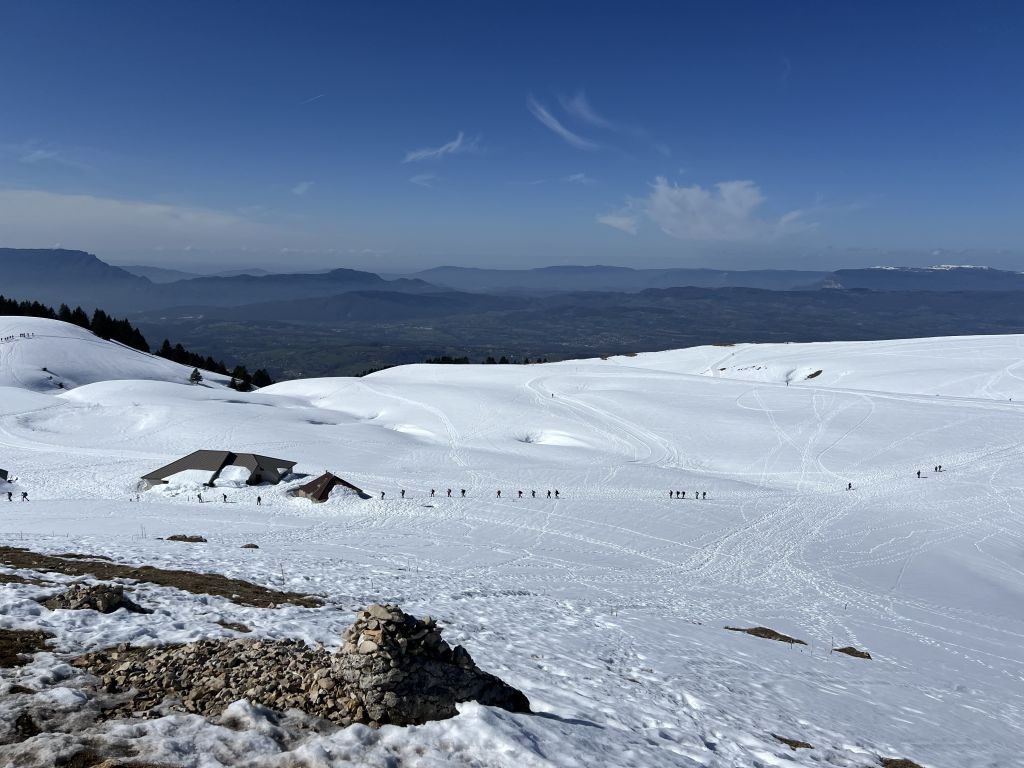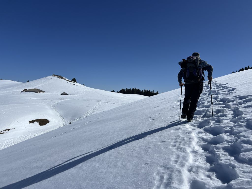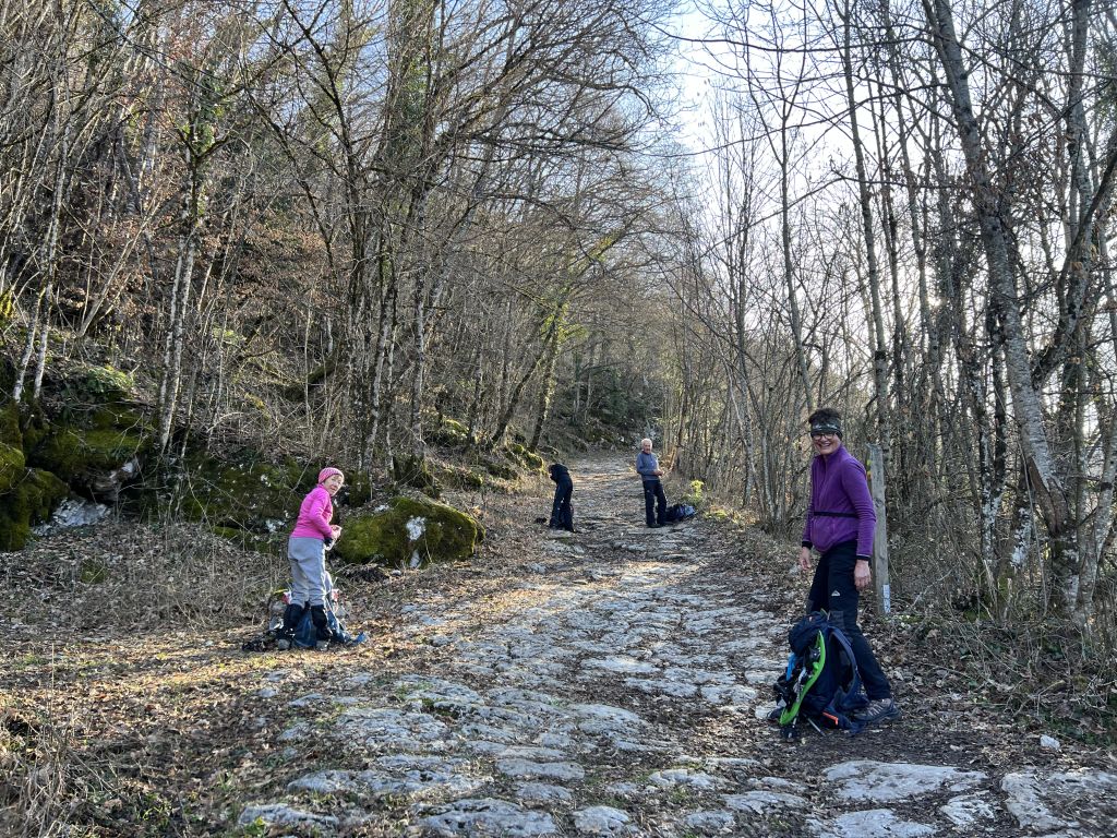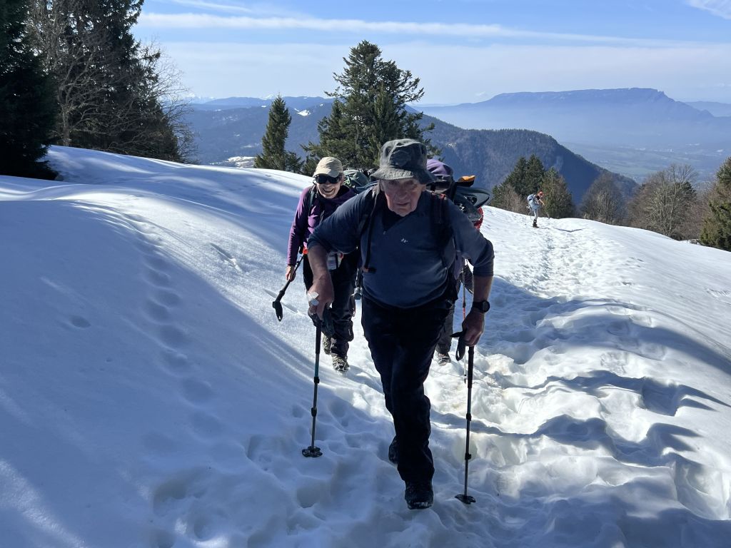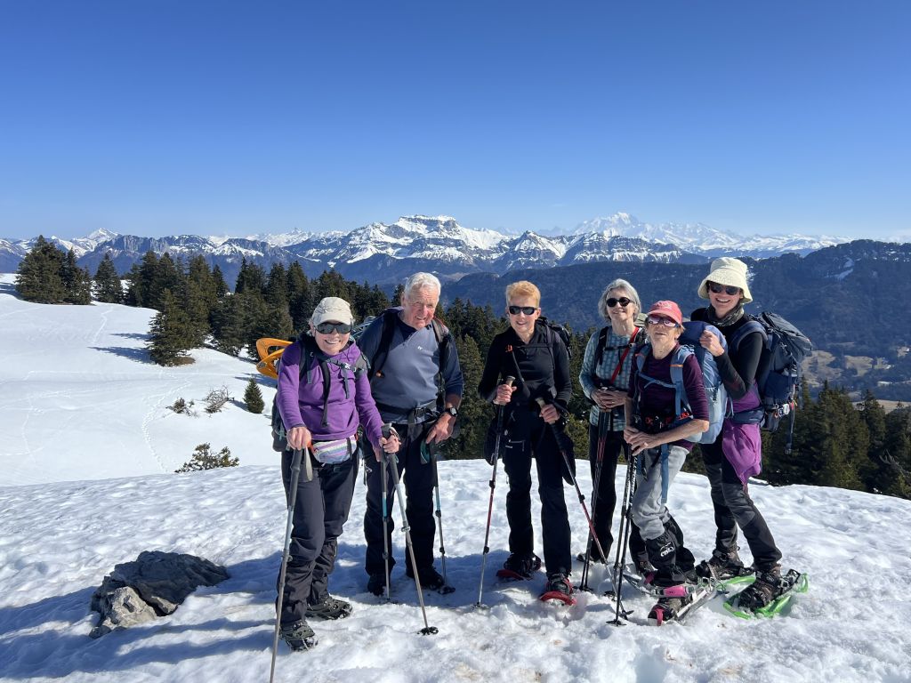 Nous sommes partis le mardi 3 Mars à 8 h 30 du village d’Allèves, par la voie romaine jusqu’à la Figia où il y a une magnifique chapelle. Le sentier continue ensuite dans les bois. A la sortie du bois certaines personnes mettent soit les raquettes soit les crampons pour finir les derniers 150 m+ jusqu’au crêt de l’Aigle où nous avons déjeuné face au Mont Blanc, il y a beaucoup de monde sur le plateau. Le retour se fait par le même sentier jusqu’au Grange des Garennes. De là nous avons pris la direction des tours Saint Jacques et le Parking.