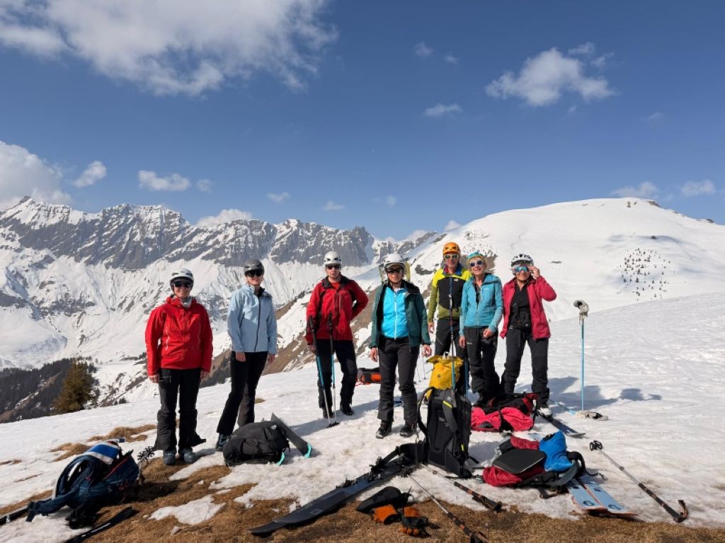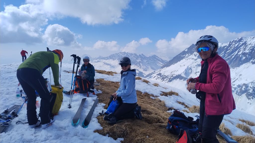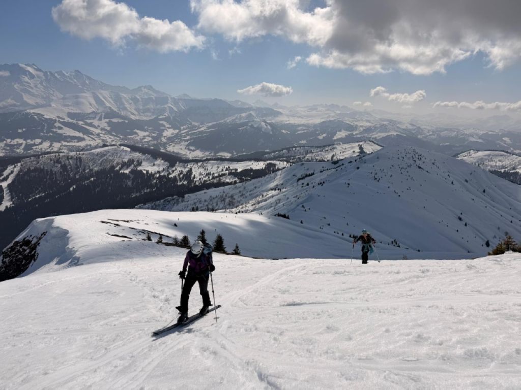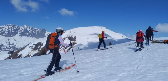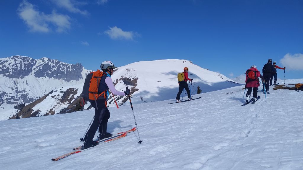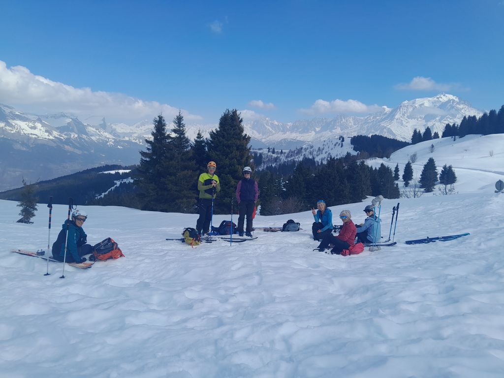 A partir du Petit Croisse Baulet, dépeautage pour descendre sur le col de l’Avenaz, repeautage pour monter au Croisse Baulet où une courte pause casse-croûte est la bienvenue. Dépeautage pour descendre sur le col de l’Avenaz, repeautage pour remonter au petit Croisse Baulet, dépeautage pour descendre sur le col de Jaillet où une nouvelle pause de fin de casse-croûte s’impose et…repeautage pour monter au Christomet (avec deux petites descentes intermédiaires en peaux). Dépeautage final pour descendre la piste bleue qui nous ramène en 4,5 kms au Plan où nous prenons un pot bien mérité.