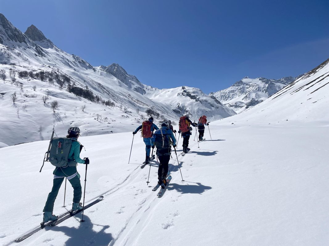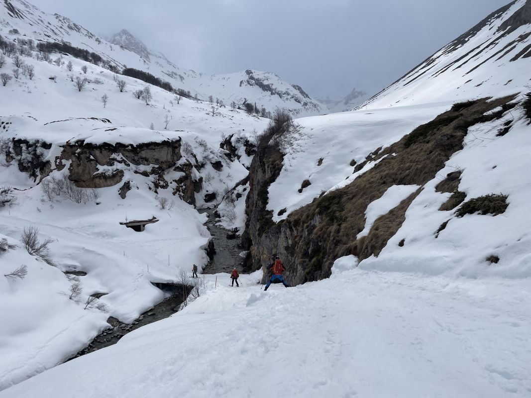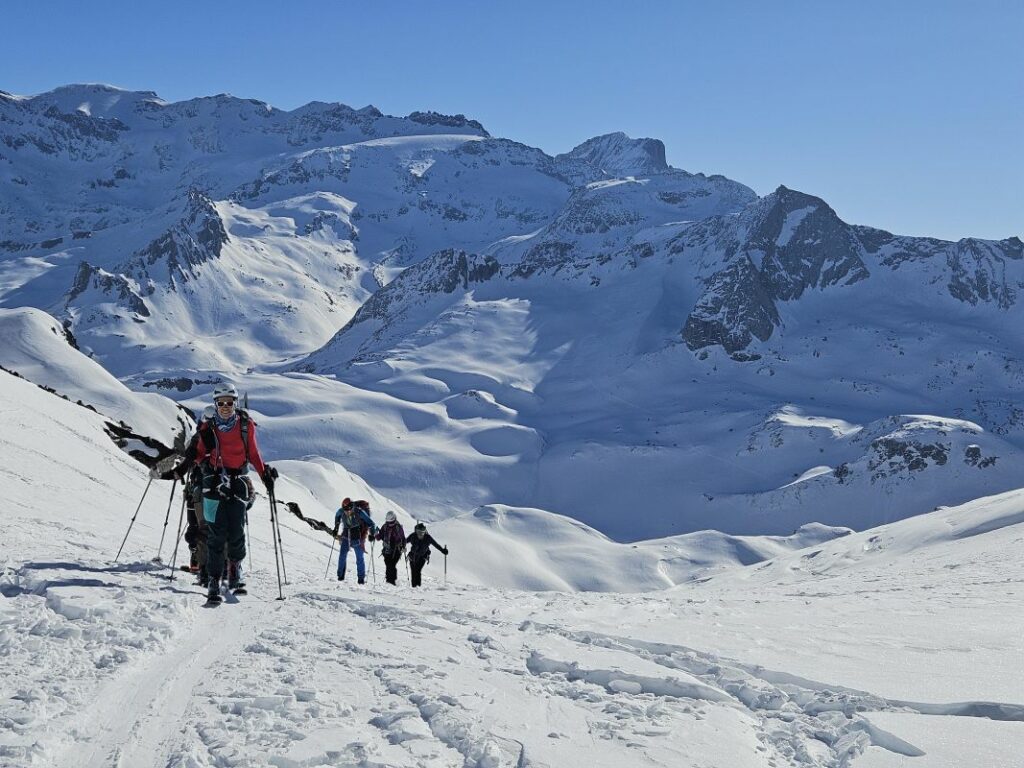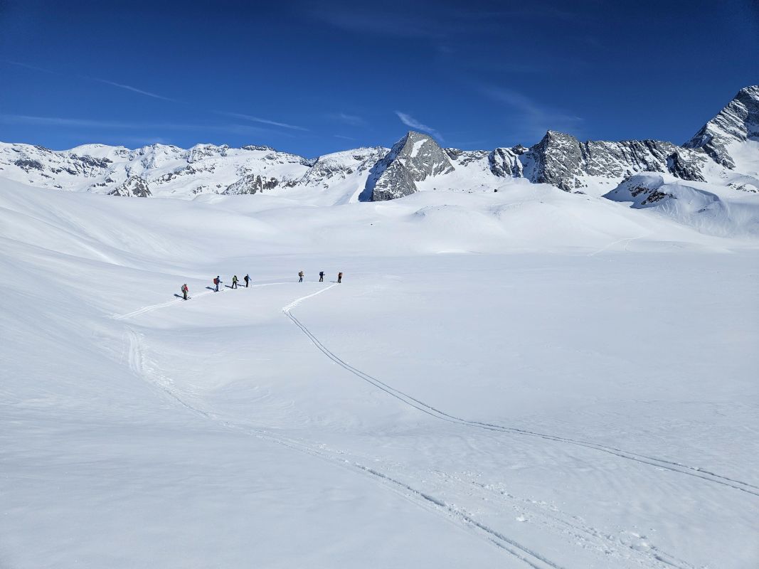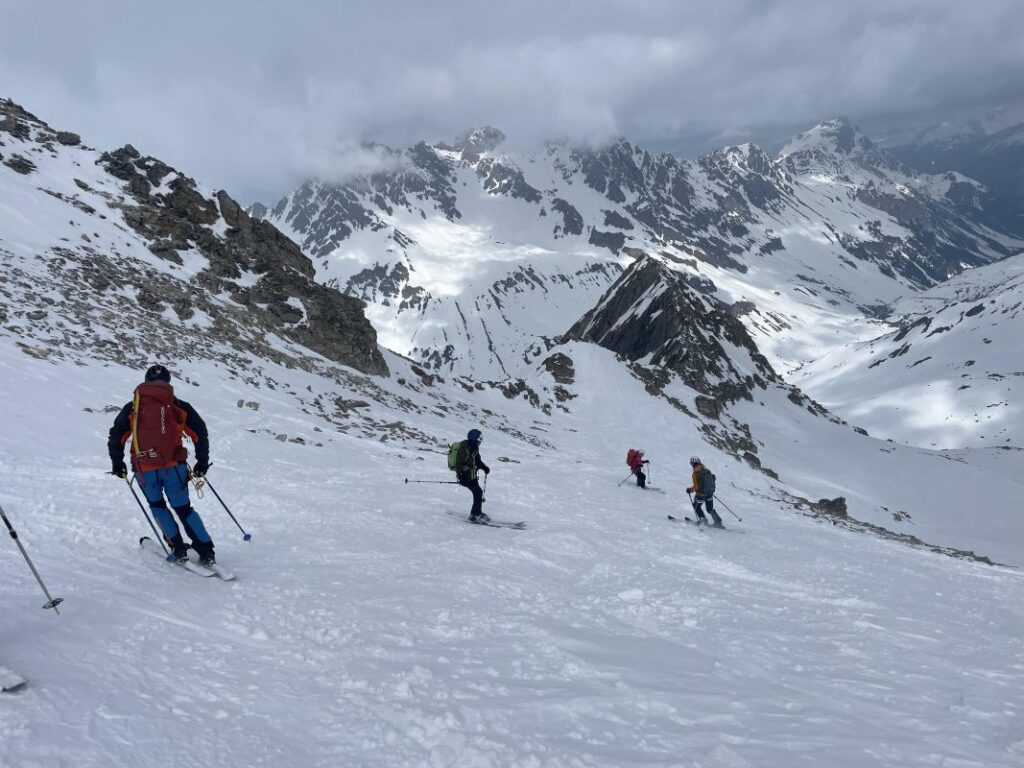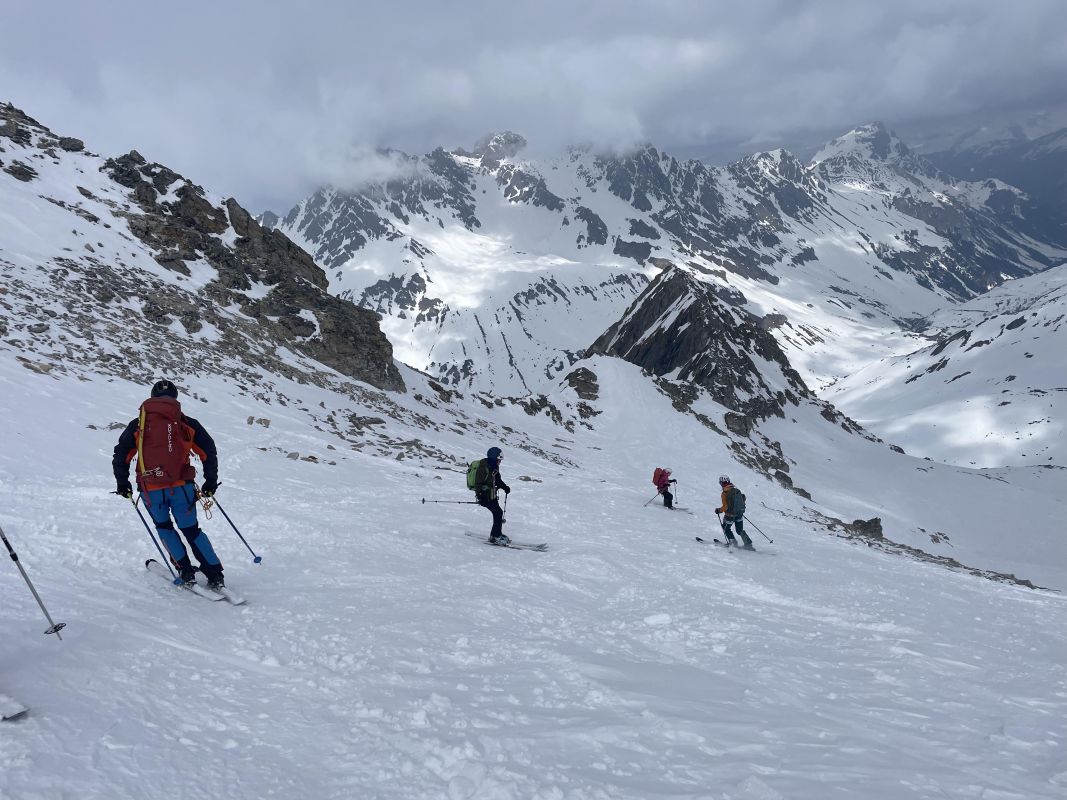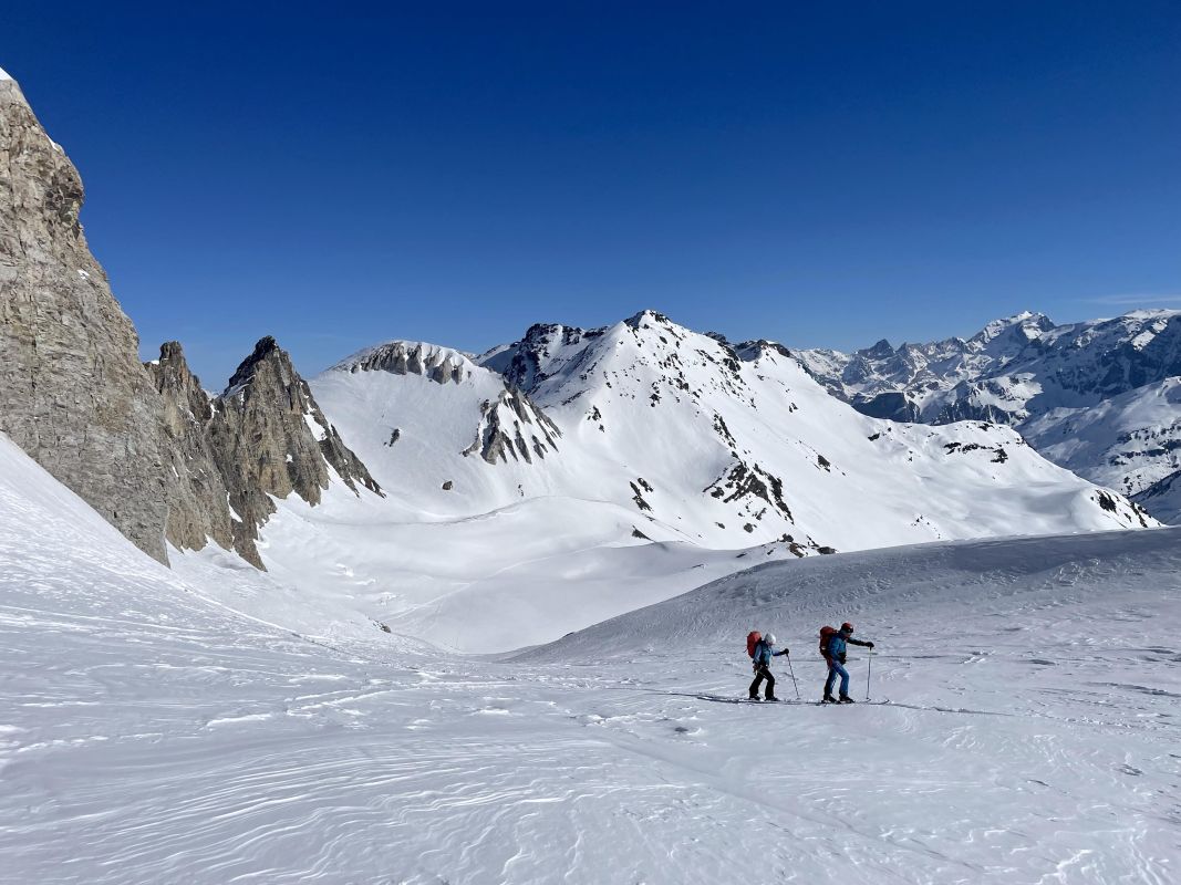 Le 3eme jour, retour sur Pralognan par la brèche de la Croix de la Rue, qui se gravit en piolet crampon et donne accès au versant Maurienne. Au col d’Aussois nous entamons la descente vers Ritord. Un aigle royal nous gratifie de sa visite.